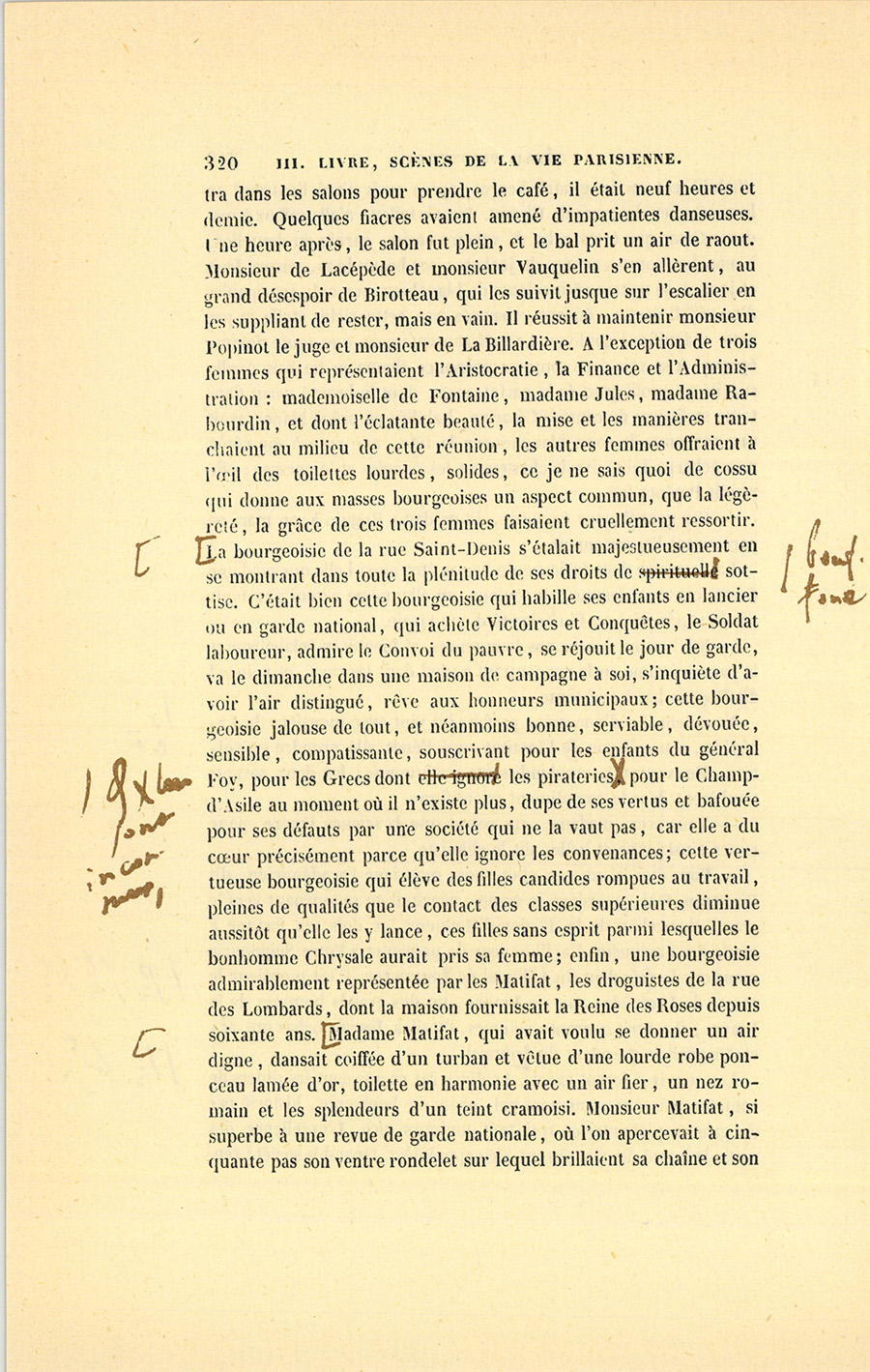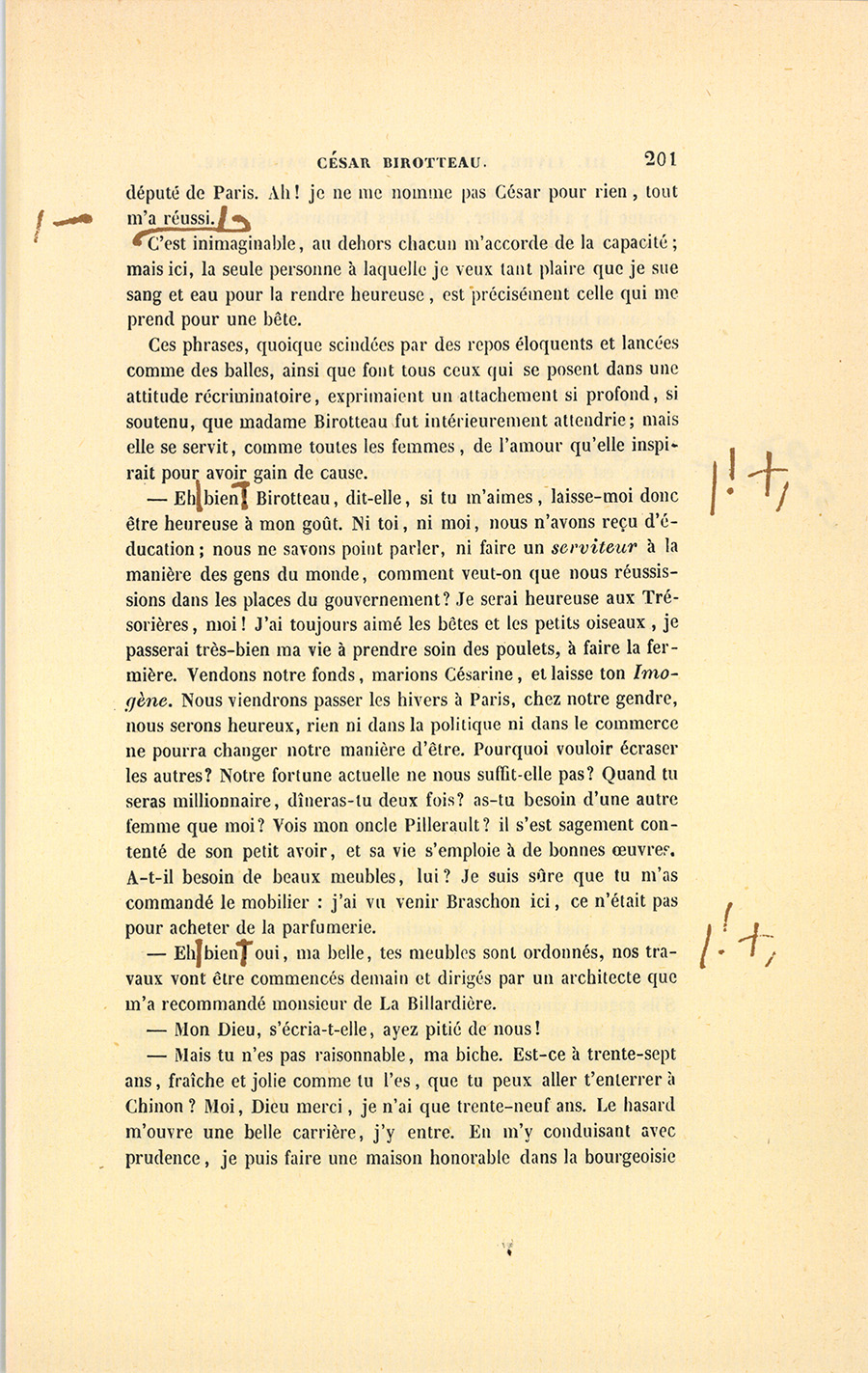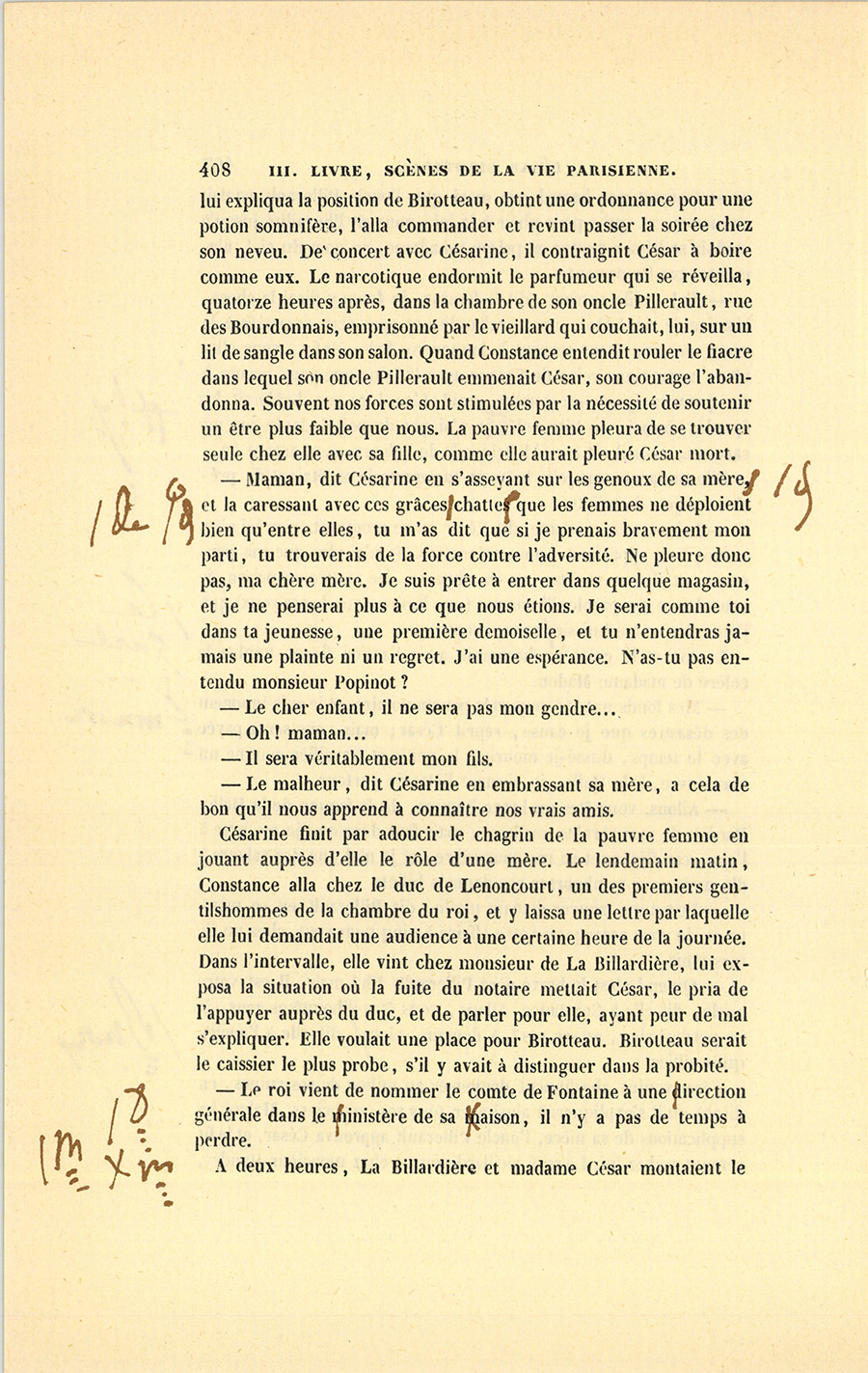 – Mais tu n’es pas raisonnable, ma biche. Est-ce à trente-sept ans, fraîche et jolie comme tu l’es, que tu peux aller t’enterrer à Chinon ? Moi, Dieu merci, je n’ai que trente-neuf ans. Le hasard m’ouvre une belle carrière, j’y entre. En m’y conduisant avec prudence, je puis faire une maison honorable dans la bourgeoisie {p. 202} de Paris, comme cela se pratiquait jadis, fonder les Birotteau, comme il y a des Keller, des Jules Desmarets, des Roguin, des Cochin, des Guillaume, des Lebas, des Nucingen, des Saillard, des Popinot, des Matifat qui marquent ou qui ont marqué dans leurs quartiers. Allons donc ! Si cette affaire-là n’était pas sûre comme de l’or en barres…