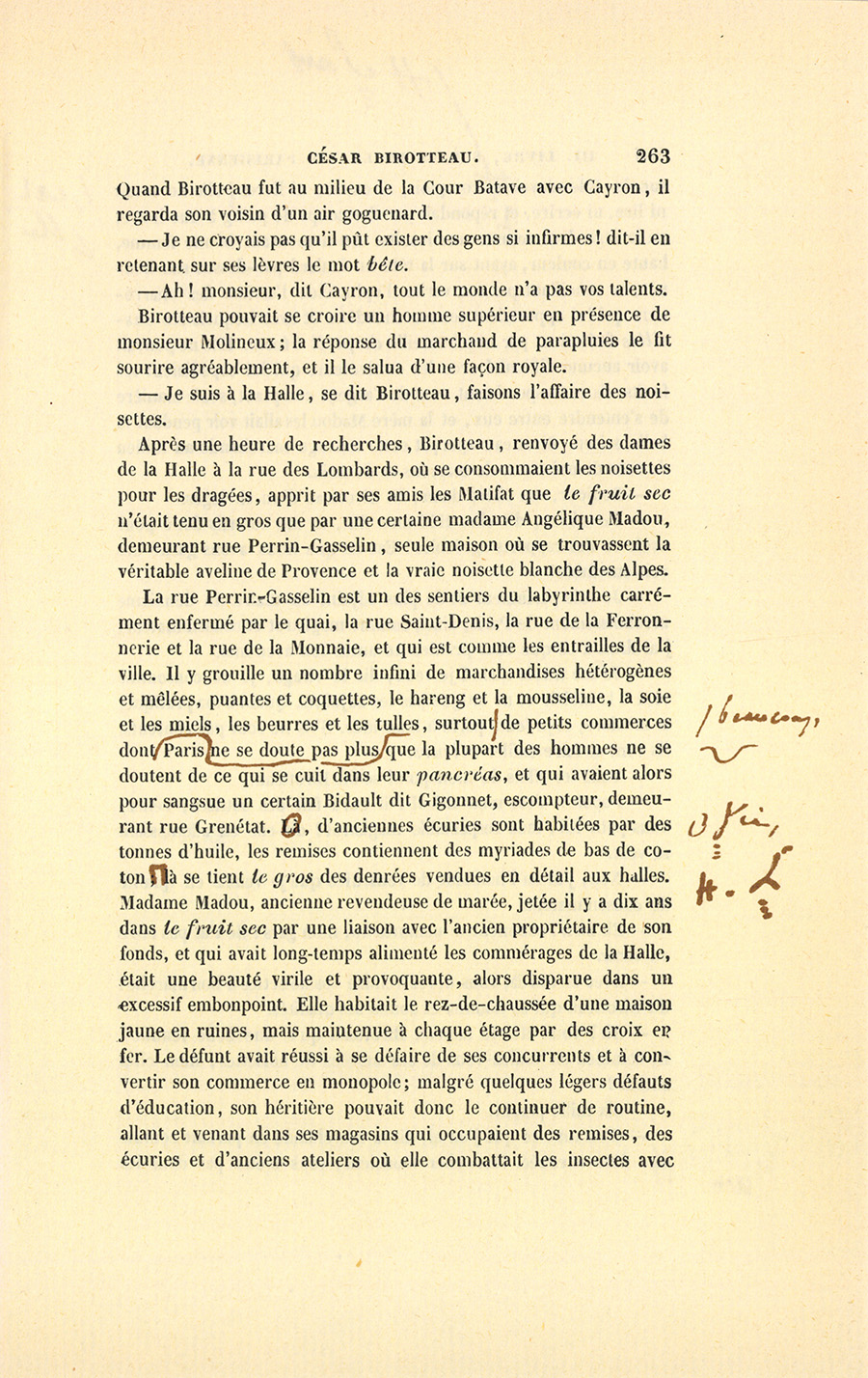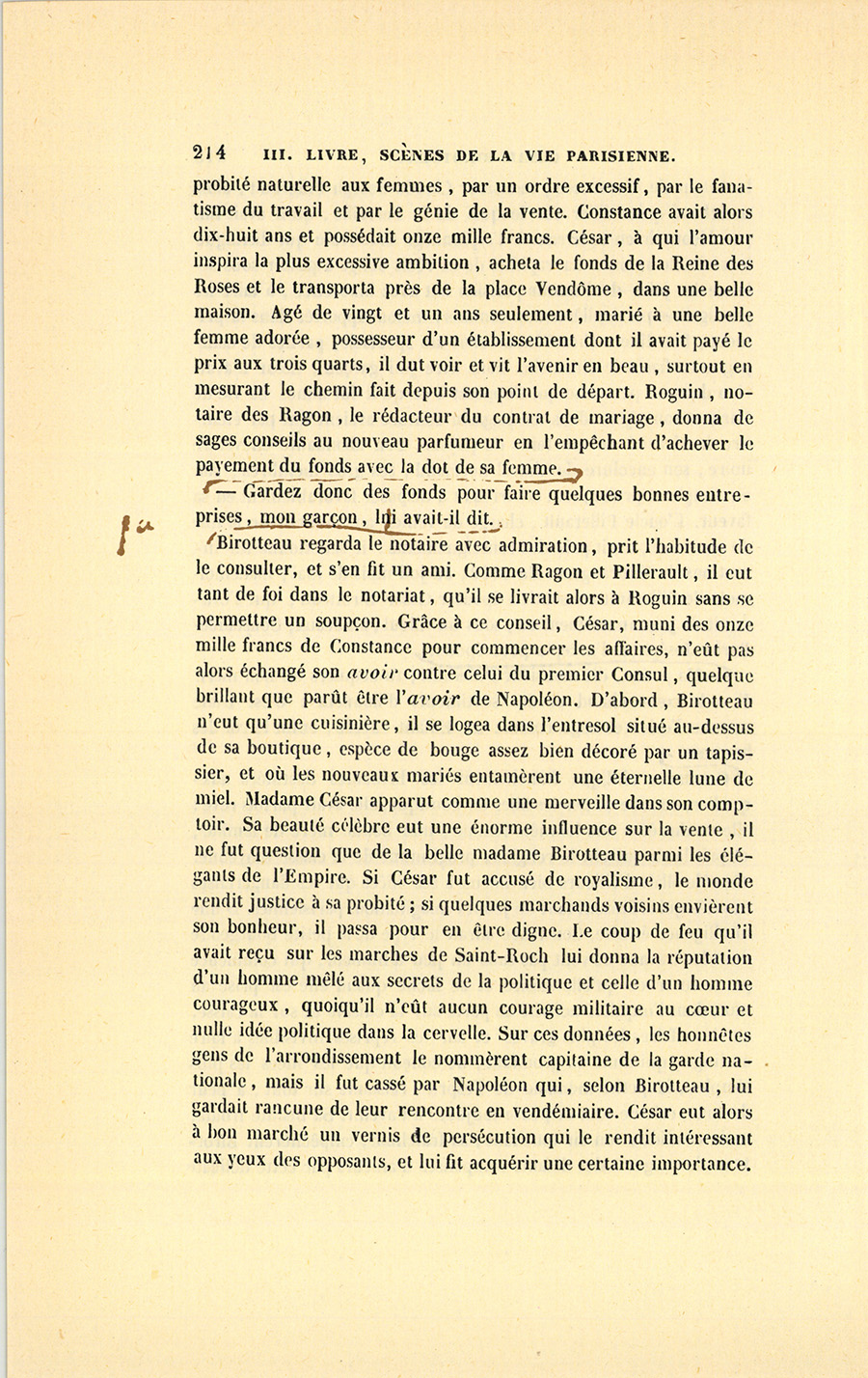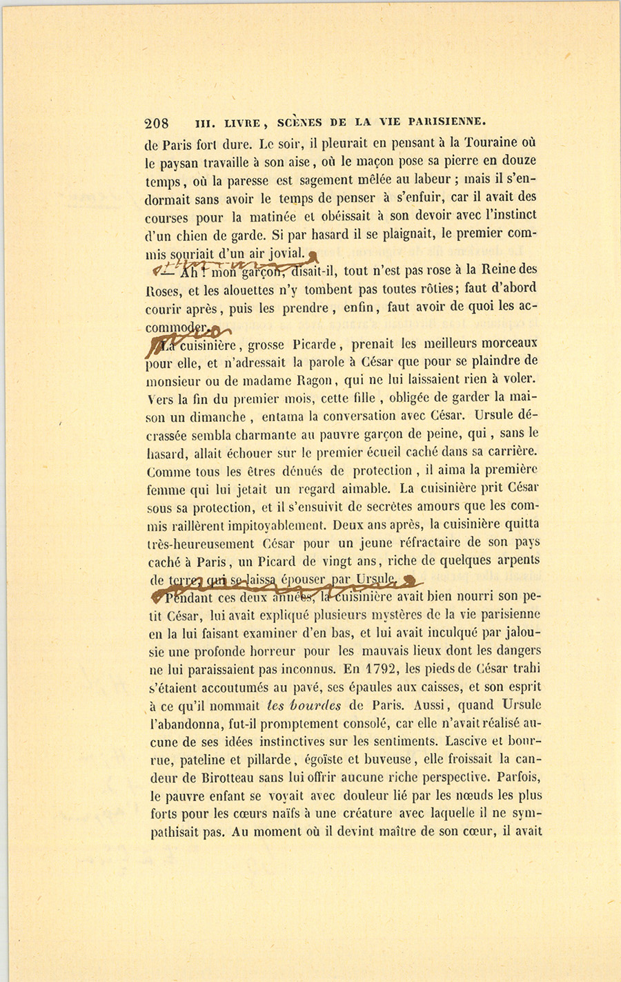 Pendant ces deux années, la cuisinière avait bien nourri son petit César, lui avait expliqué plusieurs mystères de la vie parisienne en la lui faisant examiner d’en bas, et lui avait inculqué par jalousie une profonde horreur pour les mauvais lieux dont les dangers ne lui paraissaient pas inconnus. En 1792, les pieds de César trahi s’étaient accoutumés au pavé, ses épaules aux caisses, et son esprit à ce qu’il nommait les bourdes de Paris. Aussi, quand Ursule l’abandonna, fut-il promptement consolé, car elle n’avait réalisé aucune de ses idées instinctives sur les sentiments. Lascive et bourrue, pateline et pillarde, égoïste et buveuse, elle froissait la candeur de Birotteau sans lui offrir aucune riche perspective. Parfois, le pauvre enfant se voyait avec douleur lié par les nœuds les plus forts pour les cœurs naïfs à une créature avec laquelle il ne sympathisait pas. Au moment où il devint maître de son cœur, il avait {p. 209} grandi et atteint l’âge de seize ans. Son esprit, développé par Ursule et par les plaisanteries des commis, lui fit étudier le commerce d’un regard où l’intelligence se cachait sous la simplesse : il observa les chalands, demanda dans les moments perdus des explications sur les marchandises dont il retint les diversités et les places ; il connut un beau jour les articles, les prix et les chiffres mieux que ne les connaissaient les nouveaux venus ; monsieur et madame Ragon s’habituèrent dès lors à l’employer.