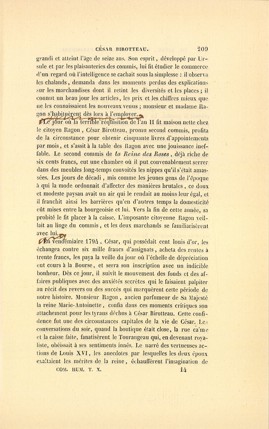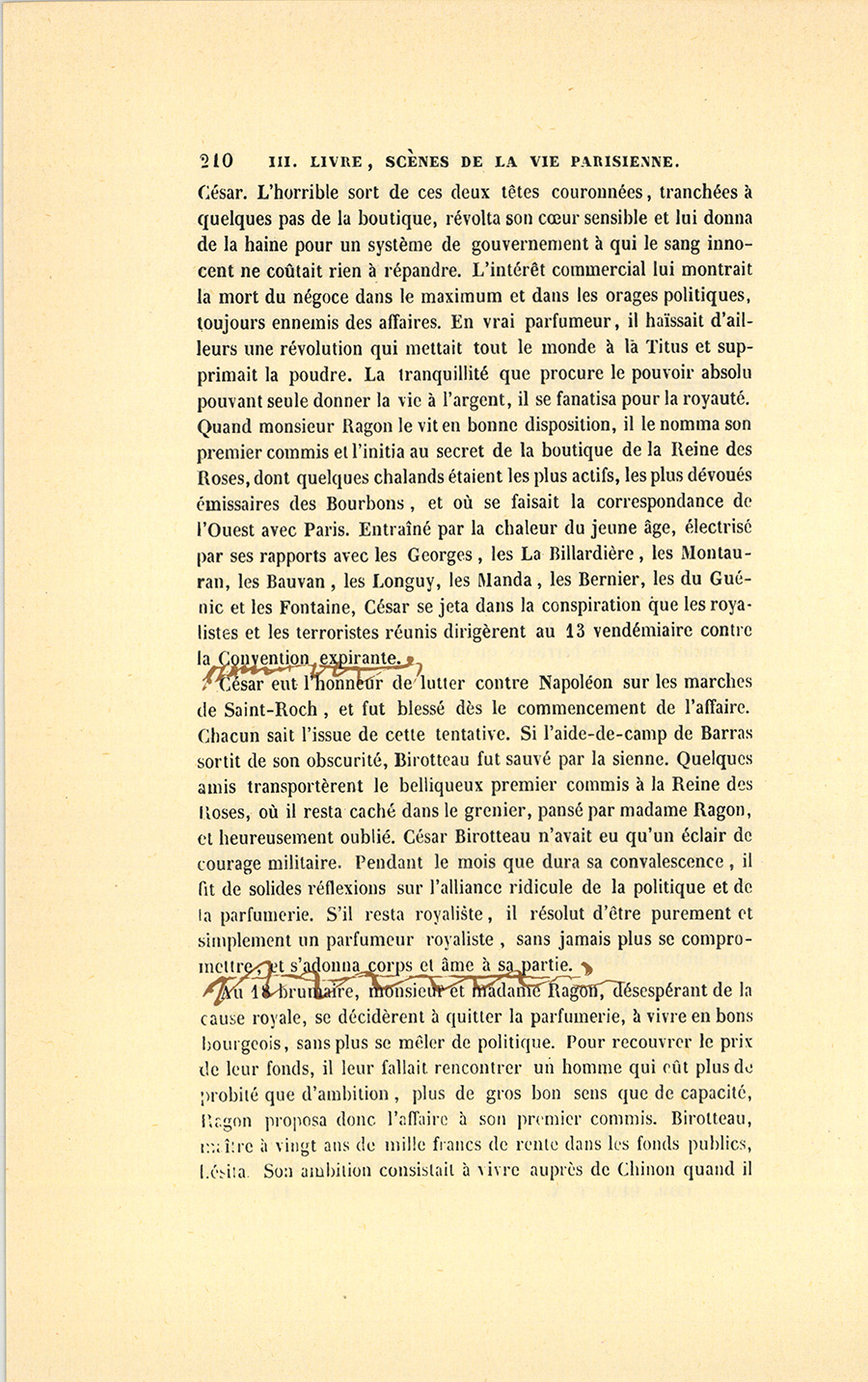 En vendémiaire 1794, César, qui possédait cent louis d’or, les échangea contre six mille francs d’assignats, acheta des rentes à trente francs, les paya la veille du jour où l’échelle de dépréciation eut cours à la Bourse, et serra son inscription avec un indicible bonheur. Dès ce jour, il suivit le mouvement des fonds et des affaires publiques avec des anxiétés secrètes qui le faisaient palpiter au récit des revers ou des succès qui marquèrent cette période de notre histoire. Monsieur Ragon, ancien parfumeur de Sa Majesté la reine Marie-Antoinette, confia dans ces moments critiques son attachement pour les tyrans déchus à César Birotteau. Cette confidence fut une des circonstances capitales de la vie de César. Les conversations du soir, quand la boutique était close, la rue calme et la caisse faite, fanatisèrent le Tourangeau qui, en devenant royaliste, obéissait à ses sentiments innés. Le narré des vertueuses actions de Louis XVI, les anecdotes par lesquelles les deux époux exaltaient les mérites de la reine, échauffèrent l’imagination de {p. 210} César. L’horrible sort de ces deux têtes couronnées, tranchées à quelques pas de la boutique, révolta son cœur sensible et lui donna de la haine pour un système de gouvernement à qui le sang innocent ne coûtait rien à répandre. L’intérêt commercial lui montrait la mort du négoce dans le maximum et dans les orages politiques, toujours ennemis des affaires. En vrai parfumeur, il haïssait d’ailleurs une révolution qui mettait tout le monde à la Titus et supprimait la poudre. La tranquillité que procure le pouvoir absolu pouvant seule donner la vie à l’argent, il se fanatisa pour la royauté. Quand monsieur Ragon le vit en bonne disposition, il le nomma son premier commis et l’initia au secret de la boutique de la Reine des Roses, dont quelques chalands étaient les plus actifs, les plus dévoués émissaires des Bourbons, et où se faisait la correspondance de l’Ouest avec Paris. Entraîné par la chaleur du jeune âge, électrisé par ses rapports avec les Georges, les La Billardière, les Montauran, les Bauvan, les Longuy, les Manda, les Bernier, les du Guénic et les Fontaine, César se jeta dans la conspiration que les royalistes et les terroristes réunis dirigèrent au 13 vendémiaire contre la Convention expirante.