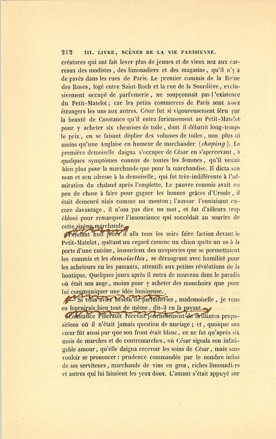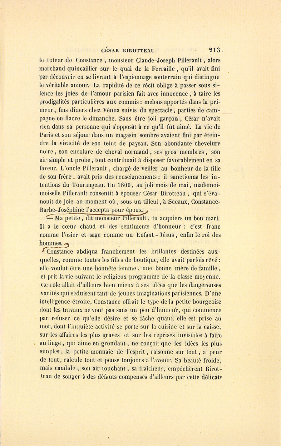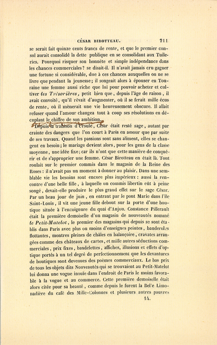 Depuis la trahison d’Ursule, César était resté sage, autant par crainte des dangers que l’on court à Paris en amour que par suite de ses travaux. Quand les passions sont sans aliment, elles se changent en besoin ; le mariage devient alors, pour les gens de la classe moyenne, une idée fixe ; car ils n’ont que cette manière de conquérir et de s’approprier une femme. César Birotteau en était là. Tout roulait sur le premier commis dans le magasin de la Reine des Roses : il n’avait pas un moment à donner au plaisir. Dans une semblable vie les besoins sont encore plus impérieux : aussi la rencontre d’une belle fille, à laquelle un commis libertin eût à peine songé, devait-elle produire le plus grand effet sur le sage César. Par un beau jour de juin, en entrant par le pont Marie dans l’île Saint-Louis, il vit une jeune fille debout sur la porte d’une boutique située à l’encoignure du quai d’Anjou. Constance Pillerault était la première demoiselle d’un magasin de nouveautés nommé le Petit-Matelot, le premier des magasins qui depuis se sont établis dans Paris avec plus ou moins d’enseignes peintes, banderoles flottantes, montres pleines de châles en balançoire, cravates arrangées comme des châteaux de cartes, et mille autres séductions commerciales, prix fixes, bandelettes, affiches, illusions et effets d’optique portés à un tel degré de perfectionnement que les devantures de boutiques sont devenues des poèmes commerciaux. Le bas prix de tous les objets dits Nouveautés qui se trouvaient au Petit-Matelot lui donna une vogue inouïe dans l’endroit de Paris le moins favorable à la vogue et au commerce. Cette première demoiselle était alors citée pour sa beauté, comme depuis le furent la Belle Limonadière du café des Mille-Colonnes et plusieurs autres pauvres {p. 212} créatures qui ont fait lever plus de jeunes et de vieux nez aux carreaux des modistes, des limonadiers et des magasins, qu’il n’y a de pavés dans les rues de Paris. Le premier commis de la Reine des Roses, logé entre Saint-Roch et la rue de la Sourdière, exclusivement occupé de parfumerie, ne soupçonnait pas l’existence du Petit-Matelot ; car les petits commerces de Paris sont assez étrangers les uns aux autres. César fut si vigoureusement féru par la beauté de Constance qu’il entra furieusement au Petit-Matelot pour y acheter six chemises de toile, dont il débattit long-temps le prix, en se faisant déplier des volumes de toiles, non plus ni moins qu’une Anglaise en humeur de marchander (shoping). La première demoiselle daigna s’occuper de César en s’apercevant, à quelques symptômes connus de toutes les femmes, qu’il venait bien plus pour la marchande que pour la marchandise. Il dicta son nom et son adresse à la demoiselle, qui fut très indifférente à l’admiration du chaland après l’emplette. Le pauvre commis avait eu peu de chose à faire pour gagner les bonnes grâces d’Ursule, il était demeuré niais comme un mouton ; l’amour l’enniaisant encore davantage, il n’osa pas dire un mot, et fut d’ailleurs trop ébloui pour remarquer l’insouciance qui succédait au sourire de cette sirène marchande.