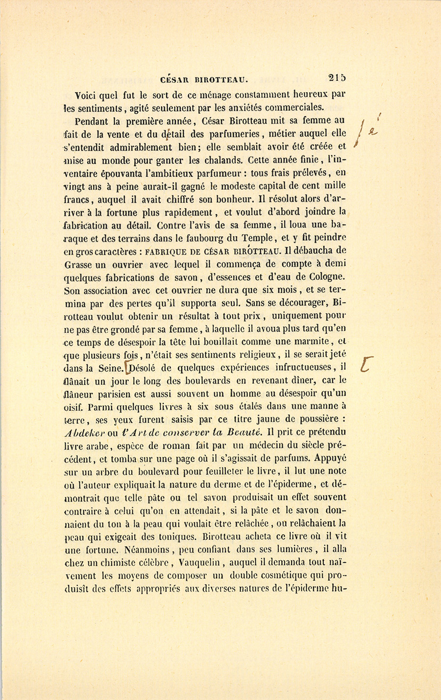 Désolé de quelques expériences infructueuses, il flânait un jour le long des boulevards en revenant dîner, car le flâneur parisien est aussi souvent un homme au désespoir qu’un oisif. Parmi quelques livres à six sous étalés dans une manne à terre, ses yeux furent saisis par ce titre jaune de poussière : Abdeker ou l’Art de conserver la Beauté. Il prit ce prétendu livre arabe, espèce de roman fait par un médecin du siècle précédent, et tomba sur une page où il s’agissait de parfums. Appuyé sur un arbre du boulevard pour feuilleter le livre, il lut une note où l’auteur expliquait la nature du derme et de l’épiderme, et démontrait que telle pâte ou tel savon produisait un effet souvent contraire à celui qu’on en attendait, si la pâte et le savon donnaient du ton à la peau qui voulait être relâchée, ou relâchaient la peau qui exigeait des toniques. Birotteau acheta ce livre où il vit une fortune. Néanmoins, peu confiant dans ses lumières, il alla chez un chimiste célèbre, Vauquelin, auquel il demanda tout naïvement les moyens de composer un double cosmétique qui produisît des effets appropriés aux diverses natures de l’épiderme {p. 216} humain. Les vrais savants, ces hommes si réellement grands en ce sens qu’ils n’obtiennent jamais de leur vivant le renom par lequel leurs immenses travaux inconnus devraient être payés, sont presque tous serviables et sourient aux pauvres d’esprit. Vauquelin protégea donc le parfumeur, lui permit de se dire l’inventeur d’une pâte pour blanchir les mains et dont il lui indiqua la composition. Birotteau appela ce cosmétique la Double Pâte des Sultanes. Afin de compléter l’œuvre, il appliqua le procédé de la pâte pour les mains à une eau pour le teint qu’il nomma l’Eau Carminative. Il imita dans sa partie le système du Petit-Matelot, il déploya, le premier d’entre les parfumeurs, ce luxe d’affiches, d’annonces et de moyens de publication que l’on nomme peut-être injustement charlatanisme.