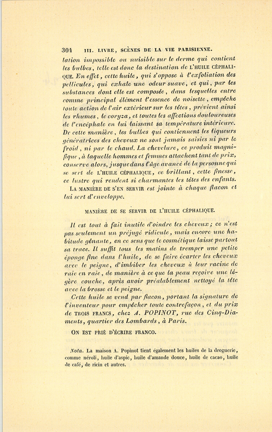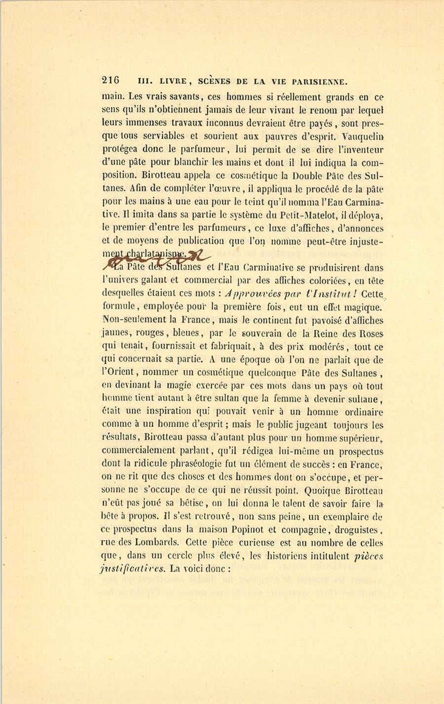 La Pâte des Sultanes et l’Eau Carminative se produisirent dans l’univers galant et commercial par des affiches coloriées, en tête desquelles étaient ces mots : Approuvées par l’Institut ! Cette formule, employée pour la première fois, eut un effet magique. Non-seulement la France, mais le continent fut pavoisé d’affiches jaunes, rouges, bleues, par le souverain de la Reine des Roses qui tenait, fournissait et fabriquait, à des prix modérés, tout ce qui concernait sa partie. À une époque où l’on ne parlait que de l’Orient, nommer un cosmétique quelconque Pâte des Sultanes, en devinant la magie exercée par ces mots dans un pays où tout homme tient autant à être sultan que la femme à devenir sultane, était une inspiration qui pouvait venir à un homme ordinaire comme à un homme d’esprit ; mais le public jugeant toujours les résultats, Birotteau passa d’autant plus pour un homme supérieur, commercialement parlant, qu’il rédigea lui-même un prospectus dont la ridicule phraséologie fut un élément de succès : en France, on ne rit que des choses et des hommes dont on s’occupe, et personne ne s’occupe de ce qui ne réussit point. Quoique Birotteau n’eût pas joué sa bêtise, on lui donna le talent de savoir faire la bête à propos. Il s’est retrouvé, non sans peine, un exemplaire de ce prospectus dans la maison Popinot et compagnie, droguistes, rue des Lombards. Cette pièce curieuse est au nombre de celles que, dans un cercle plus élevé, les historiens intitulent pièces justificatives. La voici donc :
