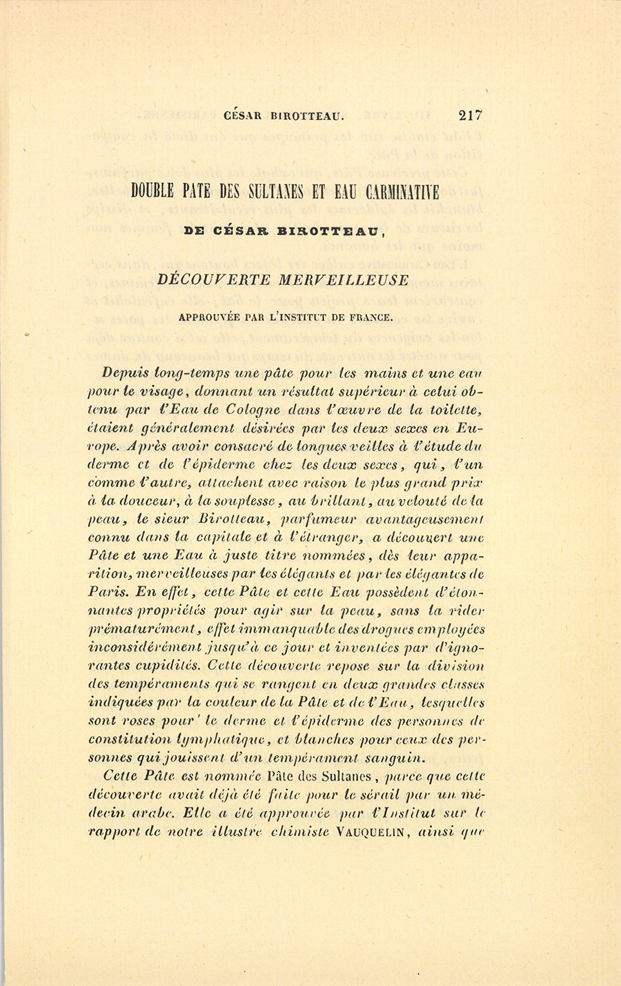 Cette Pâte est nommée Pâte des Sultanes, parce que cette découverte avait déjà été faite pour le sérail par un médecin arabe. Elle a été approuvée par l’Institut sur le rapport de notre illustre chimiste Vauquelin, ainsi que {p. 218} l’Eau établie sur les principes qui ont dicté la composition de la Pâte.