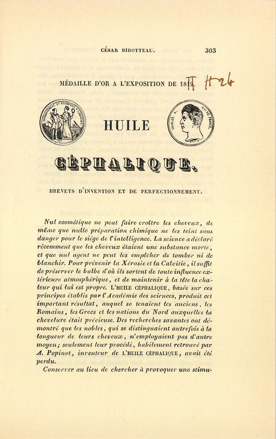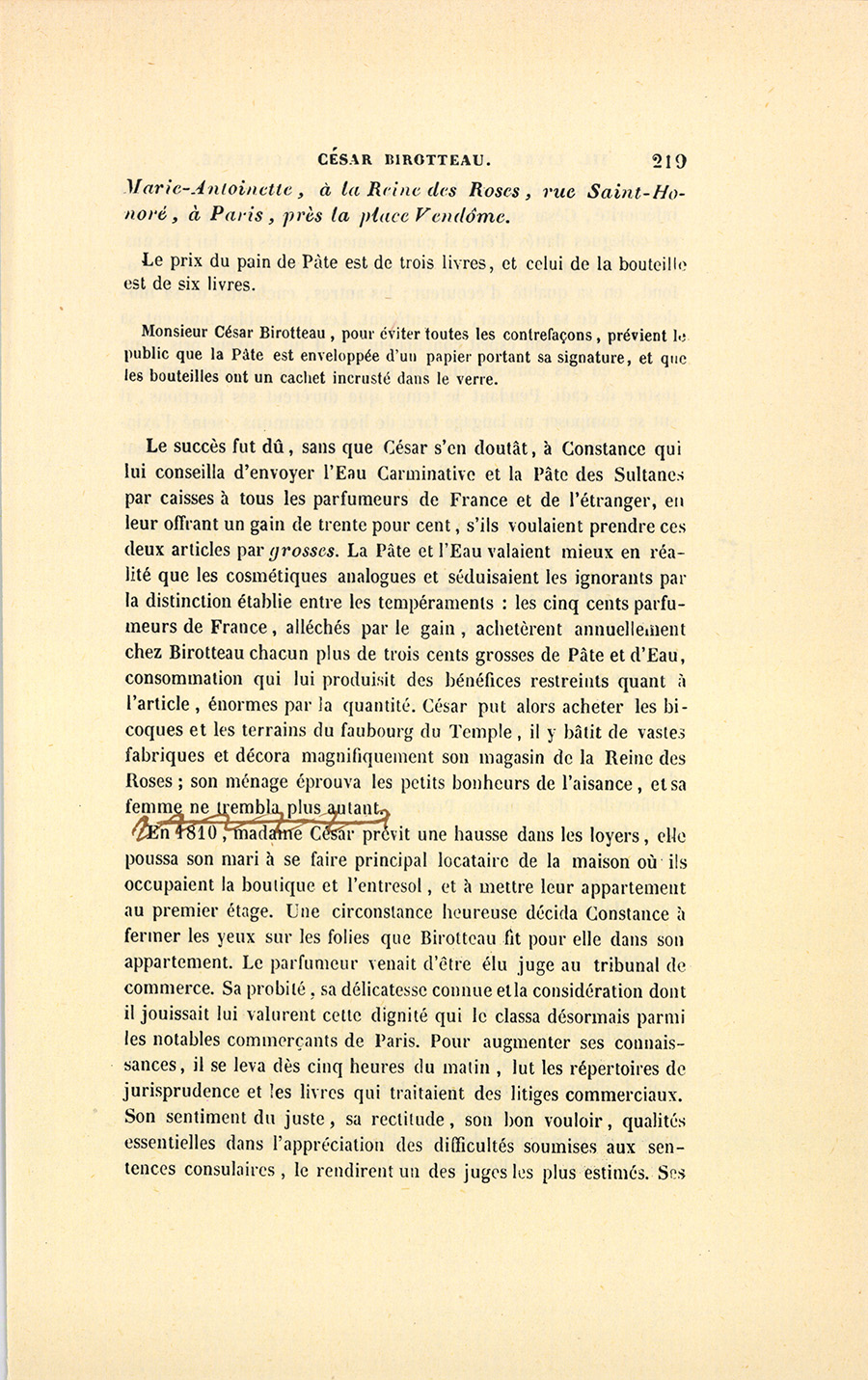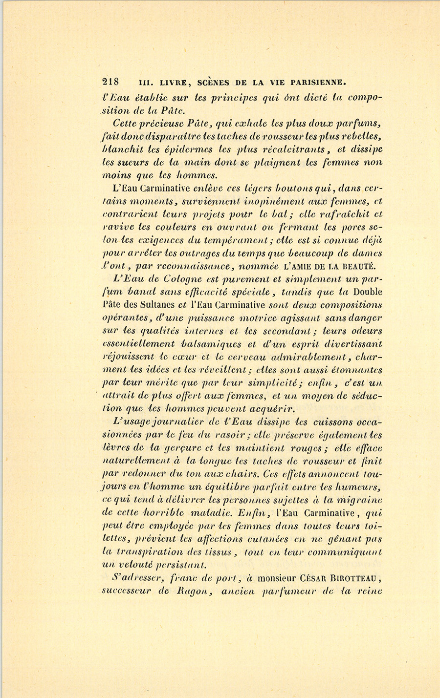 Depuis long-temps une pâte pour les mains et une eau pour le visage, donnant un résultat supérieur à celui obtenu par l’Eau de Cologne dans l’œuvre de la toilette, étaient généralement désirées par les deux sexes en Europe. Après avoir consacré de longues veilles à l’étude du derme et de l’épiderme chez les deux sexes, qui, l’un comme l’autre, attachent avec raison le plus grand prix à la douceur, à la souplesse, au brillant, au velouté de la peau, le sieur Birotteau, parfumeur avantageusement connu dans la capitale et à l’étranger, a découvert une Pâte et une Eau à juste titre nommées, dès leur apparition, merveilleuses par les élégants et par les élégantes de Paris. En effet, cette Pâte et cette Eau possèdent d’étonnantes propriétés pour agir sur la peau, sans la rider prématurément, effet immanquable des drogues employées inconsidérément jusqu’à ce jour et inventées par d’ignorantes cupidités. Cette découverte repose sur la division des tempéraments qui se rangent en deux grandes classes indiquées par la couleur de la Pâte et de l’Eau, lesquelles sont roses pour le derme et l’épiderme des personnes de constitution lymphatique, et blanches pour ceux des personnes qui jouissent d’un tempérament sanguin.