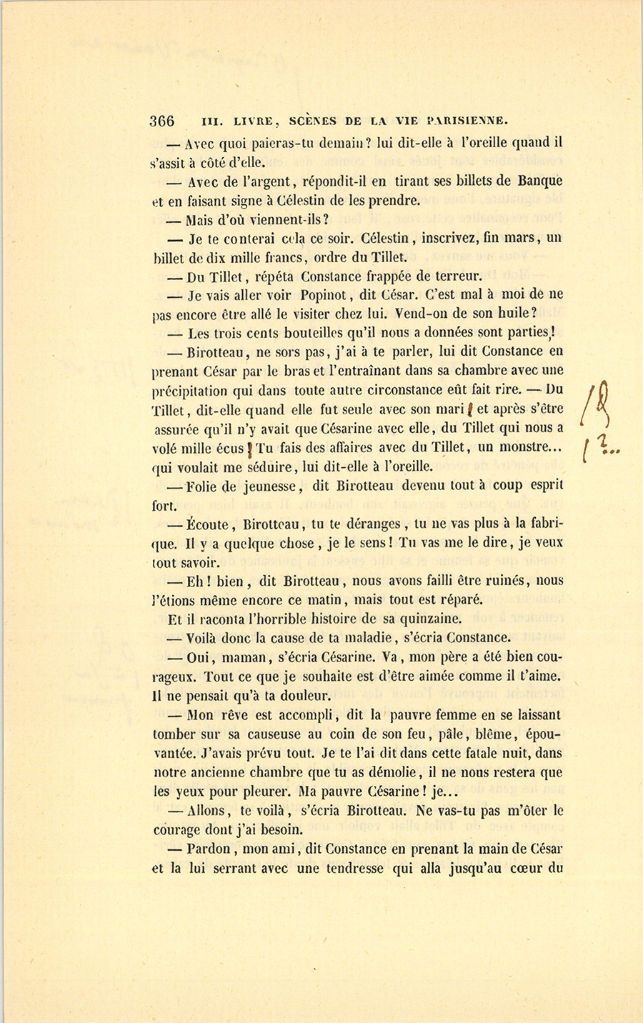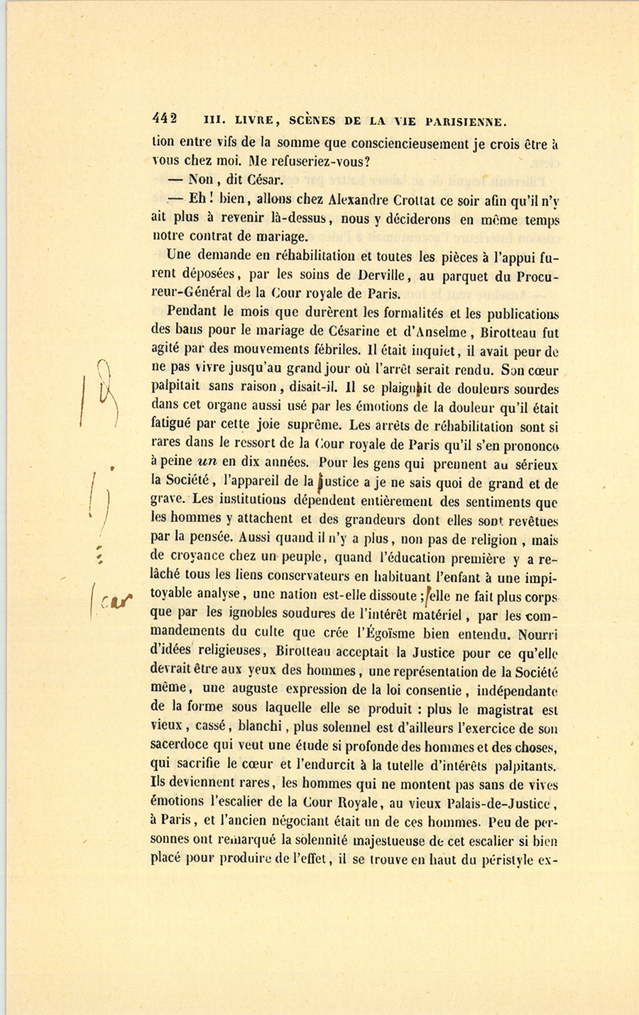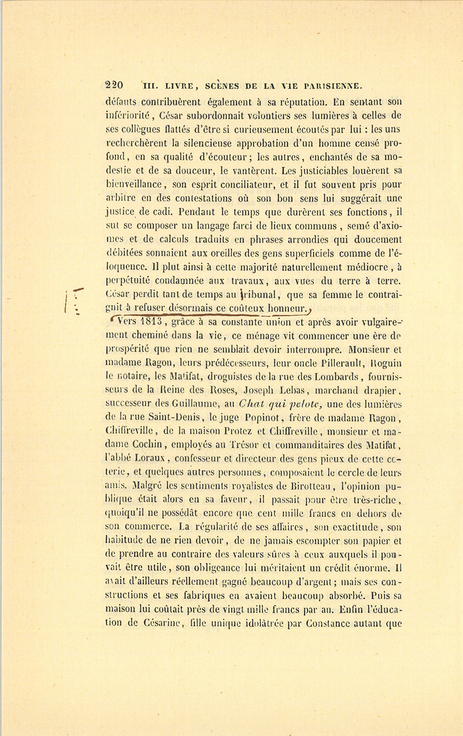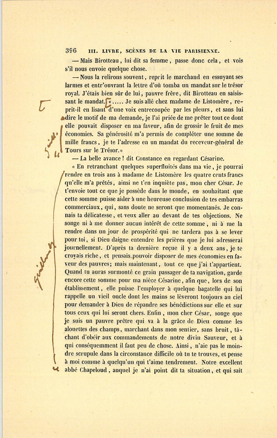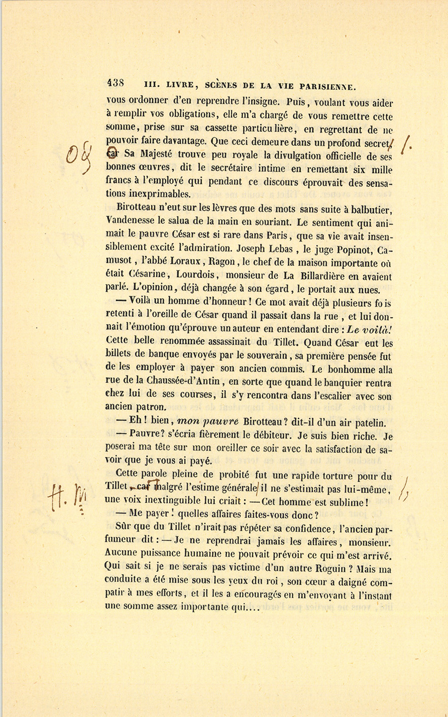 Ce jour devait être un jour de joie pour César. Le secrétaire particulier du roi, monsieur de Vandenesse, vint au Bureau lui parler. Ils sortirent ensemble dans la petite cour de la Caisse d’amortissement.