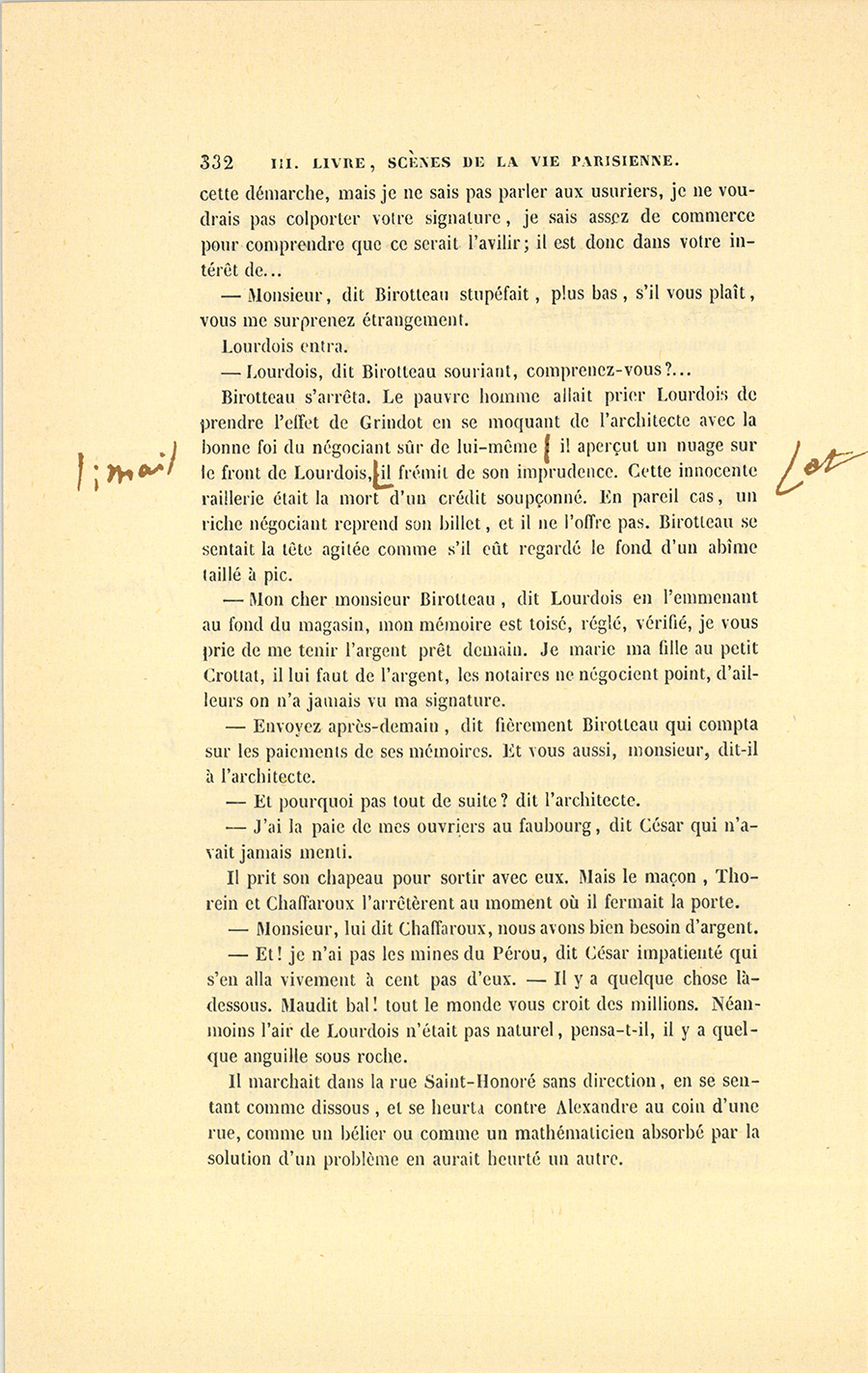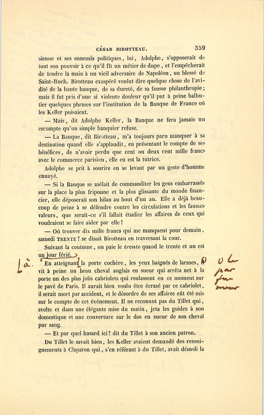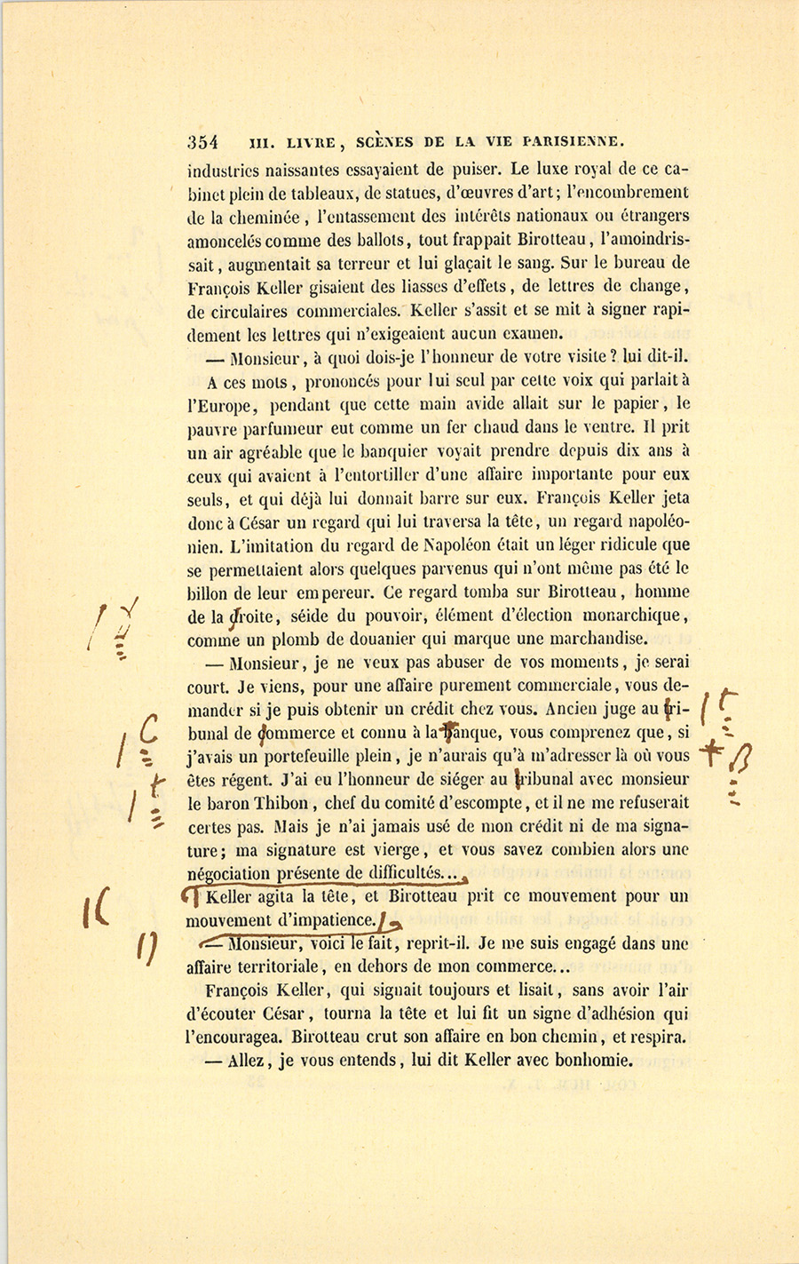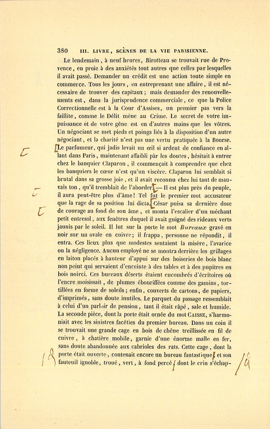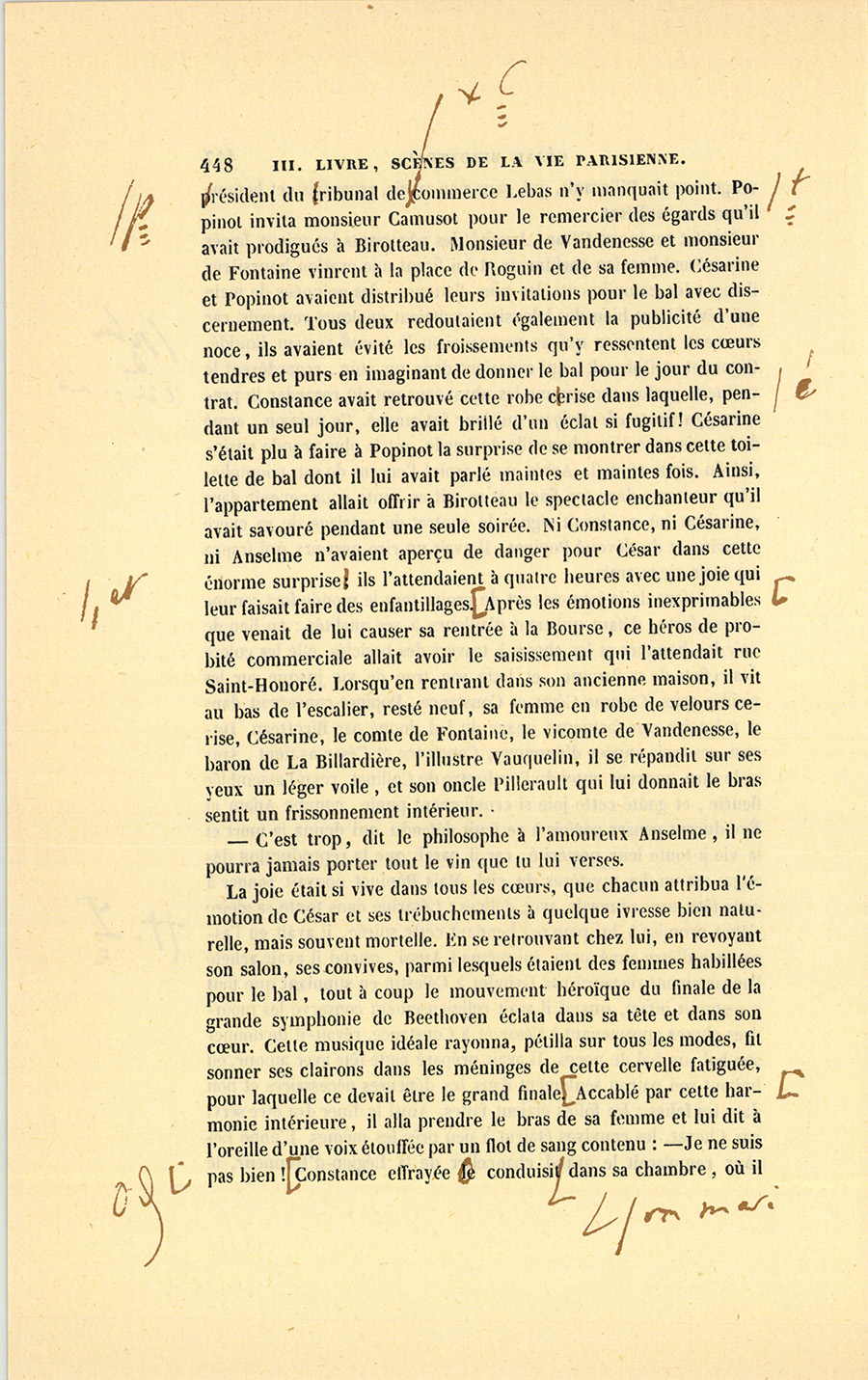 Ce jour devait être un jour de joie pour César. Le secrétaire particulier du roi, monsieur de Vandenesse, vint au Bureau lui parler. Ils sortirent ensemble dans la petite cour de la Caisse d’amortissement.