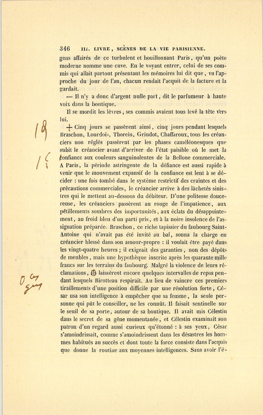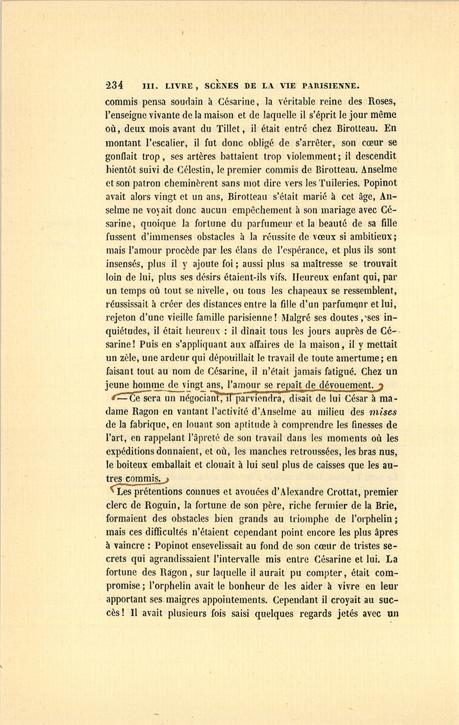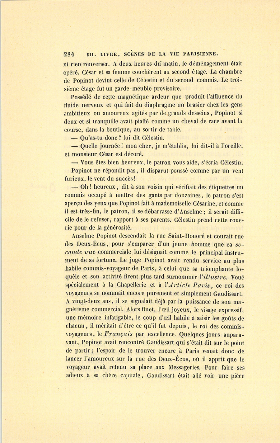 Le dernier enfant est le héros de cette scène. Lorsqu’à l’âge de quatorze ans César sut lire, écrire et compter, il quitta le pays, vint à pied à Paris chercher fortune avec un louis dans sa poche. La recommandation d’un apothicaire de Tours le fit entrer, en qualité de garçon de magasin, chez monsieur et madame Ragon, marchands parfumeurs. César possédait alors une paire de souliers ferrés, une culotte et des bas bleus, son gilet à fleurs, une veste de paysan, trois grosses chemises de bonne toile et son gourdin de route. Si ses cheveux étaient coupés comme le sont ceux des enfants de chœur, il avait les reins solides du Tourangeau ; s’il se laissait aller parfois à la paresse en vigueur dans le pays, elle était compensée par le désir de faire fortune ; s’il manquait d’esprit et d’instruction, il avait une rectitude instinctive et des sentiments délicats qu’il tenait de sa mère, créature qui, suivant l’expression tourangelle, était un cœur d’or. César eut la nourriture, six francs de gages par mois, et fut couché sur un grabat, au grenier, près de la cuisinière ; les commis, qui lui apprirent à faire les emballages et les commissions, à balayer le magasin et la rue, se moquèrent de lui tout en le façonnant au service, par suite des mœurs boutiquières, où la plaisanterie entre comme principal élément d’instruction ; monsieur et madame Ragon lui parlèrent comme à un chien. Personne ne prit garde à la fatigue de l’apprenti, quoique le soir ses pieds meurtris par le pavé lui fissent un mal horrible et que ses épaules fussent brisées. Cette rude application du chacun pour soi, l’évangile de toutes les capitales, fit trouver à César la vie {p. 208} de Paris fort dure. Le soir, il pleurait en pensant à la Touraine où le paysan travaille à son aise, où le maçon pose sa pierre en douze temps, où la paresse est sagement mêlée au labeur ; mais il s’endormait sans avoir le temps de penser à s’enfuir, car il avait des courses pour la matinée et obéissait à son devoir avec l’instinct d’un chien de garde. Si par hasard il se plaignait, le premier commis souriait d’un air jovial.