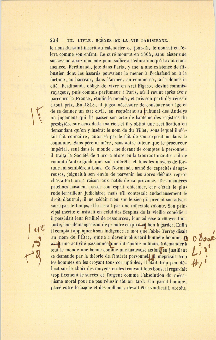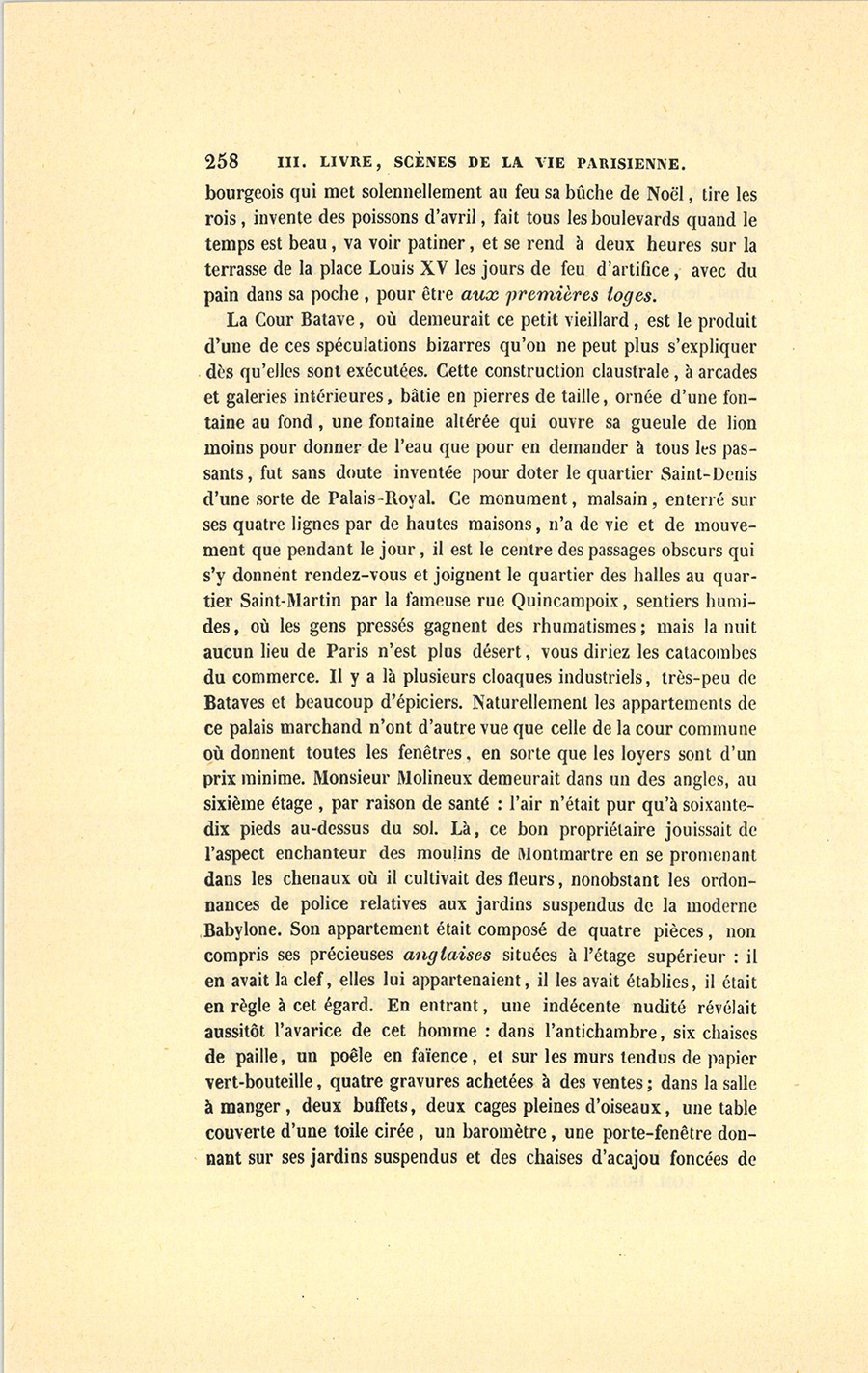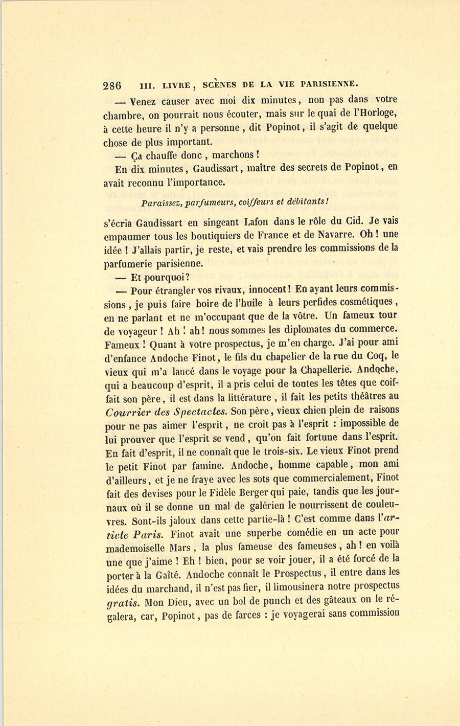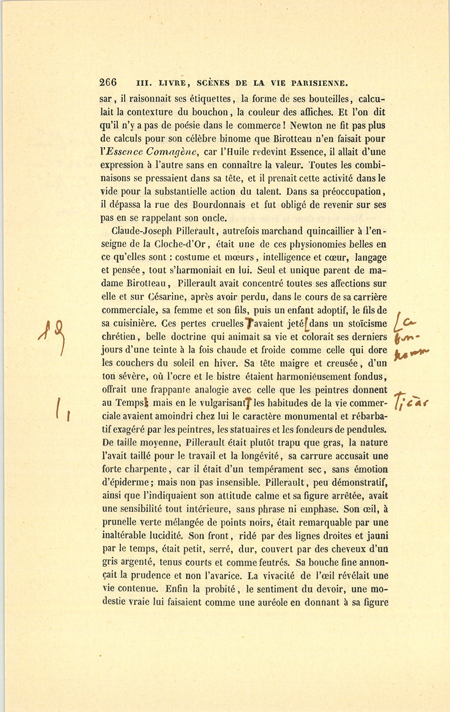 Le dernier enfant est le héros de cette scène. Lorsqu’à l’âge de quatorze ans César sut lire, écrire et compter, il quitta le pays, vint à pied à Paris chercher fortune avec un louis dans sa poche. La recommandation d’un apothicaire de Tours le fit entrer, en qualité de garçon de magasin, chez monsieur et madame Ragon, marchands parfumeurs. César possédait alors une paire de souliers ferrés, une culotte et des bas bleus, son gilet à fleurs, une veste de paysan, trois grosses chemises de bonne toile et son gourdin de route. Si ses cheveux étaient coupés comme le sont ceux des enfants de chœur, il avait les reins solides du Tourangeau ; s’il se laissait aller parfois à la paresse en vigueur dans le pays, elle était compensée par le désir de faire fortune ; s’il manquait d’esprit et d’instruction, il avait une rectitude instinctive et des sentiments délicats qu’il tenait de sa mère, créature qui, suivant l’expression tourangelle, était un cœur d’or. César eut la nourriture, six francs de gages par mois, et fut couché sur un grabat, au grenier, près de la cuisinière ; les commis, qui lui apprirent à faire les emballages et les commissions, à balayer le magasin et la rue, se moquèrent de lui tout en le façonnant au service, par suite des mœurs boutiquières, où la plaisanterie entre comme principal élément d’instruction ; monsieur et madame Ragon lui parlèrent comme à un chien. Personne ne prit garde à la fatigue de l’apprenti, quoique le soir ses pieds meurtris par le pavé lui fissent un mal horrible et que ses épaules fussent brisées. Cette rude application du chacun pour soi, l’évangile de toutes les capitales, fit trouver à César la vie {p. 208} de Paris fort dure. Le soir, il pleurait en pensant à la Touraine où le paysan travaille à son aise, où le maçon pose sa pierre en douze temps, où la paresse est sagement mêlée au labeur ; mais il s’endormait sans avoir le temps de penser à s’enfuir, car il avait des courses pour la matinée et obéissait à son devoir avec l’instinct d’un chien de garde. Si par hasard il se plaignait, le premier commis souriait d’un air jovial.