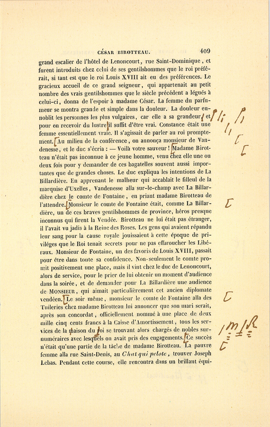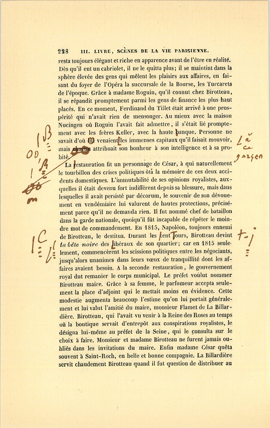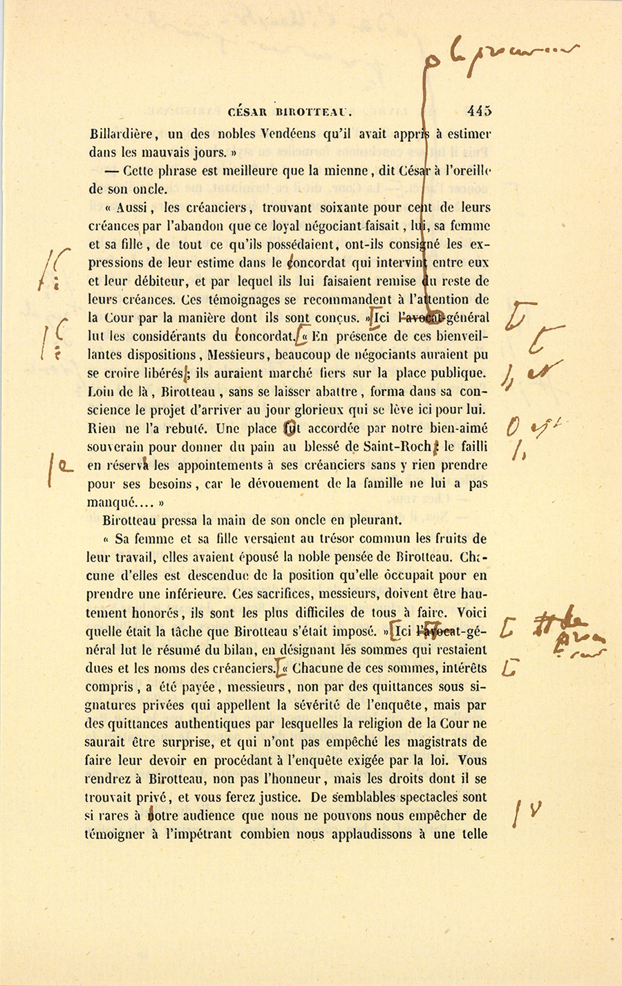 La fuite d’un notaire de Paris, qui emportait les fonds déposés chez lui par Birotteau, décida la ruine de l’impétrant, reprit-il. La Cour a rendu, dans cette affaire, un arrêt qui prouve à quel point la confiance des clients de Roguin fut indignement trompée. Un Concordat intervint. Nous ferons observer pour l’honneur de l’impétrant que les opérations ont été remarquables par une pureté qui ne se rencontre en aucune des faillites scandaleuses par lesquelles le commerce de Paris est journellement affligé. Les créanciers de Birotteau trouvèrent les moindres choses que l’infortuné possédât. Ils ont trouvé, Messieurs, ses vêtements, ses bijoux, enfin les choses d’un usage purement personnel, non-seulement à lui, mais à sa femme qui abandonna tous ses droits pour grossir l’actif. Birotteau, dans cette circonstance, a été digne de la considération qui lui avait valu ses fonctions municipales ; car il était alors Adjoint au Maire du Deuxième Arrondissement et venait de recevoir la décoration de la Légion-d’Honneur accordée autant au dévouement du royaliste qui luttait en vendémiaire sur les marches de Saint-Roch, alors teintes de son sang, qu’au magistrat consulaire estimé pour ses lumières, aimé pour son esprit conciliateur, et au modeste officier municipal qui venait de refuser les honneurs de la Mairie en indiquant un plus digne, l’honorable baron de {p. 445} La Billardière, un des nobles Vendéens qu’il avait appris à estimer dans les mauvais jours.