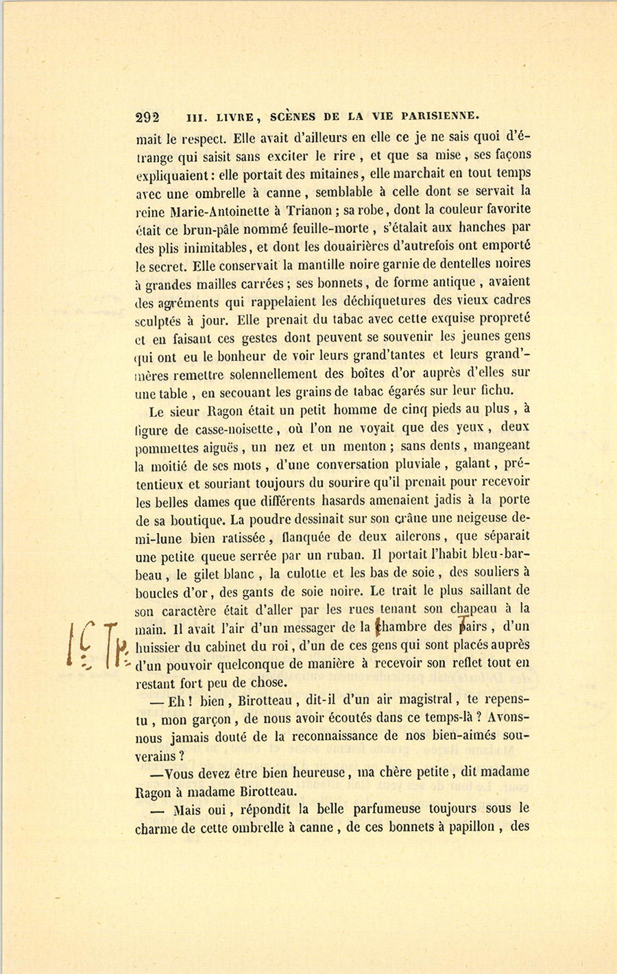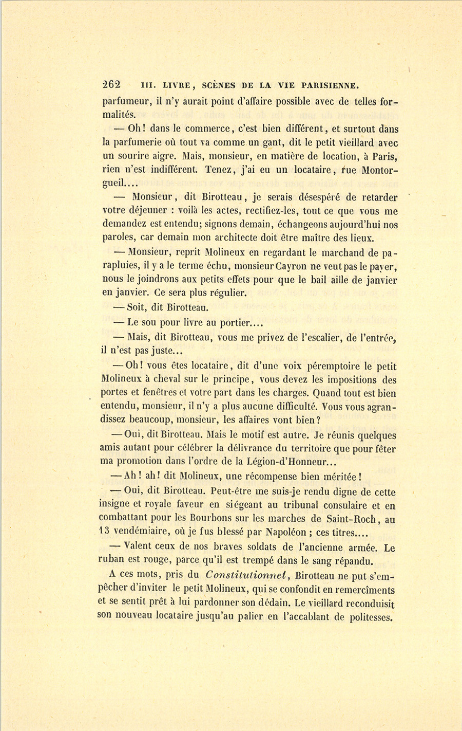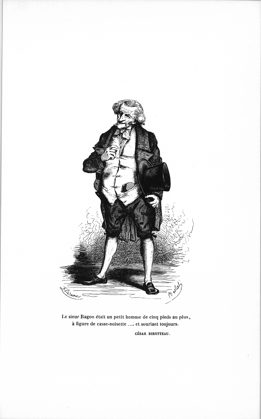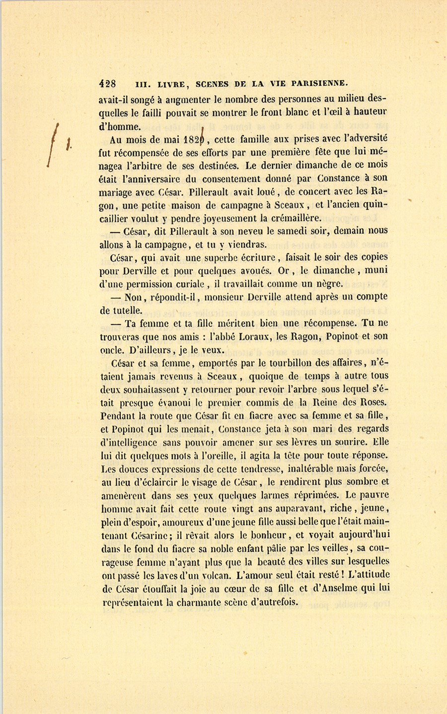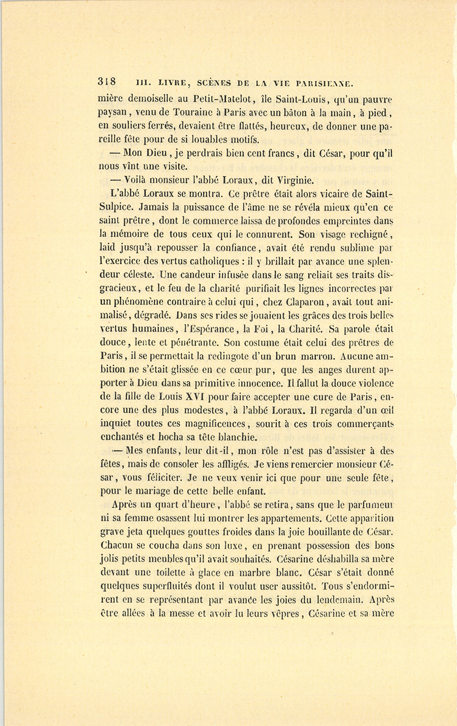 Un closier des environs de Chinon, nommé Jacques Birotteau, épousa la femme de chambre d’une dame chez laquelle il faisait les vignes ; il eut trois garçons, sa femme mourut en couches du dernier, et le pauvre homme ne lui survécut pas long-temps. La maîtresse affectionnait sa femme de chambre ; elle fit élever avec ses fils l’aîné des enfants de son closier, nommé François, et le plaça dans un séminaire. Ordonné prêtre, François Birotteau se cacha pendant la révolution et mena la vie errante des prêtres non assermentés, traqués comme des bêtes fauves, et pour le moins guillotinés. Au moment où commence cette histoire, il se trouvait vicaire {p. 207} de la cathédrale de Tours, et n’avait quitté qu’une seule fois cette ville, pour venir voir son frère César. Le mouvement de Paris étourdit si fort le bon prêtre qu’il n’osait sortir de sa chambre ; il nommait les cabriolets des demi-fiacres, et s’étonnait de tout. Après une semaine de séjour, il revint à Tours, en se promettant de ne jamais retourner dans la capitale.