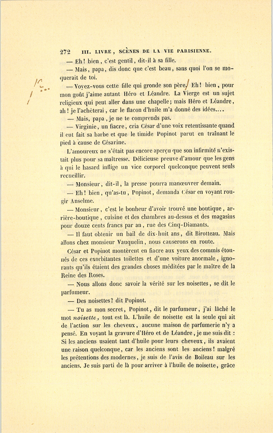 – Sans doute l’aide de Dieu ne nuit à rien, dit gravement Birotteau. Mais l’essence de noisettes est aussi une puissance, ma femme ! J’ai fait cette découverte comme autrefois celle de la Double Pâte des Sultanes, par hasard : la première fois en ouvrant un livre, cette fois en regardant la gravure d’Héro et Léandre. Tu sais, une femme qui verse de l’huile sur la tête de son amant, est-ce gentil ? Les spéculations les plus sûres sont celles qui reposent sur la vanité, sur l’amour-propre, l’envie de paraître. Ces sentiments-là ne meurent jamais.