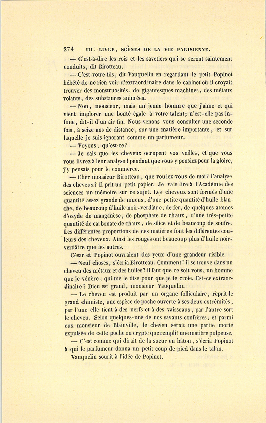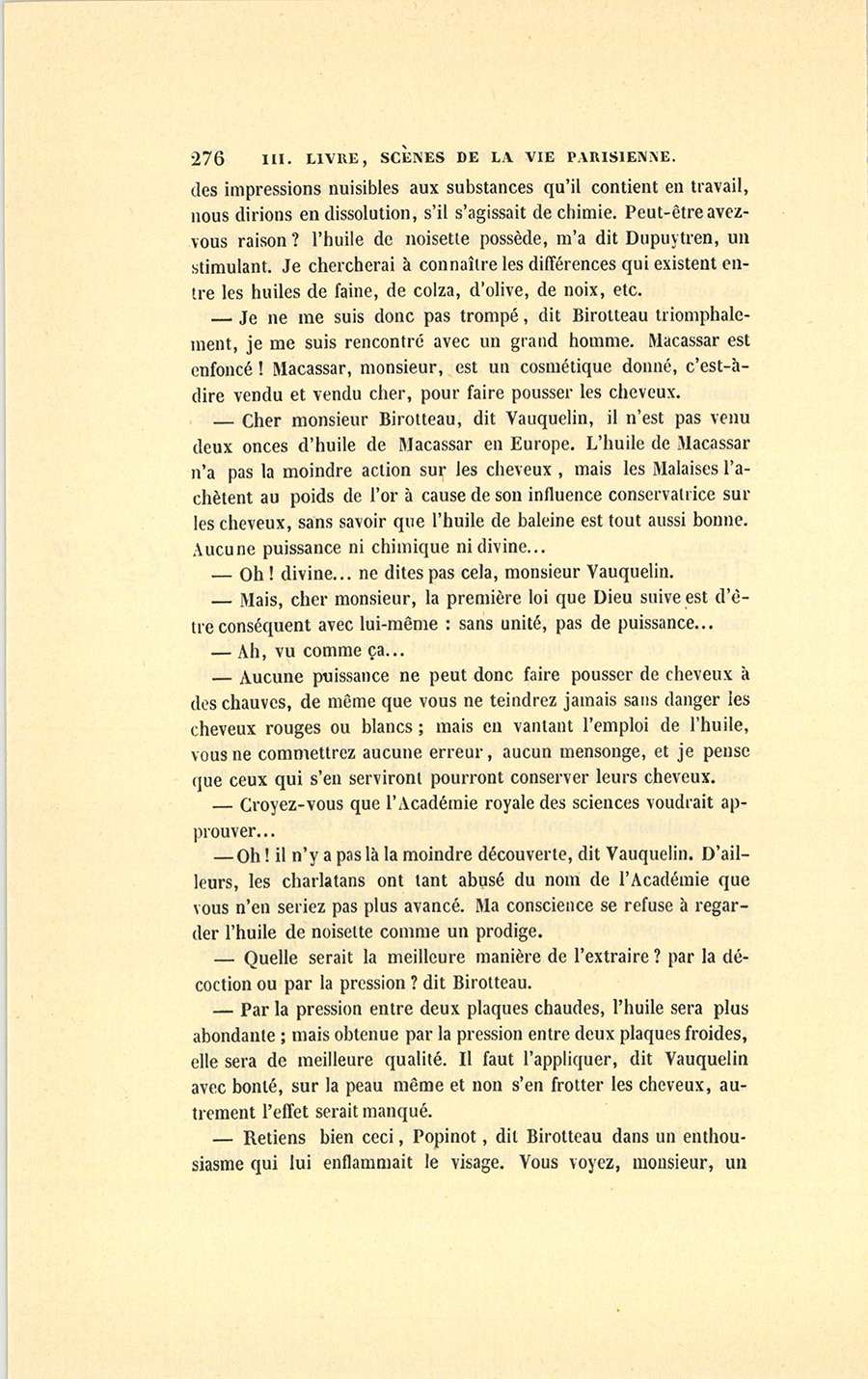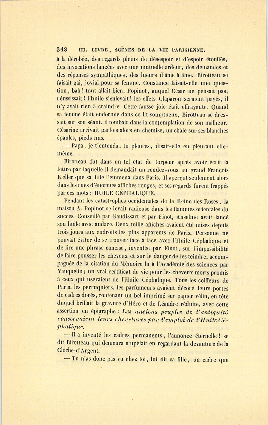 – À un certain âge, les hommes feraient les cent coups pour avoir des cheveux, quand ils n’en ont pas. Depuis quelque temps, les coiffeurs me disent qu’ils ne vendent pas seulement le Macassar, mais toutes les drogues bonnes à teindre les cheveux, ou qui {p. 205} passent pour les faire pousser. Depuis la paix, les hommes sont bien plus auprès des femmes, et elles n’aiment pas les chauves, hé ! hé ! mimi ! La demande de cet article-là s’explique donc par la situation politique. Une composition qui vous entretiendrait les cheveux en bonne santé se vendrait comme du pain, d’autant que cette Essence sera sans doute approuvée par l’Académie des Sciences. Mon bon monsieur Vauquelin m’aidera peut-être encore. J’irai demain lui soumettre mon idée, en lui offrant la gravure que j’ai fini par trouver après deux ans de recherches en Allemagne. Il s’occupe précisément de l’analyse des cheveux. Chiffreville, son associé pour sa fabrique de produits chimiques, me l’a dit. Si ma découverte s’accorde avec les siennes, mon Essence serait achetée par les deux sexes. Mon idée est une fortune, je le répète. Mon Dieu, je n’en dors pas. Eh ! par bonheur, le petit Popinot a les plus beaux cheveux du monde. Avec une demoiselle de comptoir qui aurait des cheveux longs à tomber jusqu’à terre et qui dirait, si la chose est possible sans offenser Dieu ni le prochain, que l’huile Comagène (car ce sera décidément une huile) y est pour quelque chose, les têtes des grisons se jetteraient là-dessus comme la pauvreté sur le monde. Dis donc1, mignonne, et ton bal ? Je ne suis pas méchant, mais je voudrais bien rencontrer ce petit drôle de du Tillet, qui fait le gros avec sa fortune, et qui m’évite toujours à la Bourse. Il sait que je connais un trait de lui qui n’est pas beau. Peut-être ai-je été trop bon avec lui. Est-ce drôle, ma femme, qu’on soit toujours puni de ses bonnes actions, ici-bas s’entend ! Je me suis conduit comme un père envers lui, tu ne sais pas tout ce que j’ai fait pour lui.
