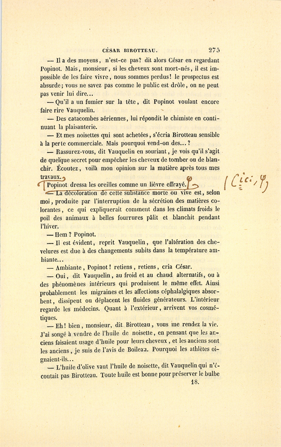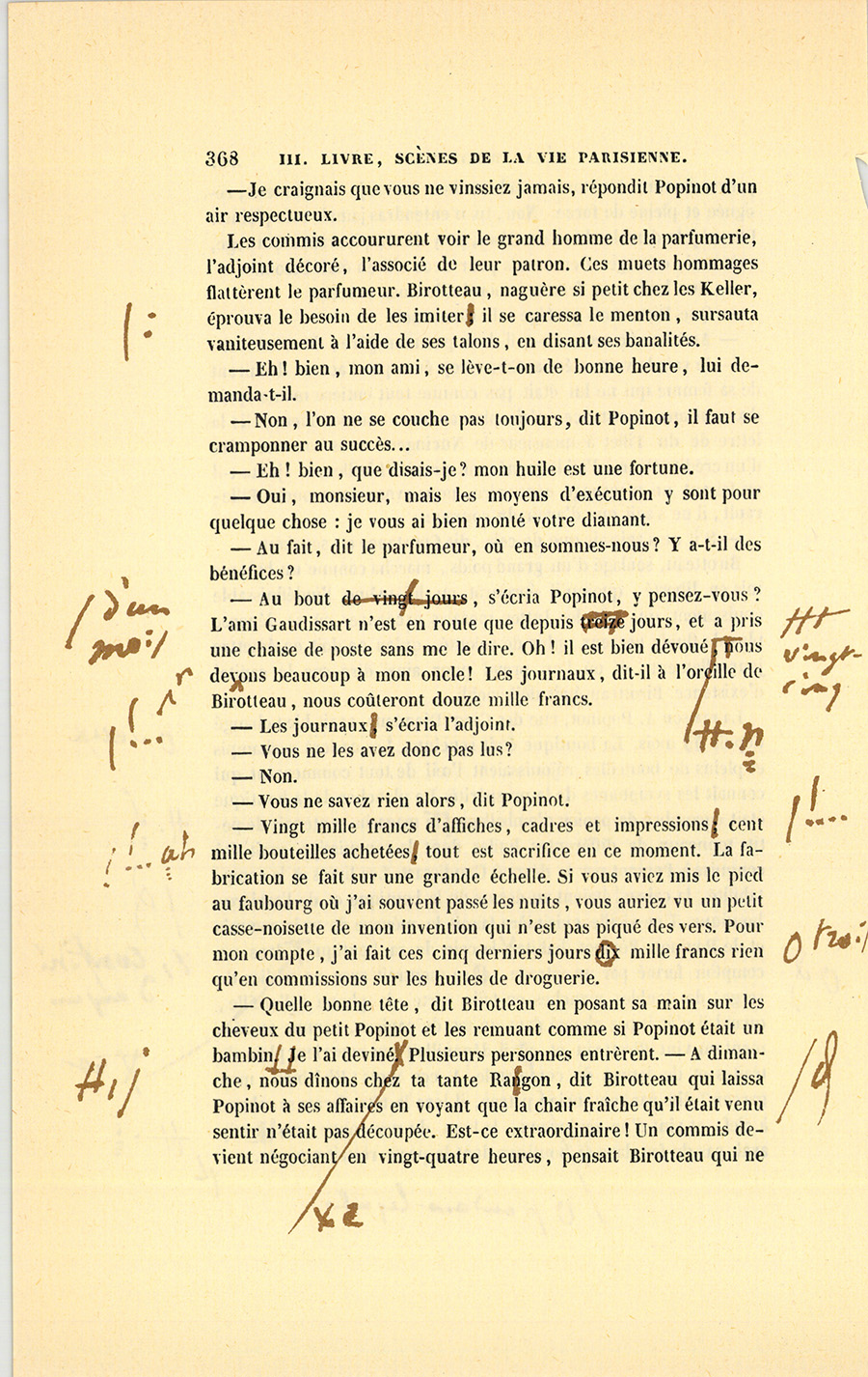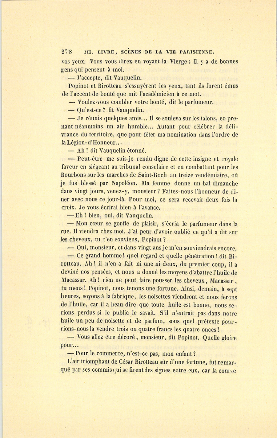 – À un certain âge, les hommes feraient les cent coups pour avoir des cheveux, quand ils n’en ont pas. Depuis quelque temps, les coiffeurs me disent qu’ils ne vendent pas seulement le Macassar, mais toutes les drogues bonnes à teindre les cheveux, ou qui {p. 205} passent pour les faire pousser. Depuis la paix, les hommes sont bien plus auprès des femmes, et elles n’aiment pas les chauves, hé ! hé ! mimi ! La demande de cet article-là s’explique donc par la situation politique. Une composition qui vous entretiendrait les cheveux en bonne santé se vendrait comme du pain, d’autant que cette Essence sera sans doute approuvée par l’Académie des Sciences. Mon bon monsieur Vauquelin m’aidera peut-être encore. J’irai demain lui soumettre mon idée, en lui offrant la gravure que j’ai fini par trouver après deux ans de recherches en Allemagne. Il s’occupe précisément de l’analyse des cheveux. Chiffreville, son associé pour sa fabrique de produits chimiques, me l’a dit. Si ma découverte s’accorde avec les siennes, mon Essence serait achetée par les deux sexes. Mon idée est une fortune, je le répète. Mon Dieu, je n’en dors pas. Eh ! par bonheur, le petit Popinot a les plus beaux cheveux du monde. Avec une demoiselle de comptoir qui aurait des cheveux longs à tomber jusqu’à terre et qui dirait, si la chose est possible sans offenser Dieu ni le prochain, que l’huile Comagène (car ce sera décidément une huile) y est pour quelque chose, les têtes des grisons se jetteraient là-dessus comme la pauvreté sur le monde. Dis donc1, mignonne, et ton bal ? Je ne suis pas méchant, mais je voudrais bien rencontrer ce petit drôle de du Tillet, qui fait le gros avec sa fortune, et qui m’évite toujours à la Bourse. Il sait que je connais un trait de lui qui n’est pas beau. Peut-être ai-je été trop bon avec lui. Est-ce drôle, ma femme, qu’on soit toujours puni de ses bonnes actions, ici-bas s’entend ! Je me suis conduit comme un père envers lui, tu ne sais pas tout ce que j’ai fait pour lui.
