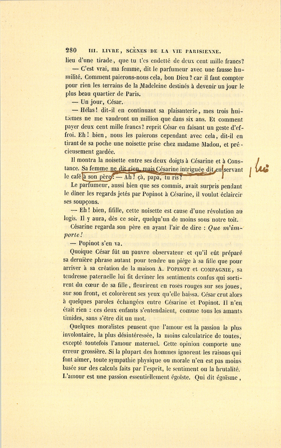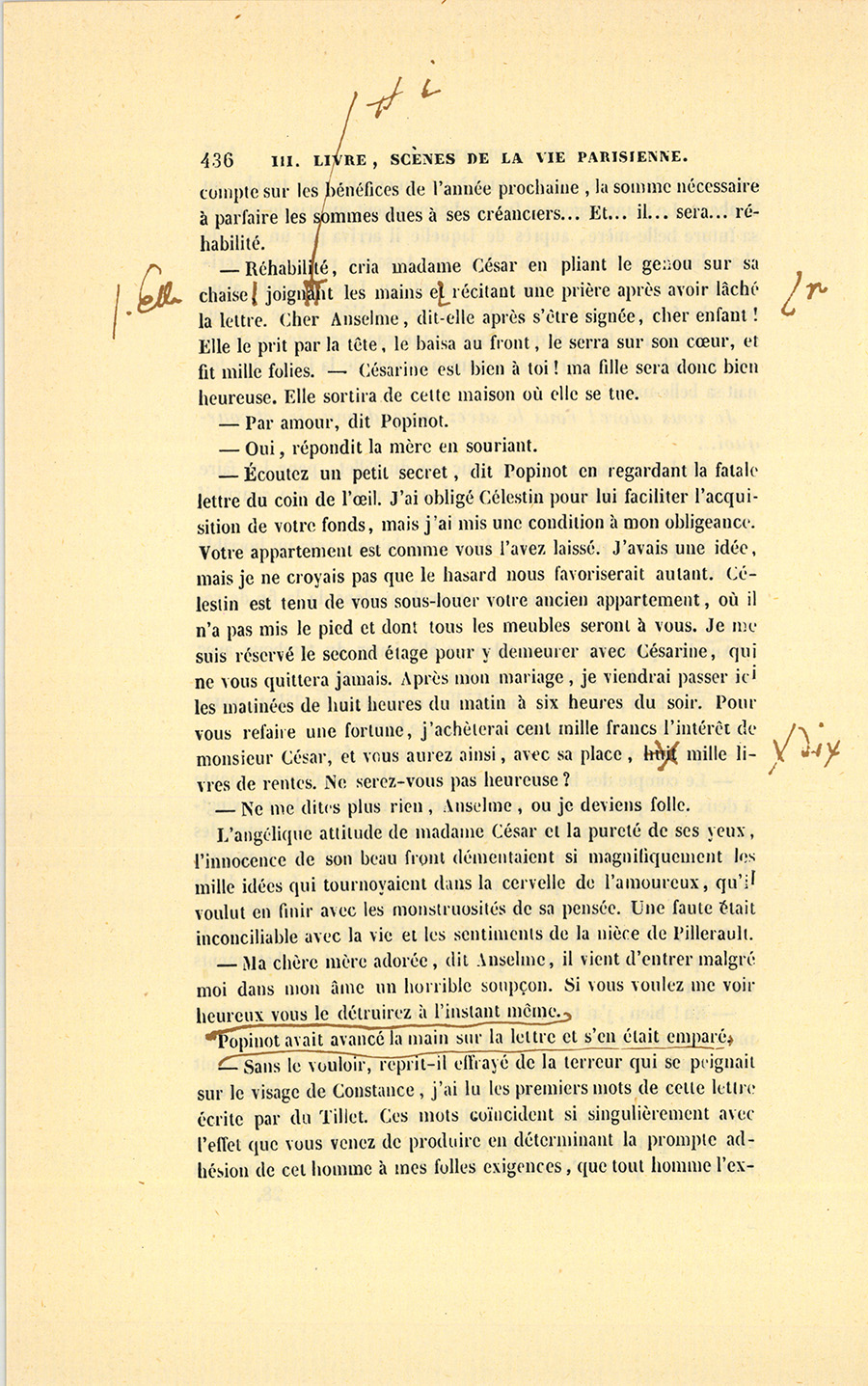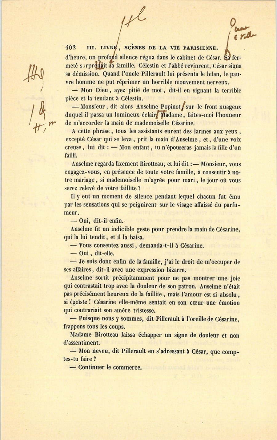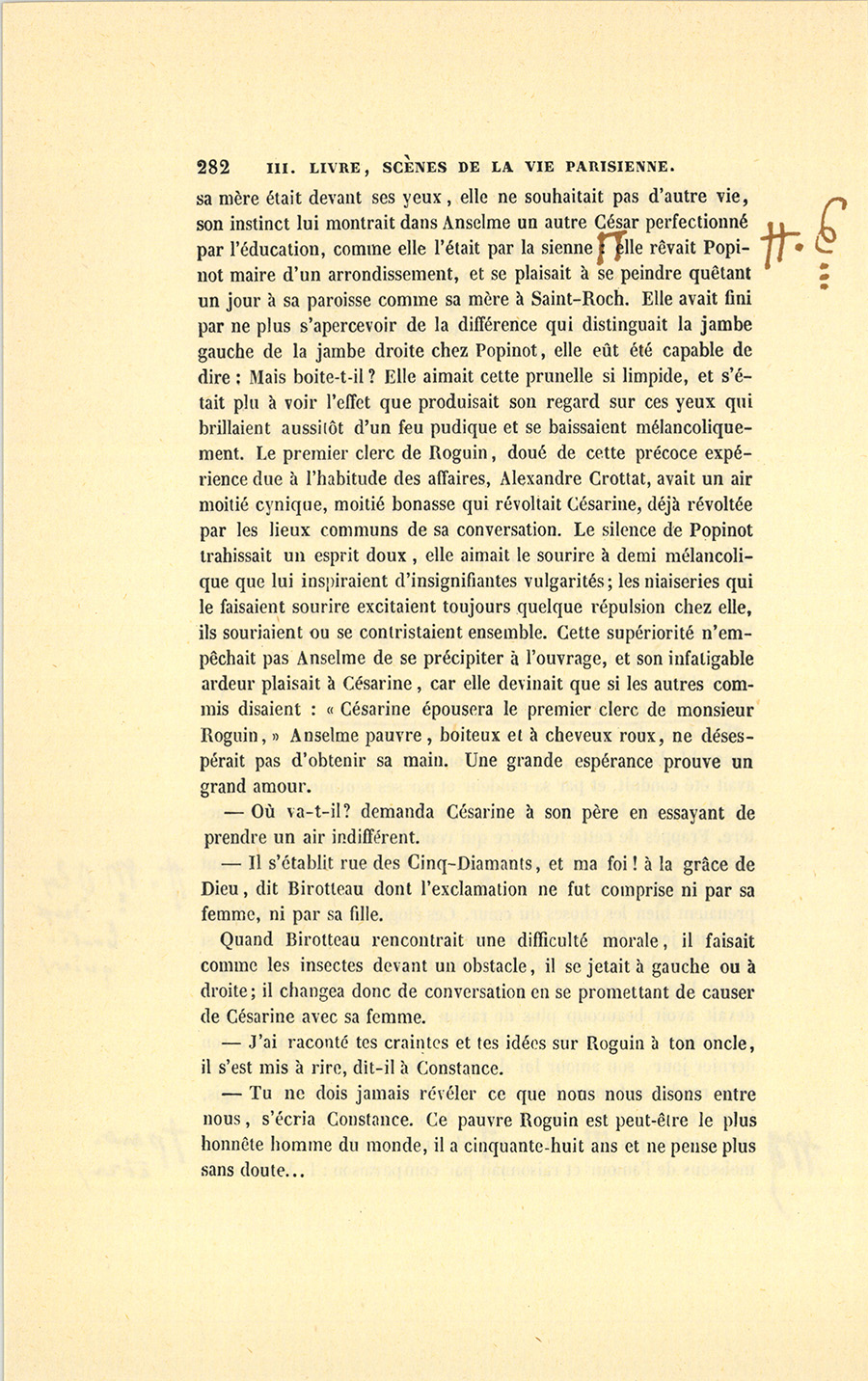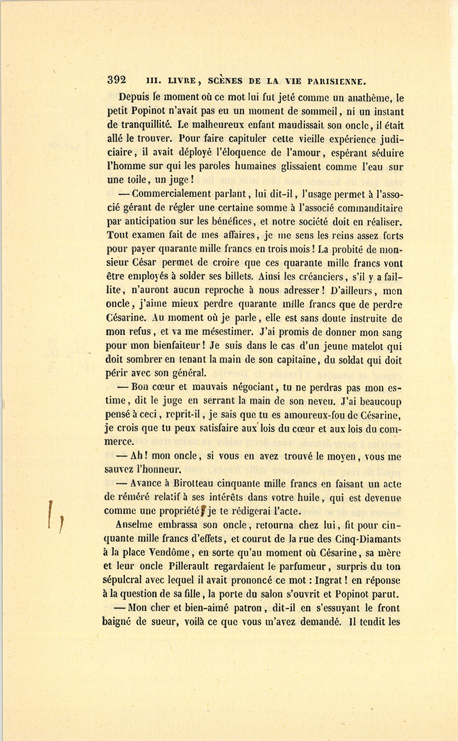 – Écoutez un petit secret, dit Popinot en regardant la fatale lettre du coin de l’œil. J’ai obligé Célestin pour lui faciliter l’acquisition de votre fonds, mais j’ai mis une condition à mon obligeance. Votre appartement est comme vous l’avez laissé. J’avais une idée, mais je ne croyais pas que le hasard nous favoriserait autant. Célestin est tenu de vous sous-louer votre ancien appartement, où il n’a pas mis le pied et dont tous les meubles seront à vous. Je me suis réservé le second étage pour y demeurer avec Césarine, qui ne vous quittera jamais. Après mon mariage, je viendrai passer ici les matinées de huit heures du matin à six heures du soir. Pour vous refaire une fortune, j’achèterai cent mille francs l’intérêt de monsieur César, et vous aurez ainsi, avec sa place, dix mille livres de rentes. Ne serez-vous pas heureuse ?