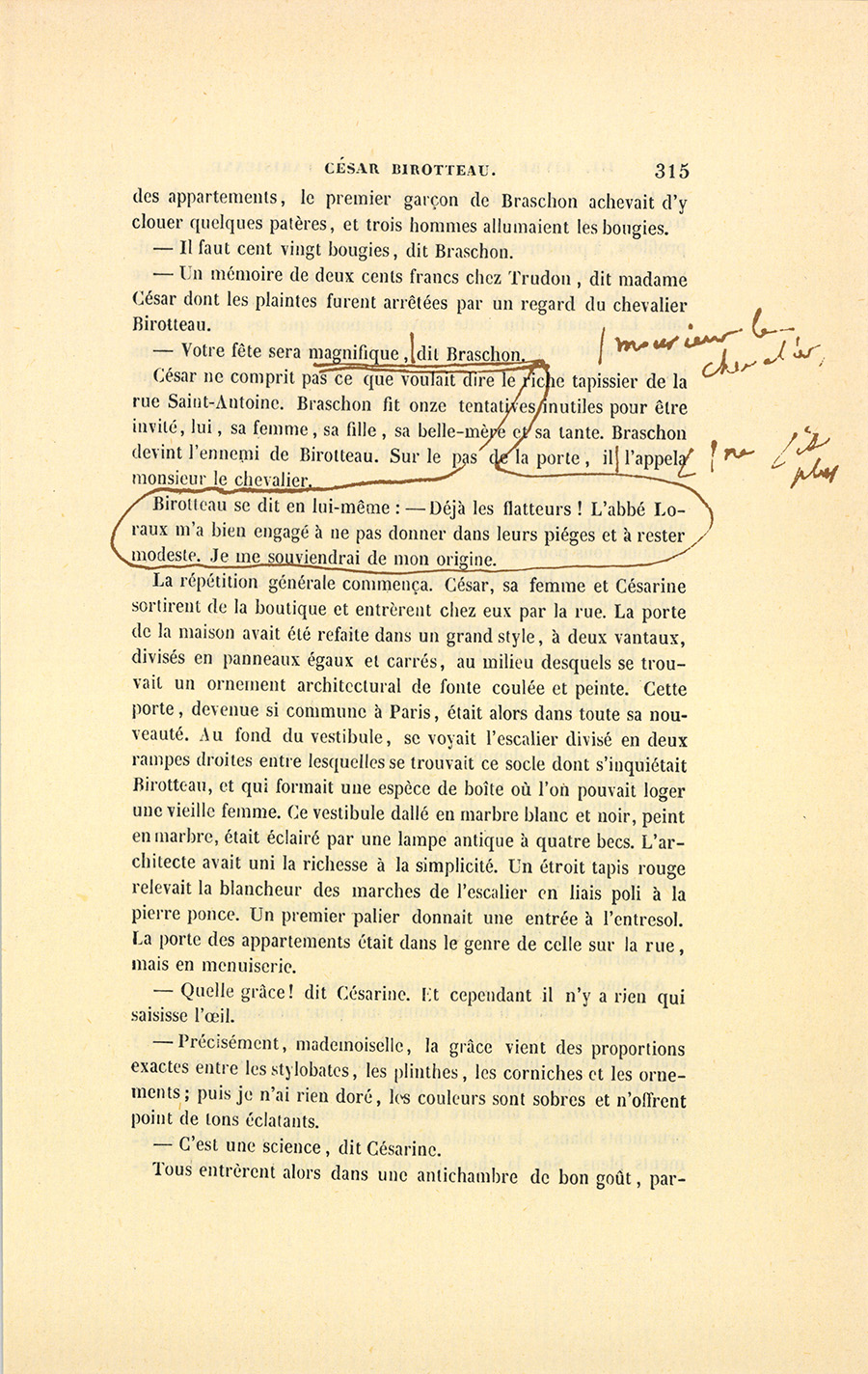 – Allons, calme-toi, César ! Une femme qui vit avec toi depuis ce temps connaît le fond de ton âme. Tu es le maître, après tout. Cette fortune, tu l’as gagnée, n’est-ce pas ? elle est à toi, tu peux la dépenser. Nous serions réduites à la dernière misère, ni moi ni {p. 204} ta fille nous ne te ferions un seul reproche. Mais écoute : quand tu inventais ta Pâte des Sultanes et ton Eau Carminative, que risquais-tu ? des cinq à six mille francs. Aujourd’hui, tu mets toute ta fortune sur un coup de cartes, tu n’es pas seul à le jouer, tu as des associés qui peuvent se montrer plus fins que toi. Donne ton bal, renouvelle ton appartement, fais dix mille francs de dépense, c’est inutile, ce n’est pas ruineux. Quant à ton affaire de la Madeleine, je m’y oppose formellement. Tu es parfumeur, sois parfumeur, et non pas revendeur de terrains. Nous avons un instinct qui ne nous trompe pas, nous autres femmes ! Je t’ai prévenu, maintenant agis à ta tête. Tu as été juge au tribunal de commerce, tu connais les lois, tu as bien mené ta barque, je te suivrai, César ! Mais je tremblerai jusqu’à ce que je voie notre fortune solidement assise, et Césarine bien mariée. Dieu veuille que mon rêve ne soit pas une prophétie !