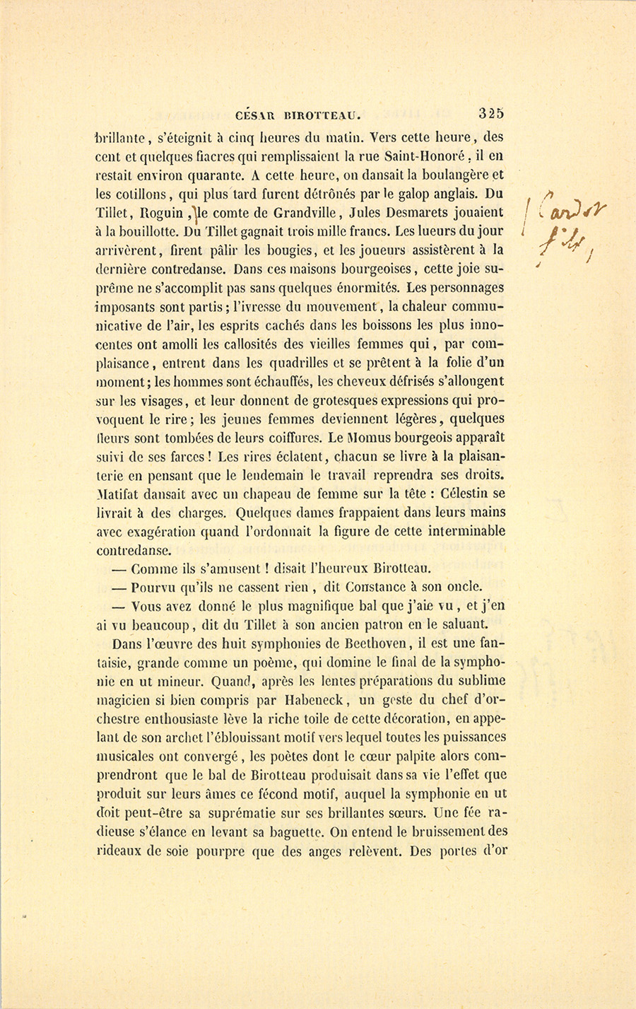 La joie était si vive dans tous les cœurs, que chacun attribua l’émotion de César et ses trébuchements à quelque ivresse bien naturelle, mais souvent mortelle. En se retrouvant chez lui, en revoyant son salon, ses convives, parmi lesquels étaient des femmes habillées pour le bal, tout à coup le mouvement héroïque du finale de la grande symphonie de Beethoven éclata dans sa tête et dans son cœur. Cette musique idéale rayonna, pétilla sur tous les modes, fit sonner ses clairons dans les méninges de cette cervelle fatiguée, pour laquelle ce devait être le grand finale.
