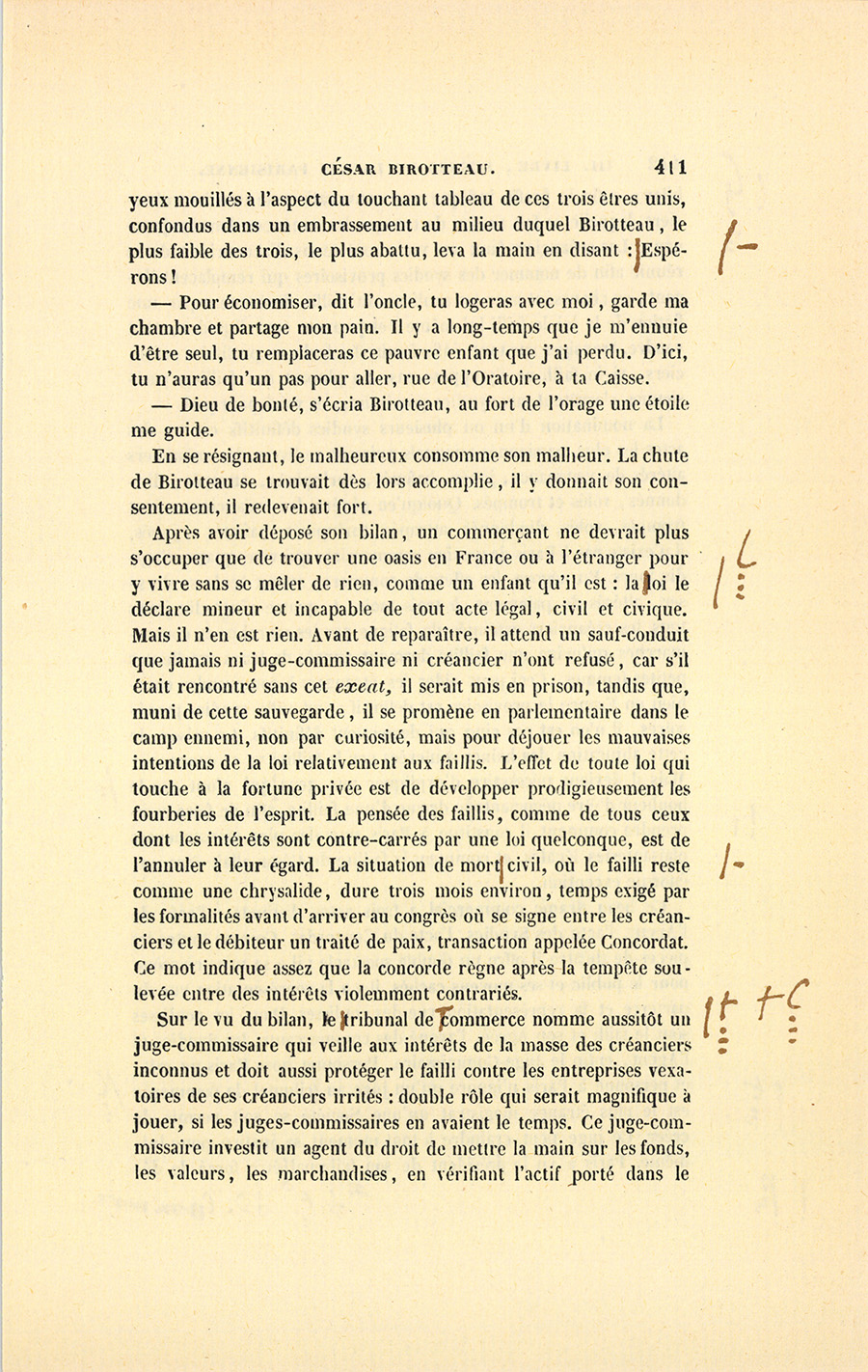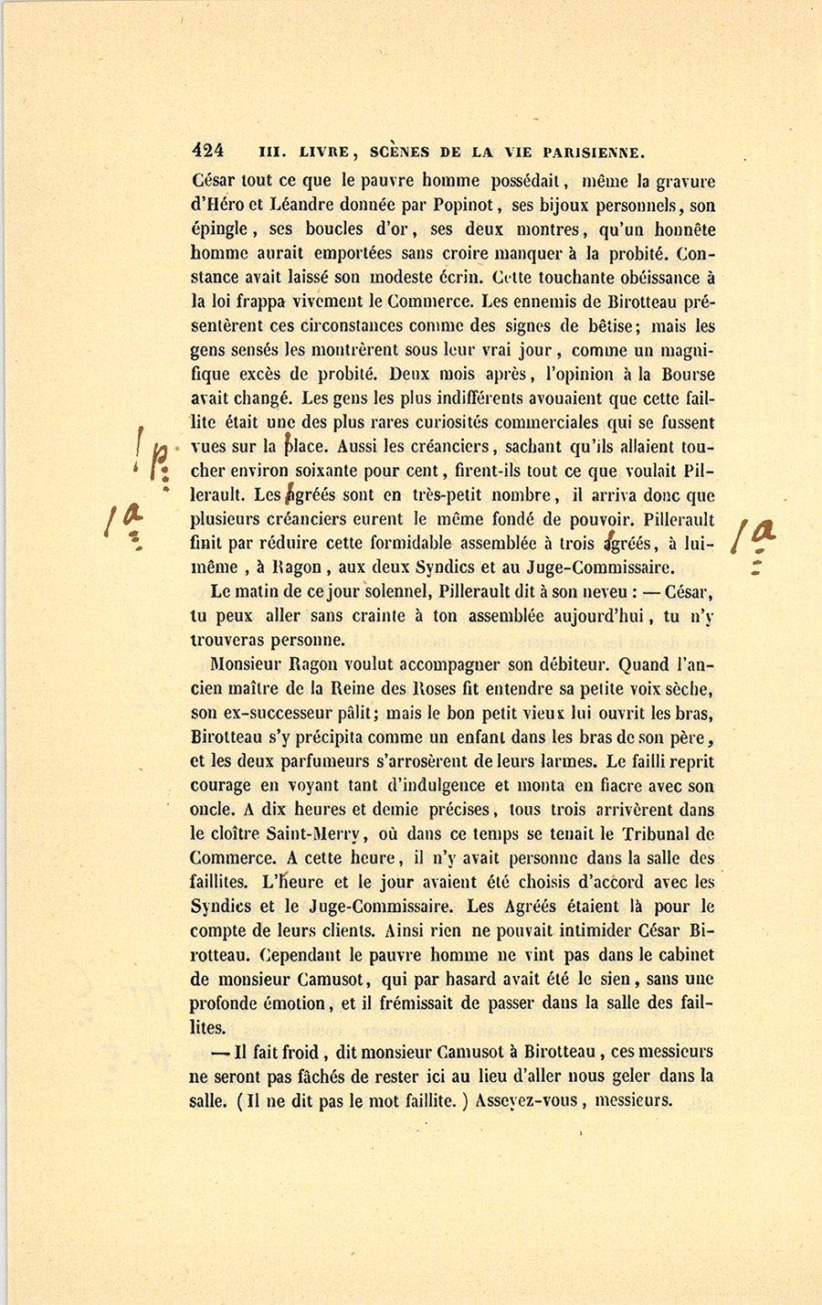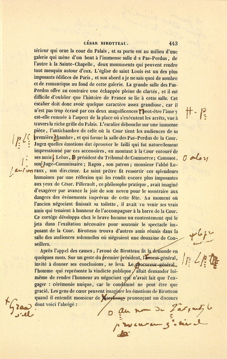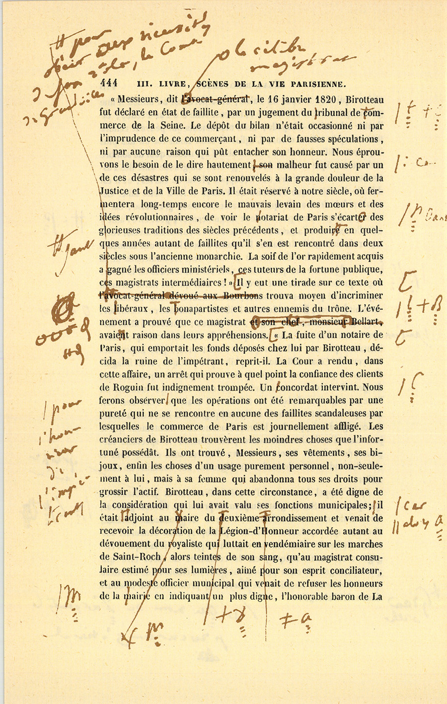 {p. 444} Messieurs, dit le célèbre magistrat, le 16 janvier 1820, Birotteau fut déclaré en état de faillite, par un jugement du Tribunal de Commerce de la Seine. Le dépôt du bilan n’était occasionné ni par l’imprudence de ce commerçant, ni par de fausses spéculations, ni par aucune raison qui pût entacher son honneur. Nous éprouvons le besoin de le dire hautement : ce malheur fut causé par un de ces désastres qui se sont renouvelés à la grande douleur de la Justice et de la Ville de Paris. Il était réservé à notre siècle, où fermentera long-temps encore le mauvais levain des mœurs et des idées révolutionnaires, de voir le Notariat de Paris s’écartant des glorieuses traditions des siècles précédents, et produisant en quelques années autant de faillites qu’il s’en est rencontré dans deux siècles sous l’ancienne monarchie. La soif de l’or rapidement acquis a gagné les officiers ministériels, ces tuteurs de la fortune publique, ces magistrats intermédiaires !