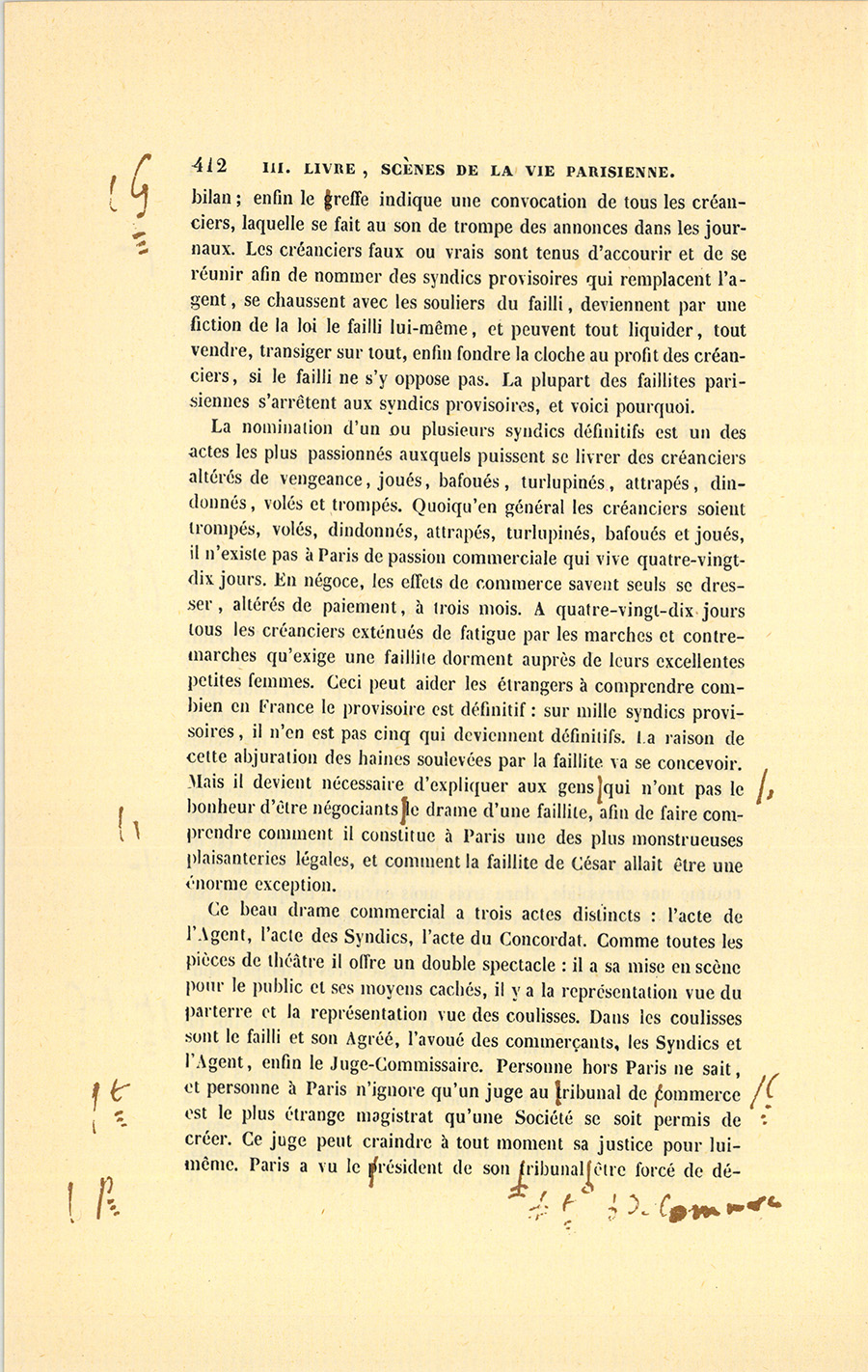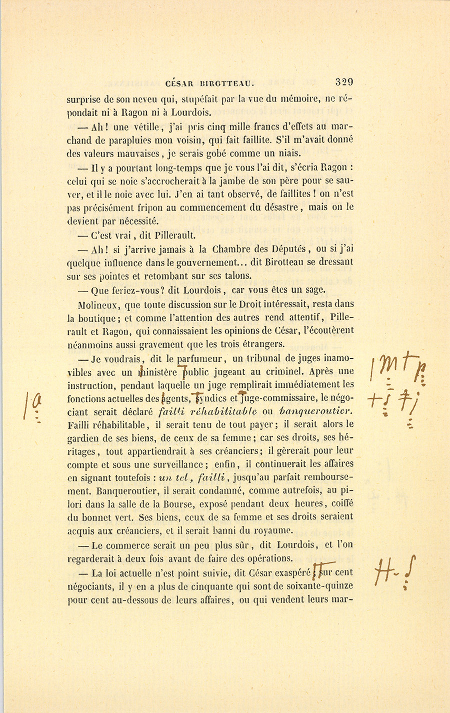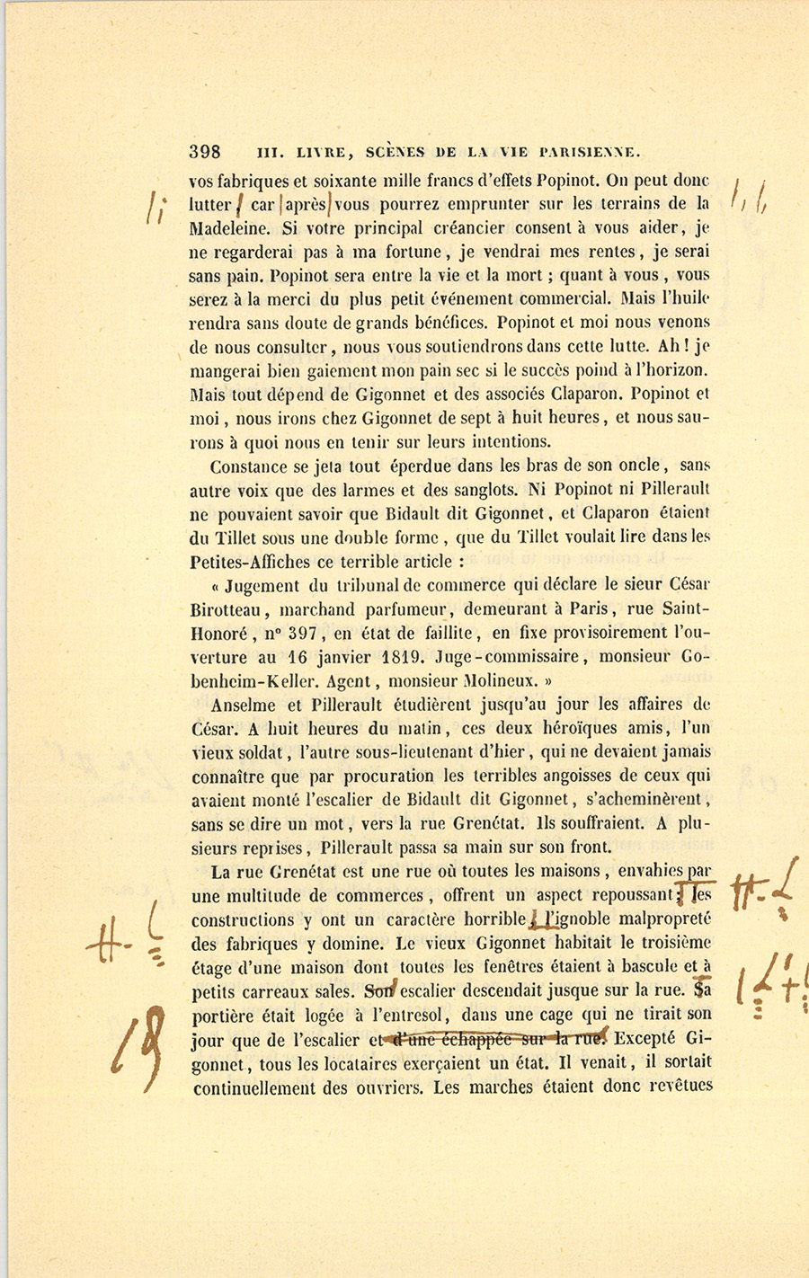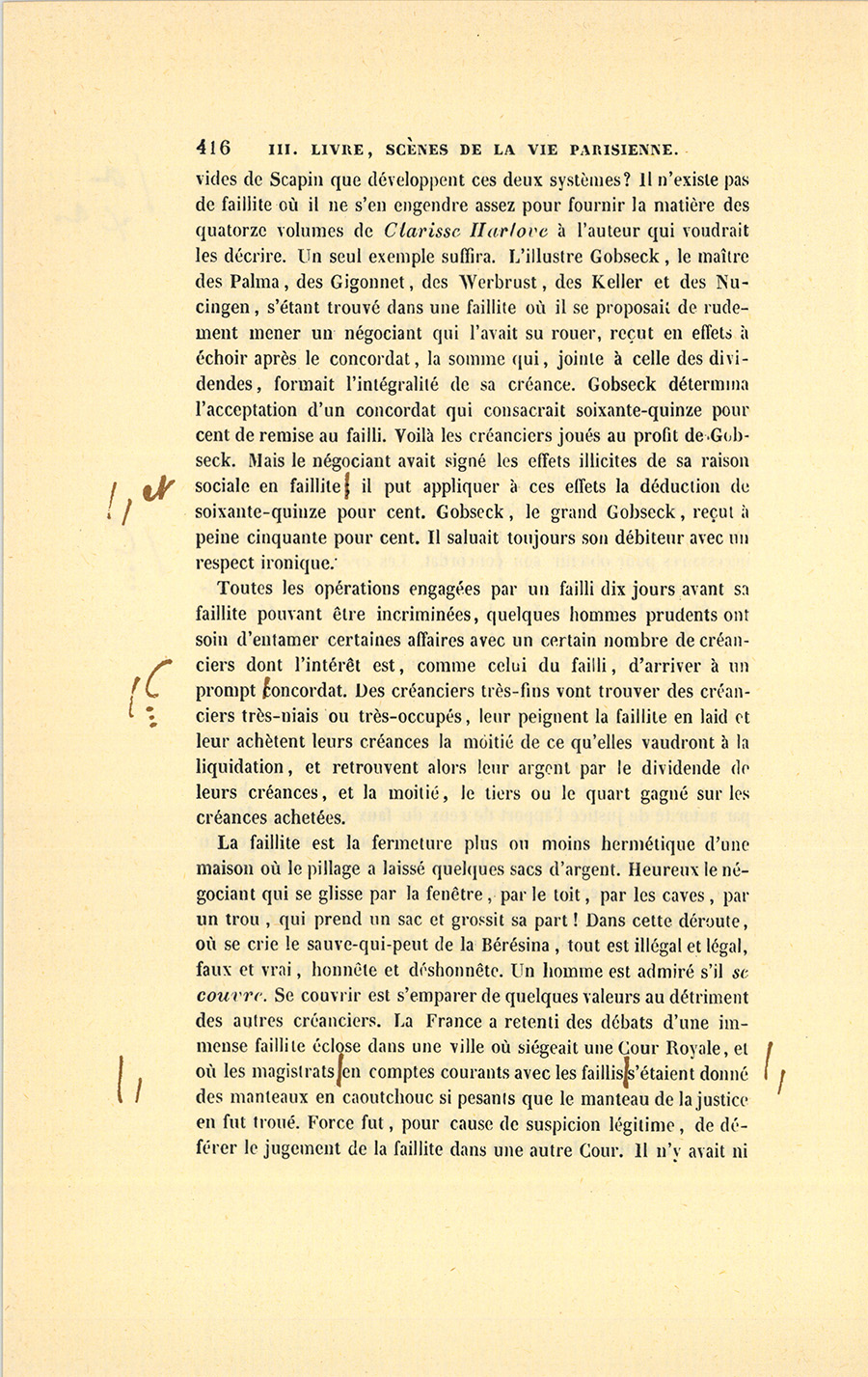 {p. 444} Messieurs, dit le célèbre magistrat, le 16 janvier 1820, Birotteau fut déclaré en état de faillite, par un jugement du Tribunal de Commerce de la Seine. Le dépôt du bilan n’était occasionné ni par l’imprudence de ce commerçant, ni par de fausses spéculations, ni par aucune raison qui pût entacher son honneur. Nous éprouvons le besoin de le dire hautement : ce malheur fut causé par un de ces désastres qui se sont renouvelés à la grande douleur de la Justice et de la Ville de Paris. Il était réservé à notre siècle, où fermentera long-temps encore le mauvais levain des mœurs et des idées révolutionnaires, de voir le Notariat de Paris s’écartant des glorieuses traditions des siècles précédents, et produisant en quelques années autant de faillites qu’il s’en est rencontré dans deux siècles sous l’ancienne monarchie. La soif de l’or rapidement acquis a gagné les officiers ministériels, ces tuteurs de la fortune publique, ces magistrats intermédiaires !