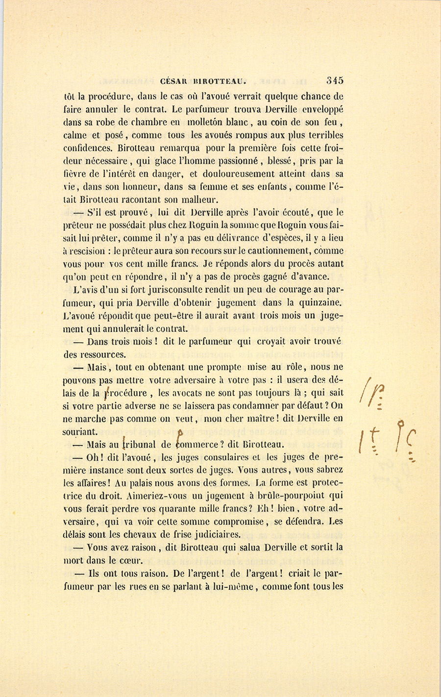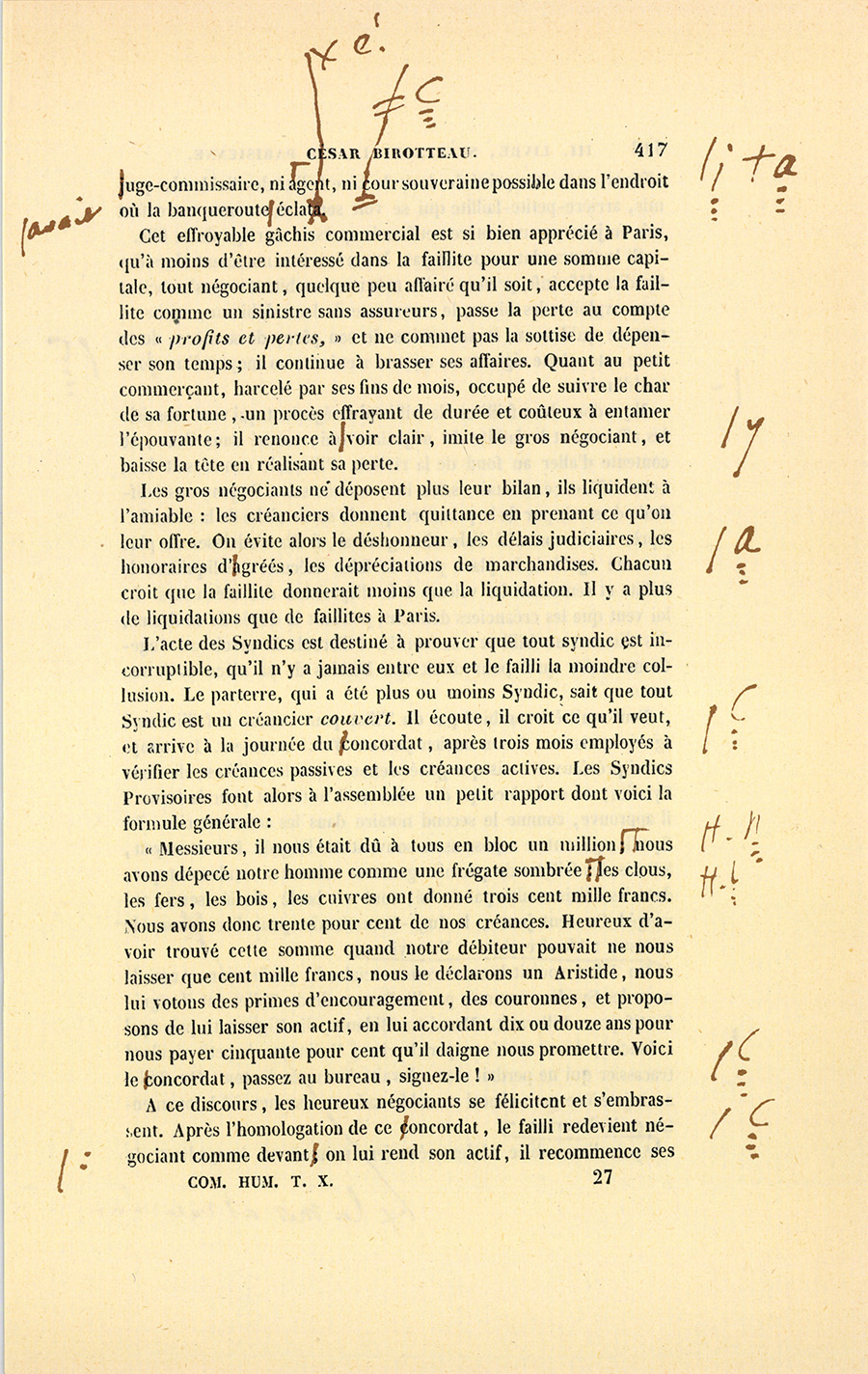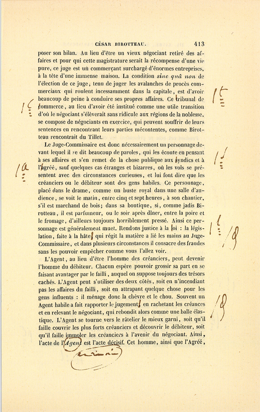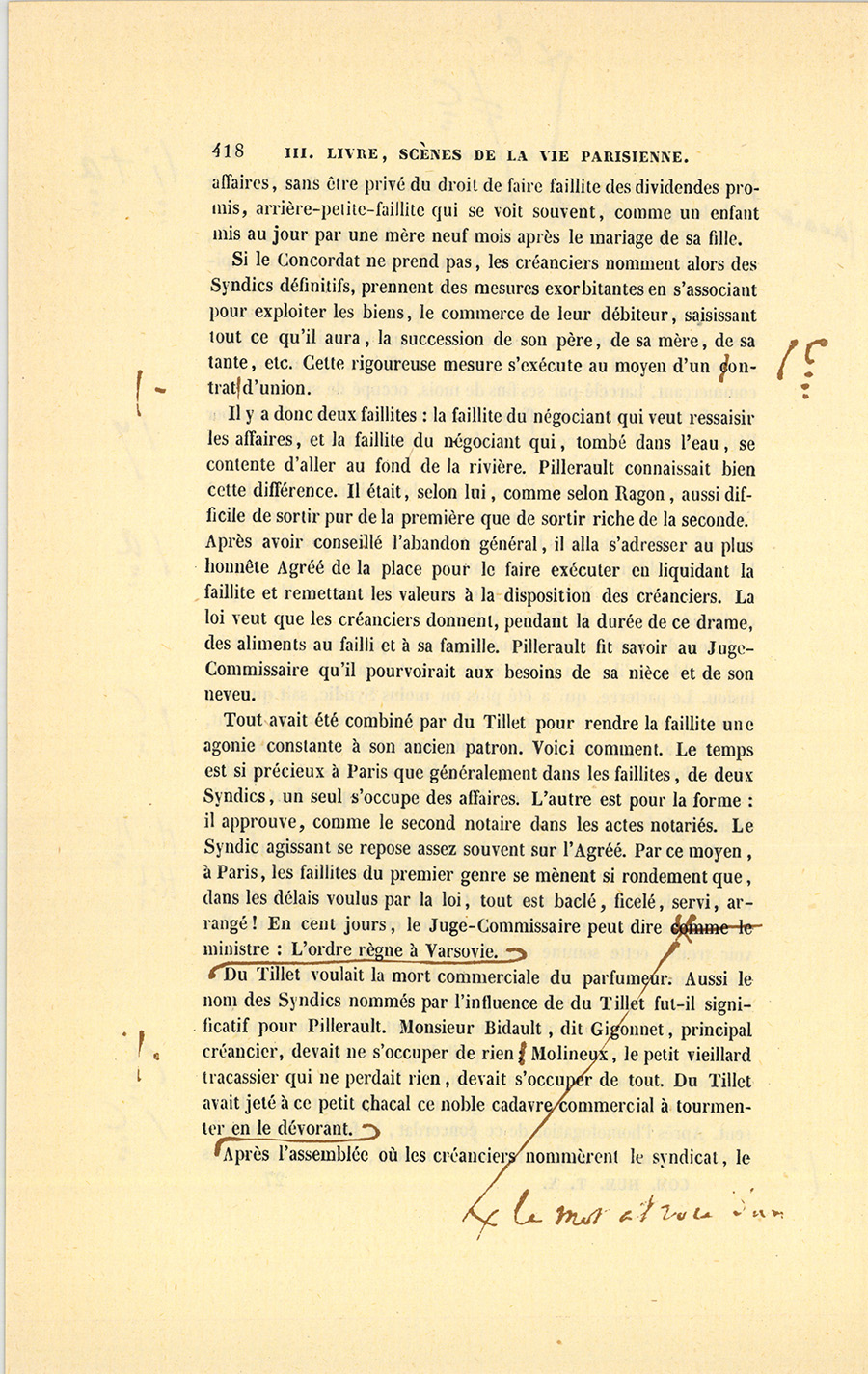 {p. 444} Messieurs, dit le célèbre magistrat, le 16 janvier 1820, Birotteau fut déclaré en état de faillite, par un jugement du Tribunal de Commerce de la Seine. Le dépôt du bilan n’était occasionné ni par l’imprudence de ce commerçant, ni par de fausses spéculations, ni par aucune raison qui pût entacher son honneur. Nous éprouvons le besoin de le dire hautement : ce malheur fut causé par un de ces désastres qui se sont renouvelés à la grande douleur de la Justice et de la Ville de Paris. Il était réservé à notre siècle, où fermentera long-temps encore le mauvais levain des mœurs et des idées révolutionnaires, de voir le Notariat de Paris s’écartant des glorieuses traditions des siècles précédents, et produisant en quelques années autant de faillites qu’il s’en est rencontré dans deux siècles sous l’ancienne monarchie. La soif de l’or rapidement acquis a gagné les officiers ministériels, ces tuteurs de la fortune publique, ces magistrats intermédiaires !