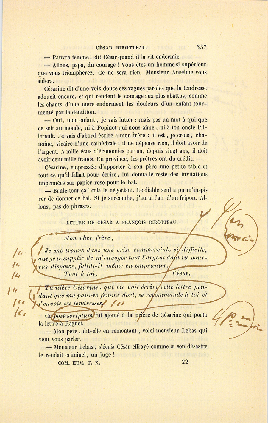 – Monsieur Birotteau, dit le vicomte de Vandenesse, vos efforts pour payer vos créanciers ont été par hasard connus du roi. Sa Majesté, touchée d’une conduite si rare, et sachant que, par humilité, vous ne portiez pas l’ordre de la Légion-d’Honneur, m’envoie {p. 438} vous ordonner d’en reprendre l’insigne. Puis, voulant vous aider à remplir vos obligations, elle m’a chargé de vous remettre cette somme, prise sur sa cassette particulière, en regrettant de ne pouvoir faire davantage. Que ceci demeure dans un profond secret. Sa Majesté trouve peu royale la divulgation officielle de ses bonnes œuvres, dit le secrétaire intime en remettant six mille francs à l’employé qui pendant ce discours éprouvait des sensations inexprimables.