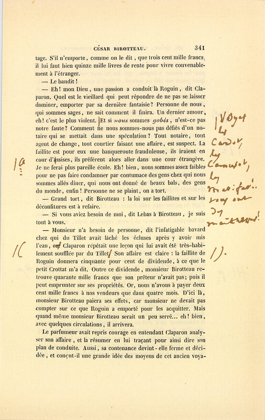 – Laisse-moi donc continuer. Roguin s’y met, et tu me dis que l’affaire ne vaut rien ? Est-ce raisonnable ? Tu me dis encore : Il fait une chose contre la loi. Mais il s’y mettra ostensiblement s’il le faut. Tu me dis maintenant : Il est riche. Ne peut-on pas m’en dire autant à moi ? Ragon et Pillerault seraient-ils bien venus à me dire : Pourquoi faites-vous cette affaire, vous qui avez de l’argent comme un marchand de cochons ?