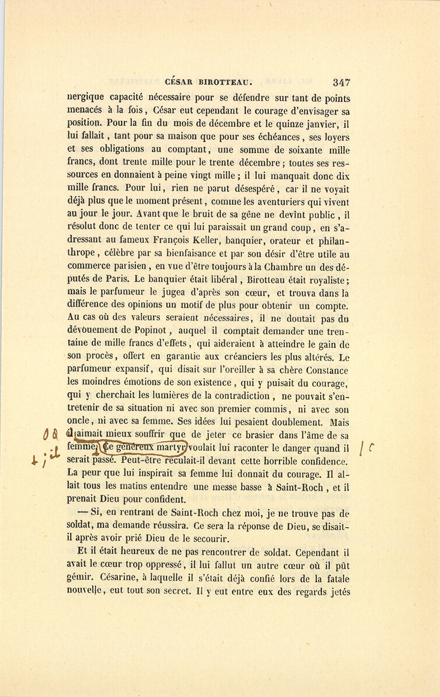 – Enfin, ma conscience est bien intacte, dit César en continuant. Les gens qui vendent, vendent par nécessité ; nous ne les volons pas plus qu’on ne vole ceux à qui on achète des rentes à soixante-quinze. Aujourd’hui, nous acquérons les terrains à leur prix d’aujourd’hui ; dans deux ans, ce sera différent, comme pour les rentes. Sachez, Constance-Barbe-Joséphine Pillerault, que vous ne prendrez jamais César Birotteau à faire une action qui soit contre la plus rigide probité, ni contre la loi, ni contre la conscience, ni contre la délicatesse. Un homme établi depuis dix-huit ans être soupçonné d’improbité dans son ménage !