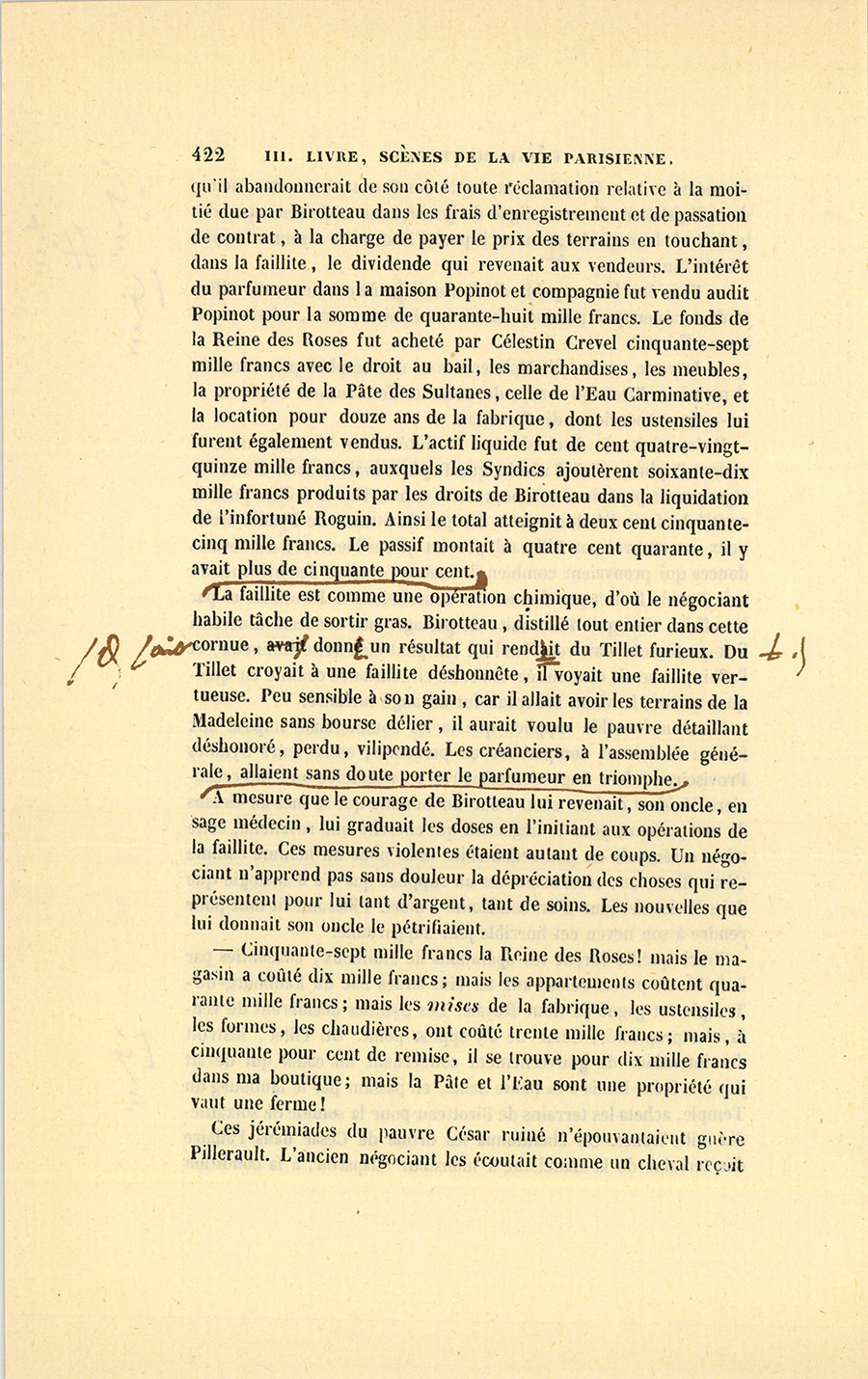 – Eh ! bien, j’ai toujours considéré monsieur Birotteau comme mon associé, reprit-il, nous pouvons disposer de cette somme pour rembourser ses créanciers. En l’ajoutant à celle de vingt-huit mille francs de vos économies placés par notre oncle Pillerault, nous avons cent soixante et un mille francs. Notre oncle ne nous refusera pas quittance de ses vingt-cinq mille francs. Aucune puissance humaine ne peut m’empêcher de prêter à mon beau-père, en {p. 436} compte sur les bénéfices de l’année prochaine, la somme nécessaire à parfaire les sommes dues à ses créanciers… Et… il… sera… réhabilité.