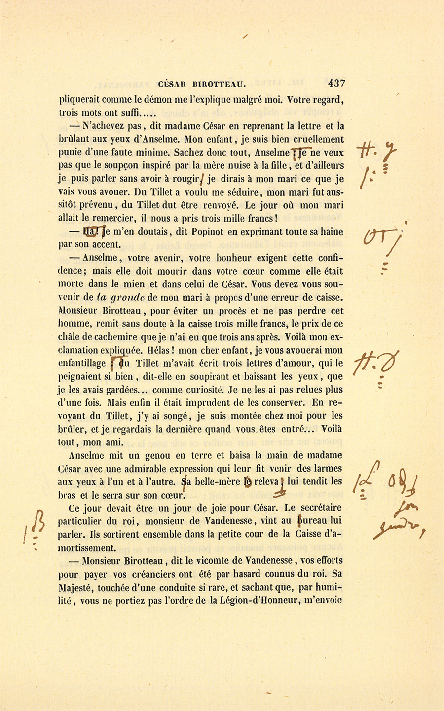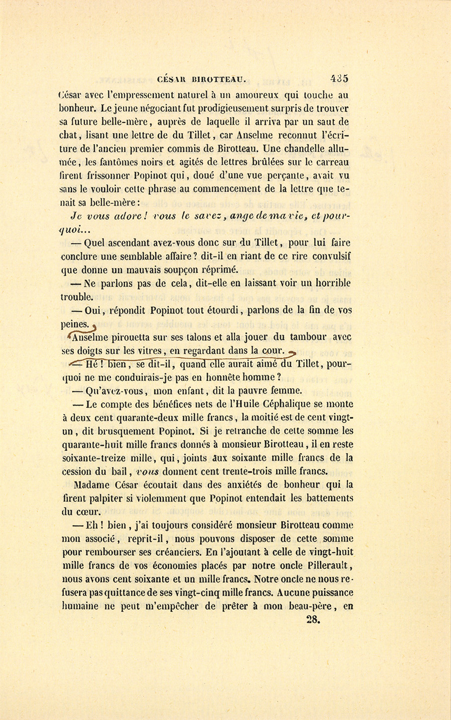 – N’achevez pas, dit madame César en reprenant la lettre et la brûlant aux yeux d’Anselme. Mon enfant, je suis bien cruellement punie d’une faute minime. Sachez donc tout, Anselme. Je ne veux pas que le soupçon inspiré par la mère nuise à la fille, et d’ailleurs je puis parler sans avoir à rougir : je dirais à mon mari ce que je vais vous avouer. Du Tillet a voulu me séduire, mon mari fut aussitôt prévenu, du Tillet dut être renvoyé. Le jour où mon mari allait le remercier, il nous a pris trois mille francs !