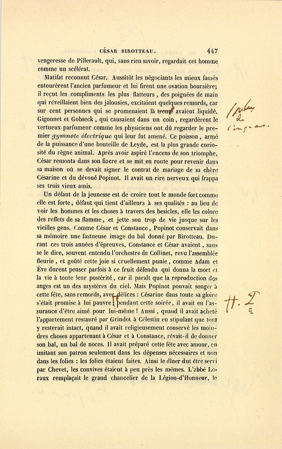 Matifat reconnut César. Aussitôt les négociants les mieux famés entourèrent l’ancien parfumeur et lui firent une ovation boursière ; il reçut les compliments les plus flatteurs, des poignées de main qui réveillaient bien des jalousies, excitaient quelques remords, car sur cent personnes qui se promenaient là plus de cinquante avaient liquidé. Gigonnet et Gobseck, qui causaient dans un coin, regardèrent le vertueux parfumeur comme les physiciens ont dû regarder le premier gymnote électrique qui leur fut amené. Ce poisson, armé de la puissance d’une bouteille de Leyde, est la plus grande curiosité du règne animal. Après avoir aspiré l’encens de son triomphe, César remonta dans son fiacre et se mit en route pour revenir dans sa maison où se devait signer le contrat de mariage de sa chère Césarine et du dévoué Popinot. Il avait un rire nerveux qui frappa ses trois vieux amis.