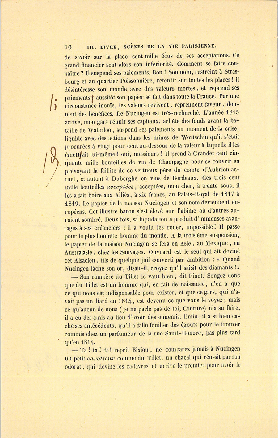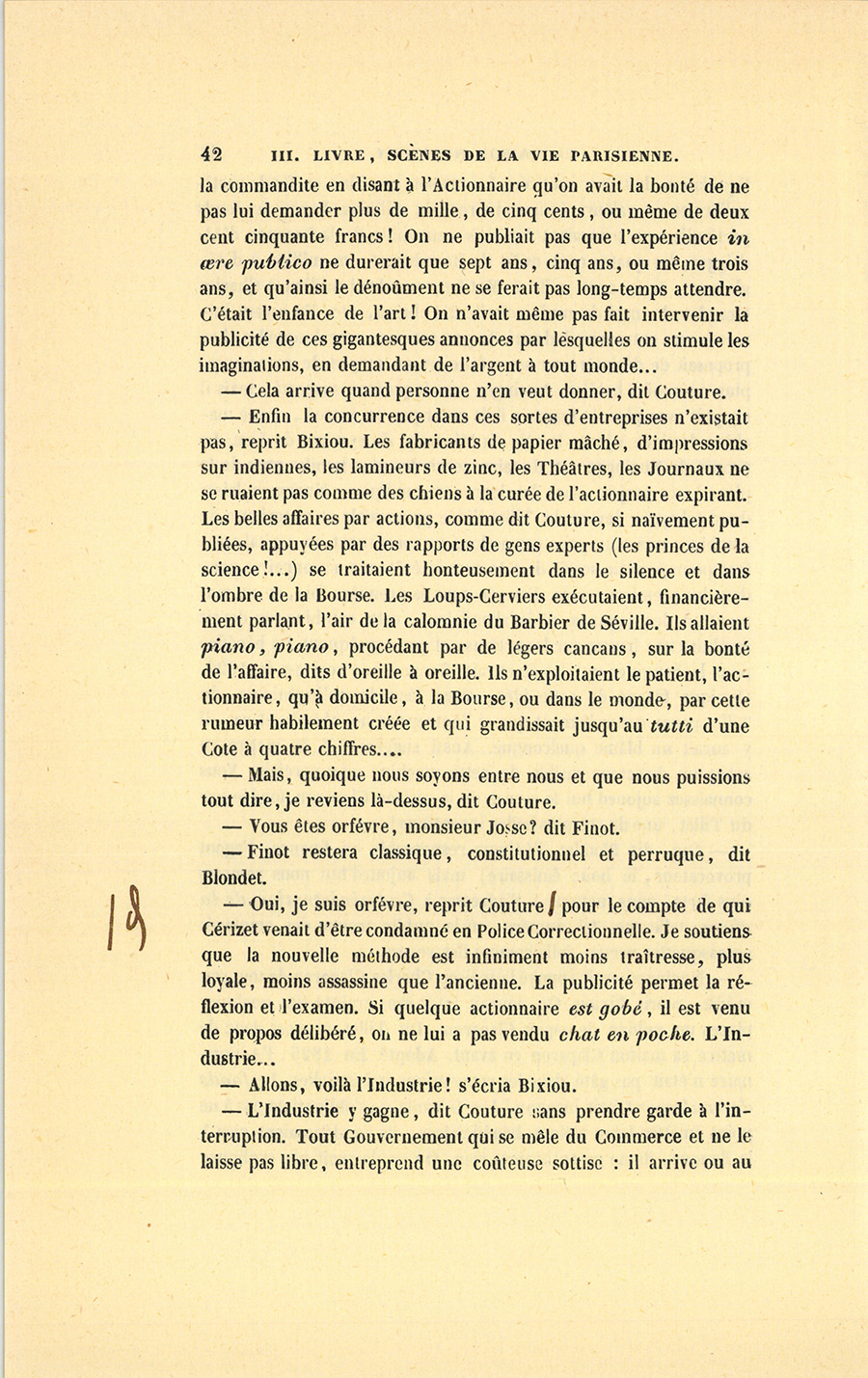 – Nucingen avait appuyé la maison Charles Claparon de tout son crédit, reprit Bixiou. On pouvait jeter sans crainte sur quelques places un million de papier Claparon. Du Tillet proposa donc de mettre sa maison Claparon en avant. Adopté. En 1825, l’Actionnaire n’était pas gâté dans les conceptions industrielles. Le fonds de roulement était inconnu ! Les Gérants ne s’obligeaient pas à ne point émettre leurs actions bénéficiaires, ils ne déposaient rien à la Banque, ils ne garantissaient rien. On ne daignait pas expliquer {p. 42} la commandite en disant à l’Actionnaire qu’on avait la bonté de ne pas lui demander plus de mille, de cinq cents, ou même de deux cent cinquante francs ! On ne publiait pas que l’expérience in ære publico ne durerait que sept ans, cinq ans, ou même trois ans, et qu’ainsi le dénoûment ne se ferait pas long-temps attendre. C’était l’enfance de l’art ! On n’avait même pas fait intervenir la publicité de ces gigantesques annonces par lesquelles on stimule les imaginations, en demandant de l’argent à tout le monde9…