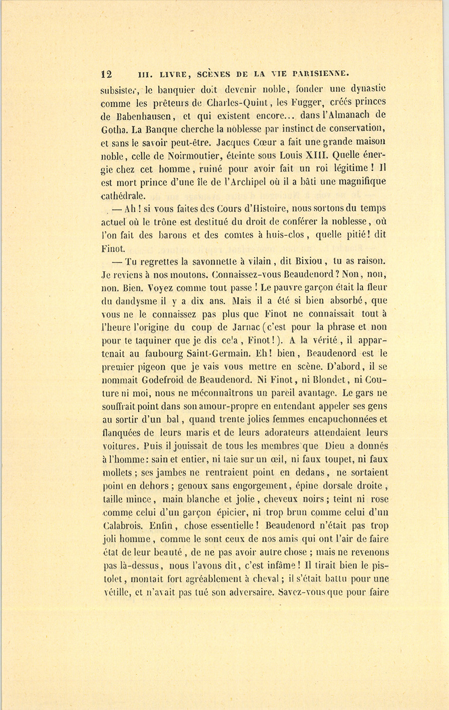 – Ah ! si vous faites des Cours d’Histoire, nous sortons du temps actuel où le trône est destitué du droit de conférer la noblesse, où l’on fait des barons et des comtes à huis-clos, quelle pitié ! dit Finot.