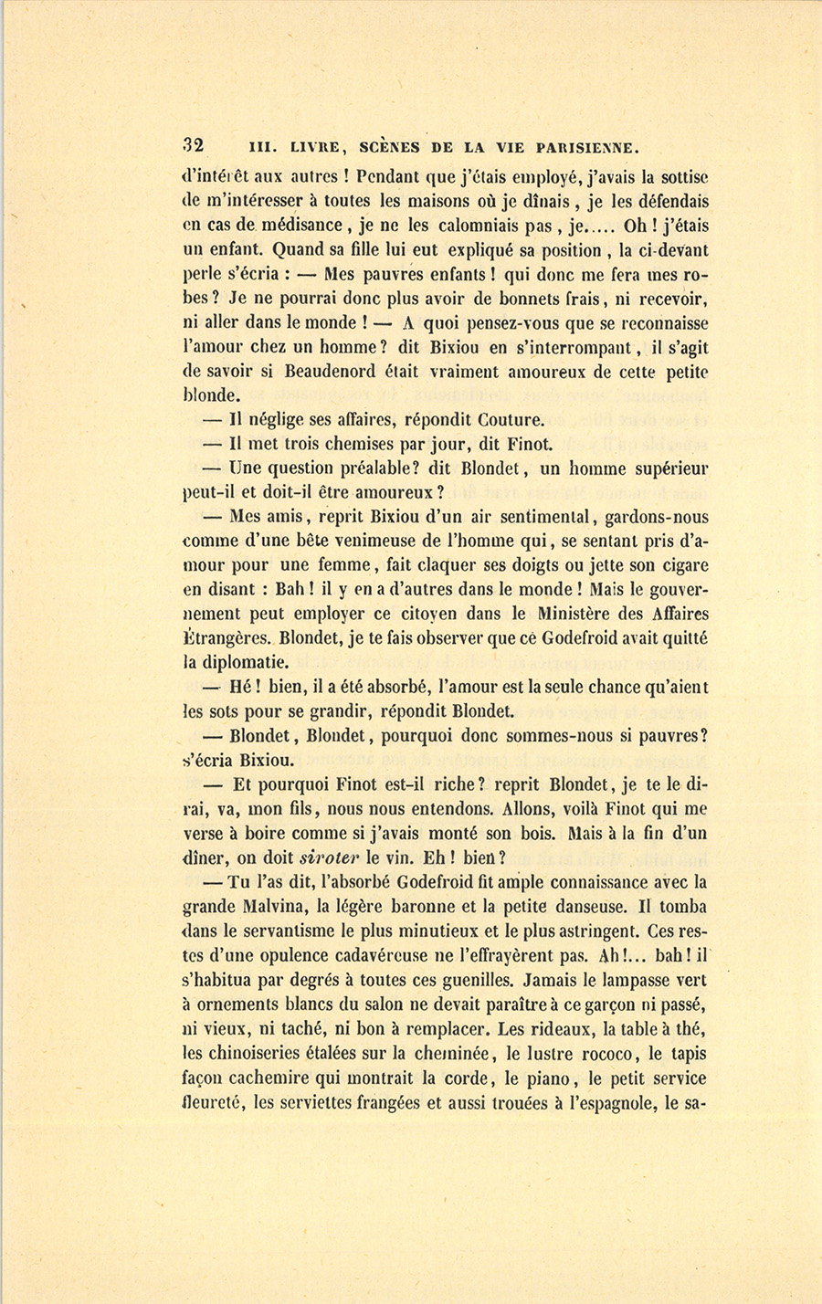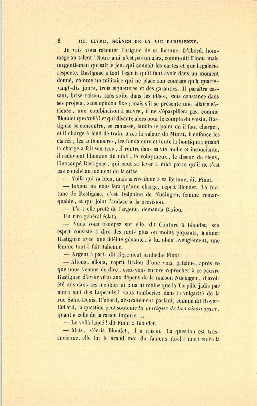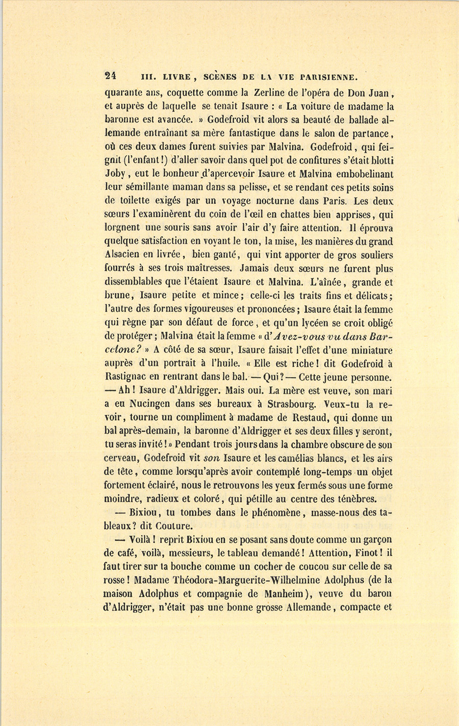 – Pas le moins du monde. Il s’agit de Rastignac, dont la douleur serait selon vous une preuve de sa corruption, car alors il aimait beaucoup moins Delphine ! Mais que voulez-vous ? le pauvre garçon avait cette épine au cœur. C’est un gentilhomme profondément dépravé, voyez-vous, et nous sommes de vertueux artistes. Donc, Rastignac voulait enrichir Delphine, lui pauvre, elle riche ! {p. 9} Le croirez-vous ?… il y est parvenu. Rastignac, qui se serait battu comme Jarnac, passa dès lors à l’opinion de Henri II, en vertu de son grand mot : Il n’y a pas de vertu absolue, mais des circonstances. Ceci tient à l’histoire de sa fortune.
