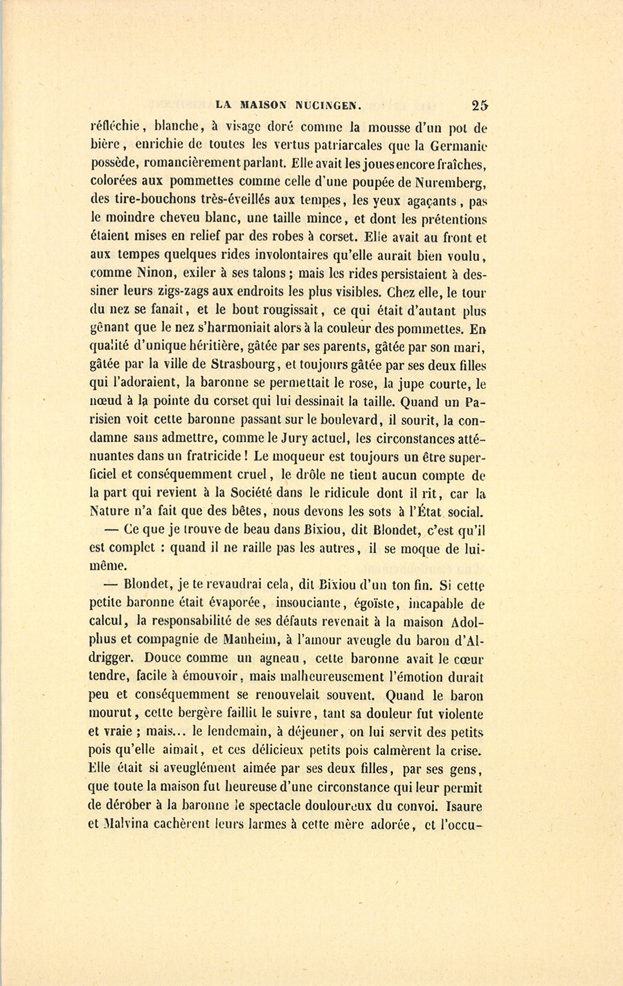 – Voilà ! reprit Bixiou en se posant sans doute comme un garçon de café, voilà, messieurs, le tableau demandé ! Attention, Finot ! il faut tirer sur ta bouche comme un cocher de coucou sur celle de sa rosse ! Madame Théodora-Marguerite-Wilhelmine Adolphus (de la maison Adolphus et compagnie de Manheim), veuve du baron d’Aldrigger, n’était pas une bonne grosse Allemande, compacte et {p. 25} réfléchie, blanche, à visage doré comme la mousse d’un pot de bière, enrichie de toutes les vertus patriarcales que la Germanie possède, romancièrement parlant. Elle avait les joues encore fraîches, colorées aux pommettes comme celles3 d’une poupée de Nuremberg, des tire-bouchons très-éveillés aux tempes, les yeux agaçants, pas le moindre cheveu blanc, une taille mince, et dont les prétentions étaient mises en relief par des robes à corset. Elle avait au front et aux tempes quelques rides involontaires qu’elle aurait bien voulu, comme Ninon, exiler à ses talons ; mais les rides persistaient à dessiner leurs zigs-zags aux endroits les plus visibles. Chez elle, le tour du nez se fanait, et le bout rougissait, ce qui était d’autant plus gênant que le nez s’harmoniait alors à la couleur des pommettes. En qualité d’unique héritière, gâtée par ses parents, gâtée par son mari, gâtée par la ville de Strasbourg, et toujours gâtée par ses deux filles qui l’adoraient, la baronne se permettait le rose, la jupe courte, le nœud à la pointe du corset qui lui dessinait la taille. Quand un Parisien voit cette baronne passant sur le boulevard, il sourit, la condamne sans admettre, comme le Jury actuel, les circonstances atténuantes dans un fratricide ! Le moqueur est toujours un être superficiel et conséquemment cruel, le drôle ne tient aucun compte de la part qui revient à la Société dans le ridicule dont il rit, car la Nature n’a fait que des bêtes, nous devons les sots à l’État social.