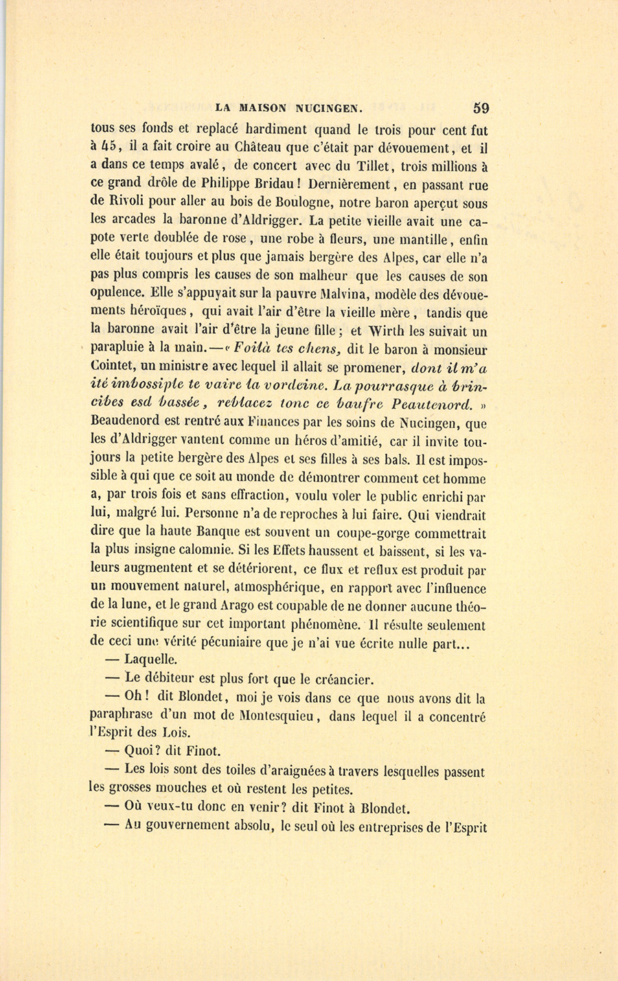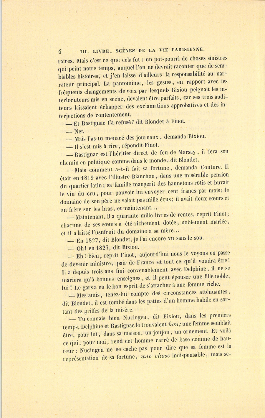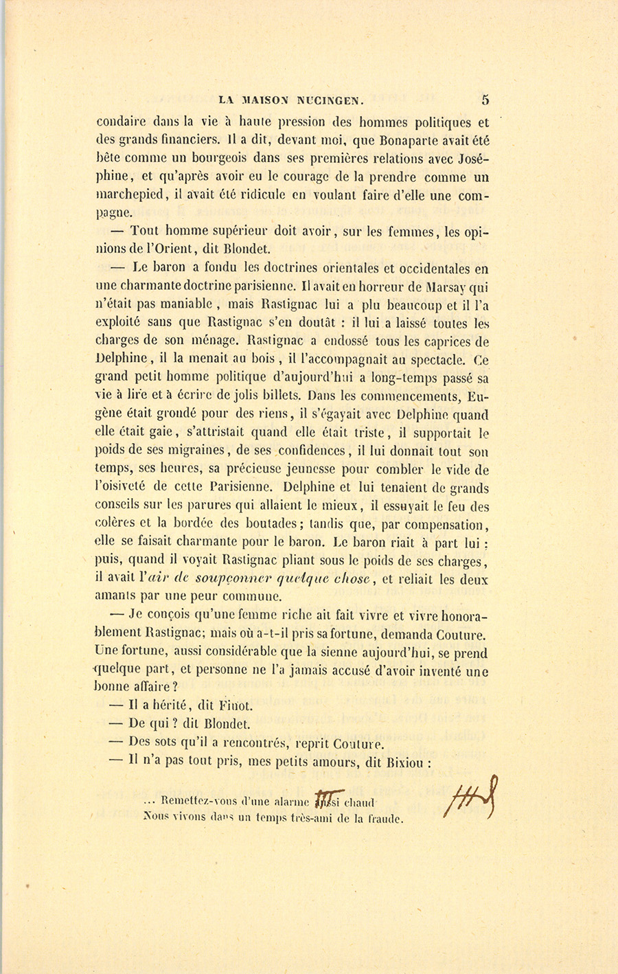 – Tu connais bien Nucingen, dit Bixiou, dans les premiers temps, Delphine et Rastignac le trouvaient bon ; une femme semblait être, pour lui, dans sa maison, un joujou, un ornement. Et voilà ce qui, pour moi, rend cet homme carré de base comme de hauteur : Nucingen ne se cache pas pour dire que sa femme est la représentation de sa fortune, une chose indispensable, mais {p. 5} secondaire dans la vie à haute pression des hommes politiques et des grands financiers. Il a dit, devant moi, que Bonaparte avait été bête comme un bourgeois dans ses premières relations avec Joséphine, et qu’après avoir eu le courage de la prendre comme un marchepied, il avait été ridicule en voulant faire d’elle une compagne.