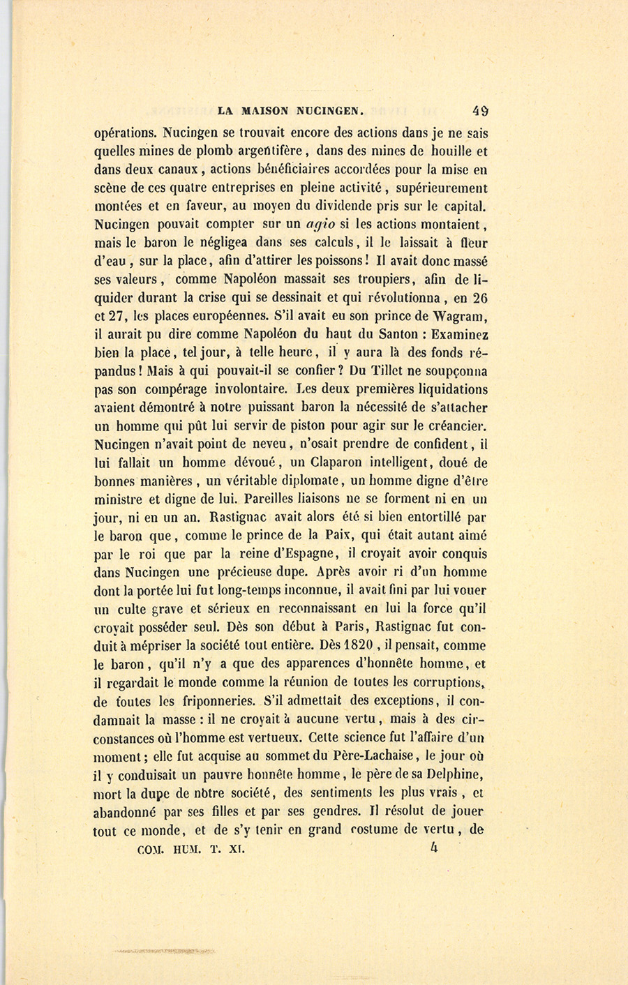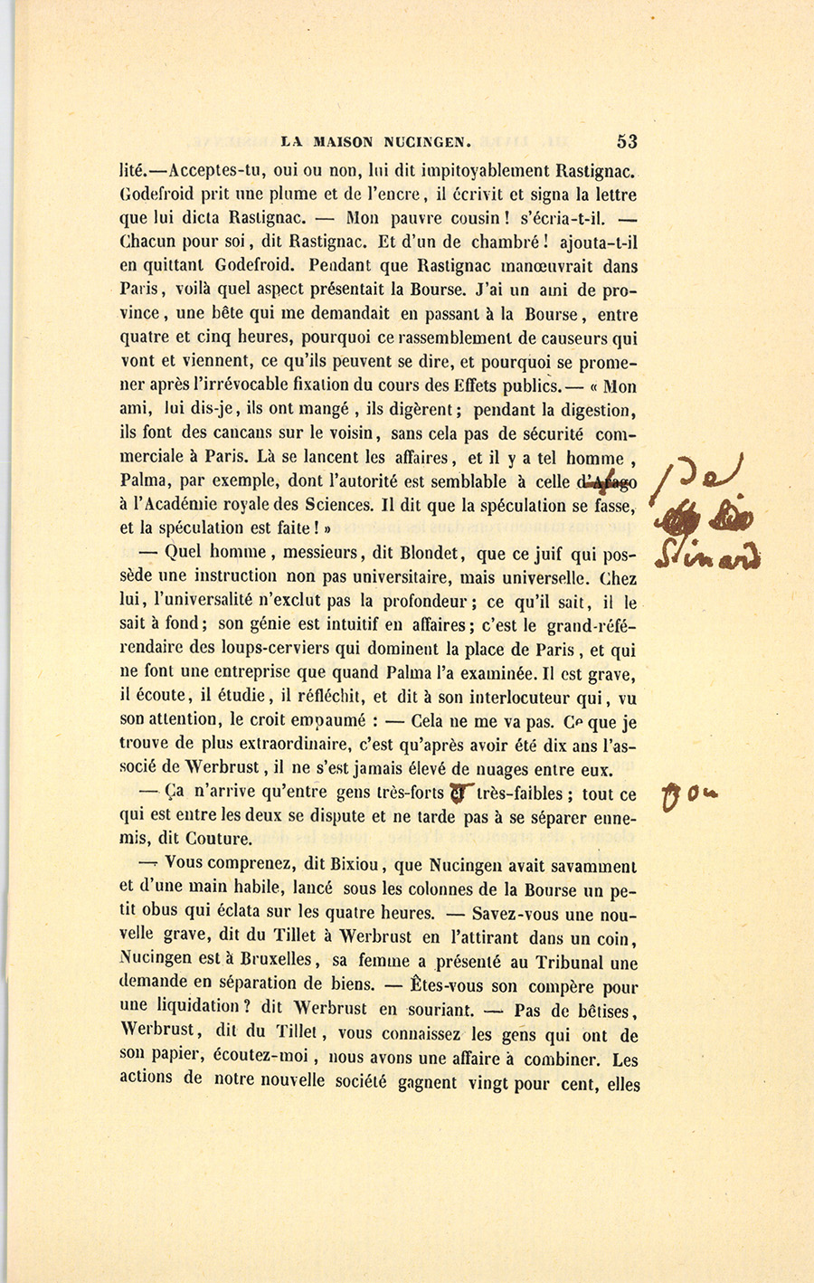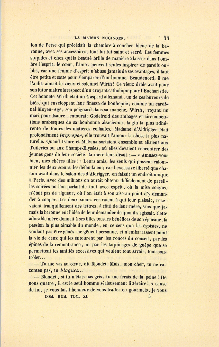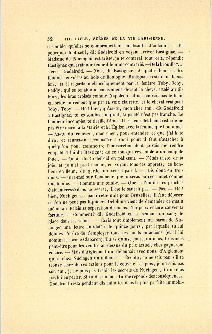 – Tu connais bien Nucingen, dit Bixiou, dans les premiers temps, Delphine et Rastignac le trouvaient bon ; une femme semblait être, pour lui, dans sa maison, un joujou, un ornement. Et voilà ce qui, pour moi, rend cet homme carré de base comme de hauteur : Nucingen ne se cache pas pour dire que sa femme est la représentation de sa fortune, une chose indispensable, mais {p. 5} secondaire dans la vie à haute pression des hommes politiques et des grands financiers. Il a dit, devant moi, que Bonaparte avait été bête comme un bourgeois dans ses premières relations avec Joséphine, et qu’après avoir eu le courage de la prendre comme un marchepied, il avait été ridicule en voulant faire d’elle une compagne.