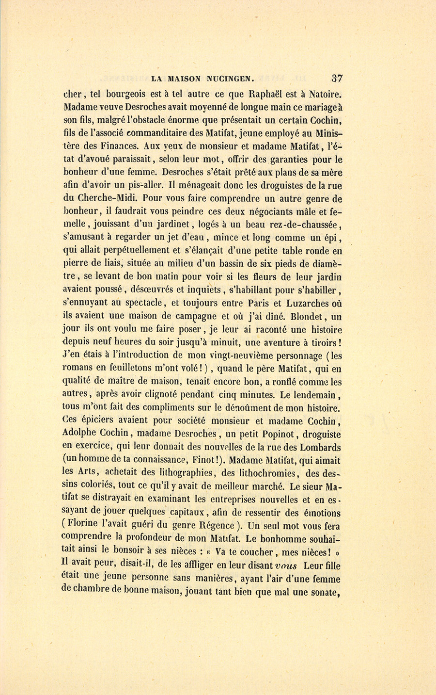 – Eh ! bien, oui, celui de Lousteau, le nôtre, enfin ! Ces Matifat, alors perdus pour nous, étaient venus habiter la rue du Cherche-Midi, le quartier le plus opposé à la rue des Lombards où ils avaient fait fortune. Moi, je les ai cultivés, les Matifat ! Durant mon temps de galère ministérielle, où j’étais serré pendant huit heures de jour entre des niais à vingt-deux carats, j’ai vu des originaux qui m’ont convaincu que l’ombre a des aspérités, et que dans la plus grande platitude on peut rencontrer des angles ! Oui, mon {p. 37} cher, tel bourgeois est à tel autre ce que Raphaël est à Natoire. Madame veuve Desroches avait moyenné de longue main ce mariage à son fils, malgré l’obstacle énorme que présentait un certain Cochin, fils de l’associé commanditaire des Matifat, jeune employé au Ministère des Finances. Aux yeux de monsieur et madame Matifat, l’état d’avoué paraissait, selon leur mot, offrir des garanties pour le bonheur d’une femme. Desroches s’était prêté aux plans de sa mère afin d’avoir un pis-aller. Il ménageait donc les droguistes de la rue du Cherche-Midi. Pour vous faire comprendre un autre genre de bonheur, il faudrait vous peindre ces deux négociants mâle et femelle, jouissant d’un jardinet, logés à un beau rez-de-chaussée, s’amusant à regarder un jet d’eau, mince et long comme un épi, qui allait perpétuellement et s’élançait d’une petite table ronde en pierre de liais, située au milieu d’un bassin de six pieds de diamètre, se levant de bon matin pour voir si les fleurs de leur jardin avaient poussé, désœuvrés et inquiets, s’habillant pour s’habiller, s’ennuyant au spectacle, et toujours entre Paris et Luzarches où ils avaient une maison de campagne et où j’ai dîné. Blondet, un jour ils ont voulu me faire poser, je leur ai raconté une histoire depuis neuf heures du soir jusqu’à minuit, une aventure à tiroirs ! J’en étais à l’introduction de mon vingt-neuvième personnage (les romans en feuilletons m’ont volé !), quand le père Matifat, qui en qualité de maître de maison, tenait encore bon, a ronflé comme les autres, après avoir clignoté pendant cinq minutes. Le lendemain, tous m’ont fait des compliments sur le dénoûment de mon histoire. Ces épiciers avaient pour société monsieur et madame Cochin, Adolphe Cochin, madame Desroches, un petit Popinot, droguiste en exercice, qui leur donnait des nouvelles de la rue des Lombards (un homme de ta connaissance, Finot !). Madame Matifat, qui aimait les Arts, achetait des lithographies, des lithochromies, des dessins coloriés, tout ce qu’il y avait de meilleur marché. Le sieur Matifat se distrayait en examinant les entreprises nouvelles et en essayant de jouer quelques capitaux, afin de ressentir des émotions (Florine l’avait guéri du genre Régence). Un seul mot vous fera comprendre la profondeur de mon Matifat. Le bonhomme souhaitait ainsi le bonsoir à ses nièces : « Va te coucher, mes nièces ! » Il avait peur, disait-il, de les affliger en leur disant vous. Leur fille était une jeune personne sans manières, ayant l’air d’une femme de chambre de bonne maison, jouant tant bien que mal une sonate, {p. 38} ayant une jolie écriture anglaise, sachant le français et l’orthographe, enfin une complète éducation bourgeoise. Elle était assez impatiente d’être mariée, afin de quitter la maison paternelle, où elle s’ennuyait comme un officier de marine au quart de nuit, il faut dire aussi que le quart durait toute la journée. Desroches ou Cochin fils, un notaire ou un garde-du-corps, un faux lord anglais, tout mari lui était bon. Comme évidemment elle ne savait rien de la vie, j’en ai eu pitié, j’ai voulu lui en révéler le grand mystère. Bah ! les Matifat m’ont fermé leur porte : les bourgeois et moi nous ne nous comprendrons jamais.