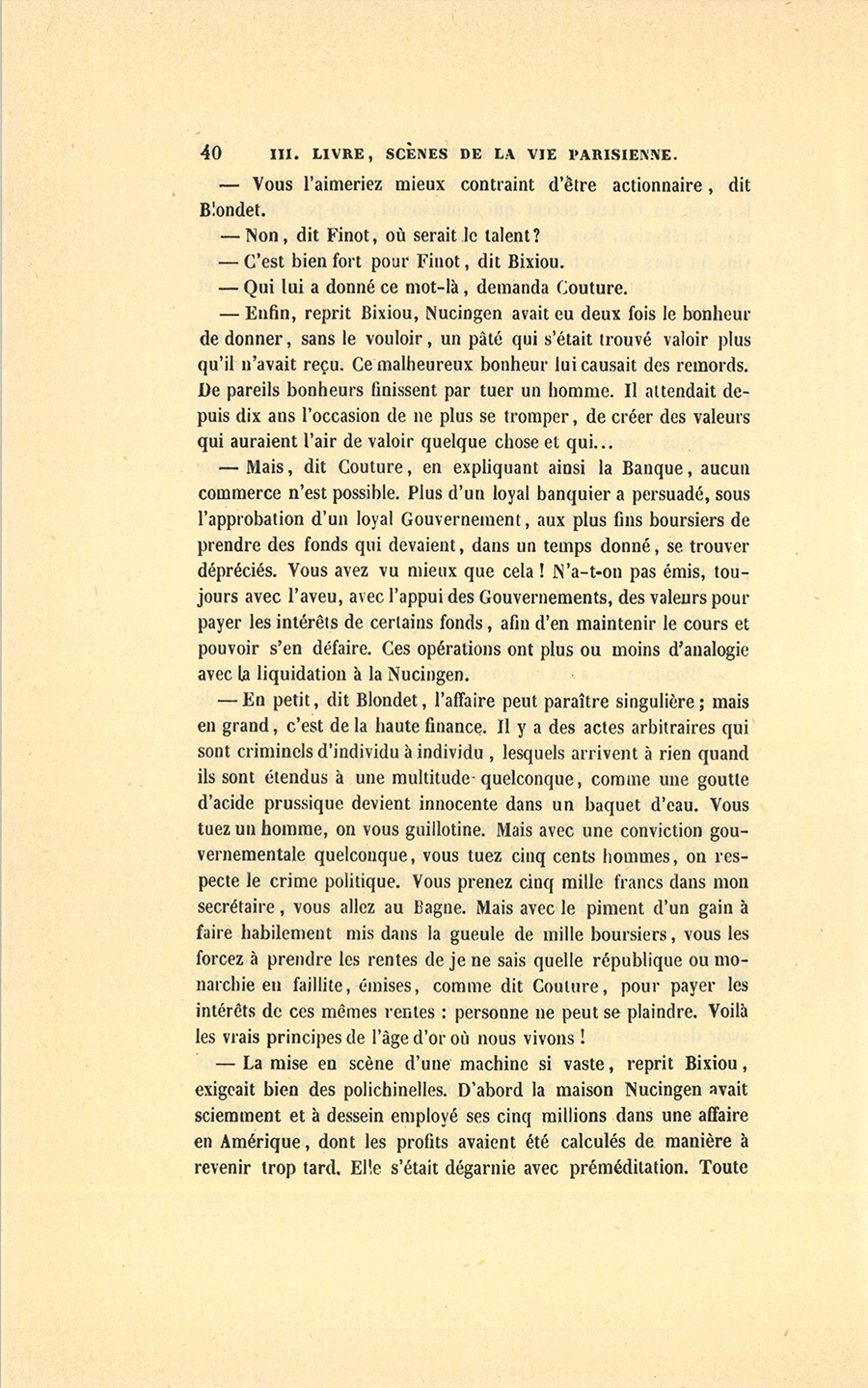 – En petit, dit Blondet, l’affaire peut paraître singulière ; mais en grand, c’est de la haute finance. Il y a des actes arbitraires qui sont criminels d’individu à individu, lesquels arrivent à rien quand ils sont étendus à une multitude quelconque, comme une goutte d’acide prussique devient innocente dans un baquet d’eau. Vous tuez un homme, on vous guillotine. Mais avec une conviction gouvernementale quelconque, vous tuez cinq cents hommes, on respecte le crime politique. Vous prenez cinq mille francs dans mon secrétaire, vous allez au Bagne. Mais avec le piment d’un gain à faire habilement mis dans la gueule de mille boursiers, vous les forcez à prendre les rentes de je ne sais quelle république ou monarchie en faillite, émises, comme dit Couture, pour payer les intérêts de ces mêmes rentes : personne ne peut se plaindre. Voilà les vrais principes de l’âge d’or où nous vivons !