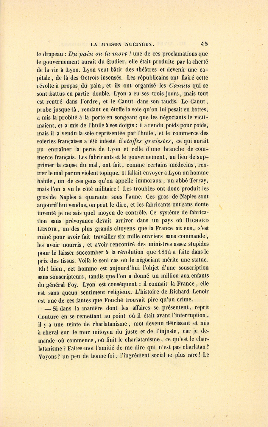 – Voici, reprit Blondet. On a beaucoup parlé des affaires de Lyon, de la République canonnée dans les rues, personne n’a dit la vérité. La République s’était emparée de l’émeute comme un insurgé s’empare d’un fusil. La vérité, je vous la donne pour drôle et profonde. Le commerce de Lyon est un commerce sans âme, qui ne fait pas fabriquer une aune de soie sans qu’elle soit commandée et que le paiement soit sûr. Quand la commande s’arrête, l’ouvrier meurt de faim, il gagne à peine de quoi vivre en travaillant, les forçats sont plus heureux que lui. Après la révolution de juillet, la misère est arrivée à ce point que les Canuts ont arboré {p. 45} le drapeau : Du pain ou la mort ! une de ces proclamations que le gouvernement aurait dû étudier, elle était produite par la cherté de la vie à Lyon. Lyon veut bâtir des théâtres et devenir une capitale, de là des Octrois insensés. Les républicains ont flairé cette révolte à propos du pain, et ils ont organisé les Canuts qui se sont battus en partie double. Lyon a eu ses trois jours, mais tout est rentré dans l’ordre, et le Canut dans son taudis. Le Canut, probe jusque-là, rendant en étoffe la soie qu’on lui pesait en bottes, a mis la probité à la porte en songeant que les négociants le victimaient, et a mis de l’huile à ses doigts : il a rendu poids pour poids, mais il a vendu la soie représentée par l’huile, et le commerce des soieries françaises a été infesté d’étoffes graissées, ce qui aurait pu entraîner la perte de Lyon et celle d’une branche de commerce français. Les fabricants et le gouvernement, au lieu de supprimer la cause du mal, ont fait, comme certains médecins, rentrer le mal par un violent topique. Il fallait envoyer à Lyon un homme habile, un de ces gens qu’on appelle immoraux, un abbé Terray, mais l’on a vu le côté militaire ! Les troubles ont donc produit les gros de Naples à quarante sous l’aune. Ces gros de Naples sont aujourd’hui vendus, on peut le dire, et les fabricants ont sans doute inventé je ne sais quel moyen de contrôle. Ce système de fabrication sans prévoyance devait arriver dans un pays où Richard Lenoir, un des plus grands citoyens que la France ait eus, s’est ruiné pour avoir fait travailler six mille ouvriers sans commande, les avoir nourris, et avoir rencontré des ministres assez stupides pour le laisser succomber à la révolution que 1814 a faite dans le prix des tissus. Voilà le seul cas où le négociant mérite une statue. Eh ! bien, cet homme est aujourd’hui l’objet d’une souscription sans souscripteurs, tandis que l’on a donné un million aux enfants du général Foy. Lyon est conséquent : il connaît la France, elle est sans aucun sentiment religieux. L’histoire de Richard Lenoir est une de ces fautes que Fouché trouvait pires10 qu’un crime.