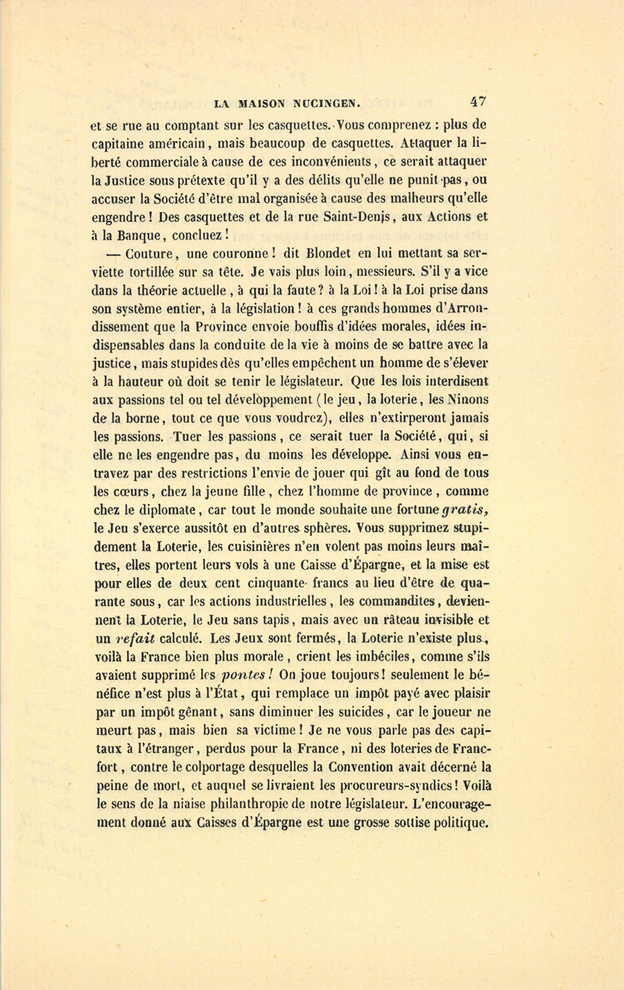 – Couture, une couronne ! dit Blondet en lui mettant sa serviette tortillée sur sa tête. Je vais plus loin, messieurs. S’il y a vice dans la théorie actuelle, à qui la faute ? à la Loi ! à la Loi prise dans son système entier, à la législation ! à ces grands hommes d’Arrondissement que la Province envoie bouffis d’idées morales, idées indispensables dans la conduite de la vie à moins de se battre avec la justice, mais stupides dès qu’elles empêchent un homme de s’élever à la hauteur où doit se tenir le législateur. Que les lois interdisent aux passions tel ou tel développement (le jeu, la loterie, les Ninons de la borne, tout ce que vous voudrez), elles n’extirperont jamais les passions. Tuer les passions, ce serait tuer la Société, qui, si elle ne les engendre pas, du moins les développe. Ainsi vous entravez par des restrictions l’envie de jouer qui gît au fond de tous les cœurs, chez la jeune fille, chez l’homme de province, comme chez le diplomate, car tout le monde souhaite une fortune gratis, le Jeu s’exerce aussitôt en d’autres sphères. Vous supprimez stupidement la Loterie, les cuisinières n’en volent pas moins leurs maîtres, elles portent leurs vols à une Caisse d’Épargne, et la mise est pour elles de deux cent cinquante francs au lieu d’être de quarante sous, car les actions industrielles, les commandites, deviennent la Loterie, le Jeu sans tapis, mais avec un râteau invisible et un refait calculé. Les Jeux sont fermés, la Loterie n’existe plus, voilà la France bien plus morale, crient les imbéciles, comme s’ils avaient supprimé les pontes ! On joue toujours ! seulement le bénéfice n’est plus à l’État, qui remplace un impôt payé avec plaisir par un impôt gênant, sans diminuer les suicides, car le joueur ne meurt pas, mais bien sa victime ! Je ne vous parle pas des capitaux à l’étranger, perdus pour la France, ni des loteries de Francfort, contre le colportage desquelles la Convention avait décerné la peine de mort, et auquel se livraient les procureurs-syndics ! Voilà le sens de la niaise philanthropie de notre législateur. L’encouragement donné aux Caisses d’Épargne est une grosse sottise politique. {p. 48} Supposez une inquiétude quelconque sur la marche des affaires, le gouvernement aura créé la queue de l’argent, comme on a créé dans la Révolution la queue du pain. Autant de caisses, autant d’émeutes. Si dans un coin trois gamins arborent un seul drapeau, voilà une révolution. Mais ce danger, quelque grand qu’il puisse être, me semble encore moindre que celui de la démoralisation du peuple. Une caisse d’épargne est l’inoculation des vices engendrés par l’intérêt à des gens que ni l’éducation ni le raisonnement ne retiennent dans leurs combinaisons tacitement criminelles. Et voilà les effets de la philanthropie. Un grand politique doit être un scélérat abstrait, sans quoi les Sociétés sont mal menées. Un politique honnête homme est une machine à vapeur qui sentirait, ou un pilote qui ferait l’amour en tenant la barre : le bateau sombre. Un premier ministre qui prend cent millions et qui rend la France grande et heureuse, n’est-il pas préférable à un ministre enterré aux frais de l’État, mais qui a ruiné son pays ? Entre Richelieu, Mazarin, Potemkin, riches tous trois à chaque époque de trois cents millions, et le vertueux Robert Lindet qui n’a su tirer parti ni des assignats, ni des Biens Nationaux, ou les vertueux imbéciles qui ont perdu Louis XVI, hésiteriez-vous ? Va ton train, Bixiou.