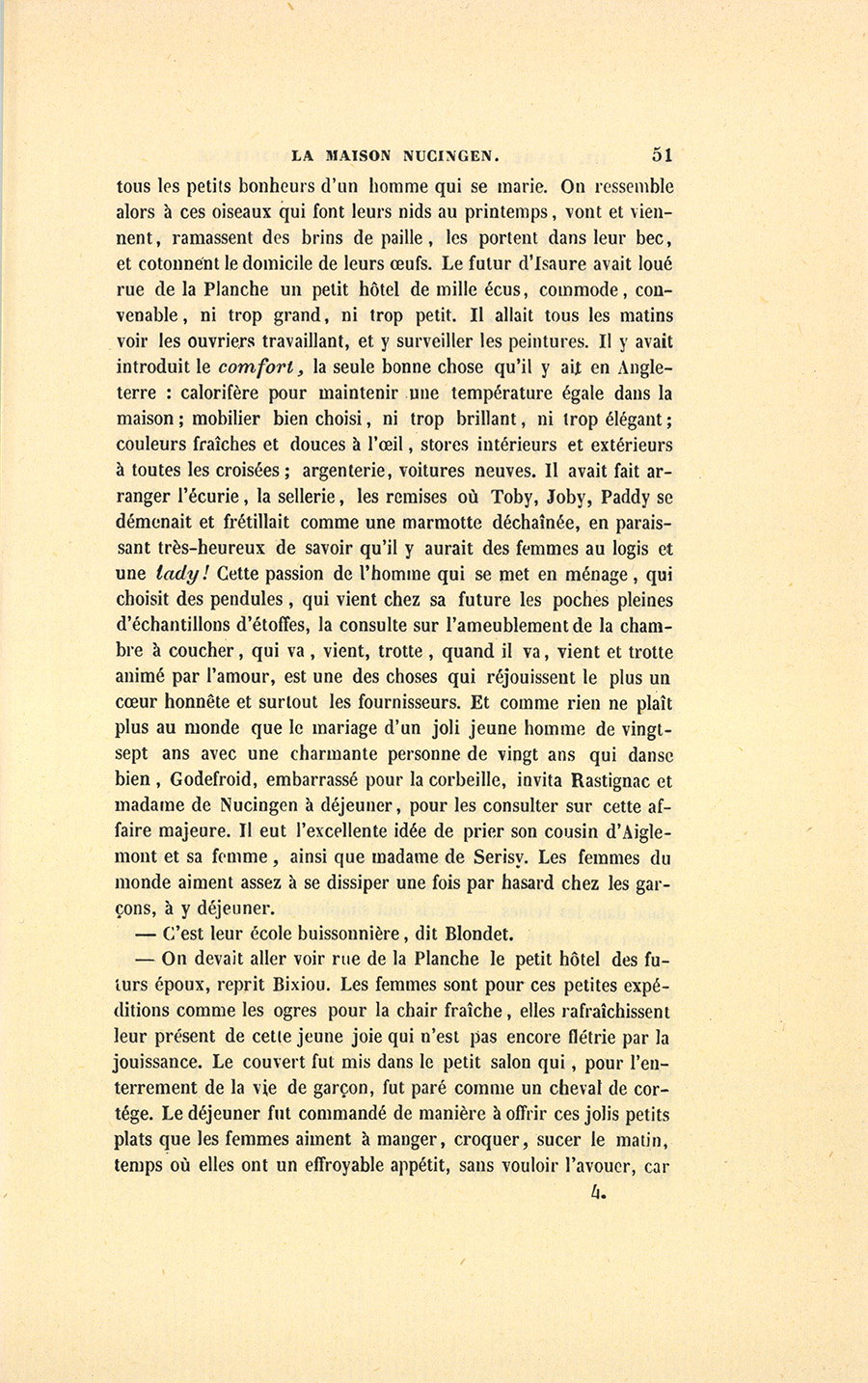 – Ah ! je ne marivaude donc plus, dit Bixiou jouissant de son succès et regardant ses auditeurs surpris. – Depuis deux mois, reprit-il après cette interruption, Godefroid se livrait à {p. 51} tous les petits bonheurs d’un homme qui se marie. On ressemble alors à ces oiseaux qui font leurs nids au printemps, vont et viennent, ramassent des brins de paille, les portent dans leur bec, et cotonnent le domicile de leurs œufs. Le futur d’Isaure avait loué rue de la Planche un petit hôtel de mille écus, commode, convenable, ni trop grand, ni trop petit. Il allait tous les matins voir les ouvriers travaillant, et y surveiller les peintures. Il y avait introduit le comfort, la seule bonne chose qu’il y ait en Angleterre : calorifère pour maintenir une température égale dans la maison ; mobilier bien choisi, ni trop brillant, ni trop élégant ; couleurs fraîches et douces à l’œil, stores intérieurs et extérieurs à toutes les croisées ; argenterie, voitures neuves. Il avait fait arranger l’écurie, la sellerie, les remises où Toby, Joby, Paddy se démenait et frétillait comme une marmotte déchaînée, en paraissant très-heureux de savoir qu’il y aurait des femmes au logis et une lady ! Cette passion de l’homme qui se met en ménage, qui choisit des pendules, qui vient chez sa future les poches pleines d’échantillons d’étoffes, la consulte sur l’ameublement de la chambre à coucher, qui va, vient, trotte, quand il va, vient et trotte animé par l’amour, est une des choses qui réjouissent le plus un cœur honnête et surtout les fournisseurs. Et comme rien ne plaît plus au monde que le mariage d’un joli jeune homme de vingt-sept ans avec une charmante personne de vingt ans qui danse bien, Godefroid, embarrassé pour la corbeille, invita Rastignac et madame de Nucingen à déjeuner, pour les consulter sur cette affaire majeure. Il eut l’excellente idée de prier son cousin d’Aiglemont et sa femme, ainsi que madame de Serisy. Les femmes du monde aiment assez à se dissiper une fois par hasard chez les garçons, à y déjeuner.