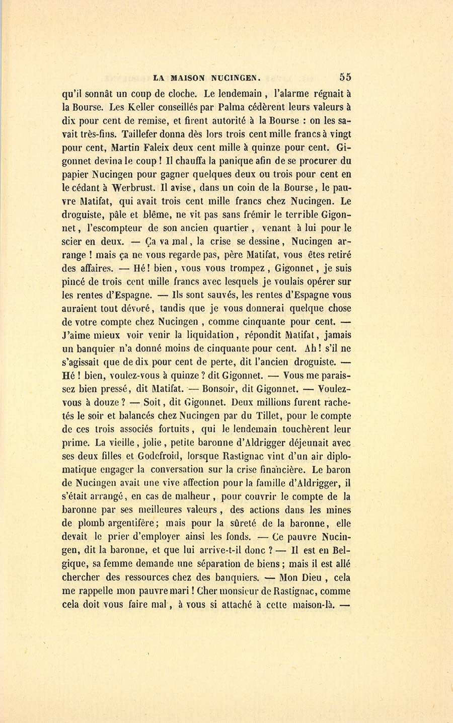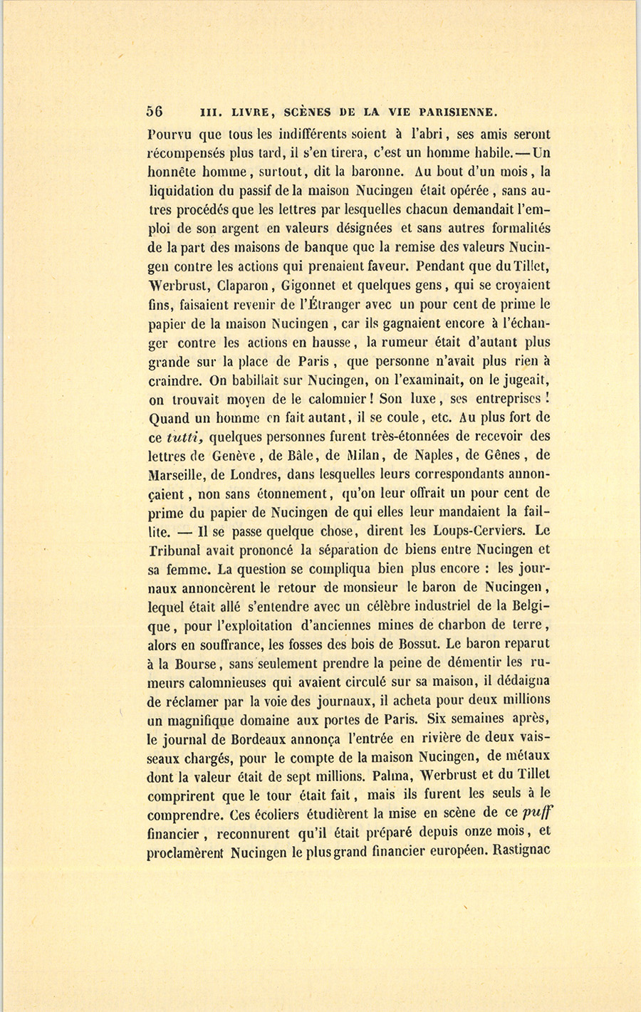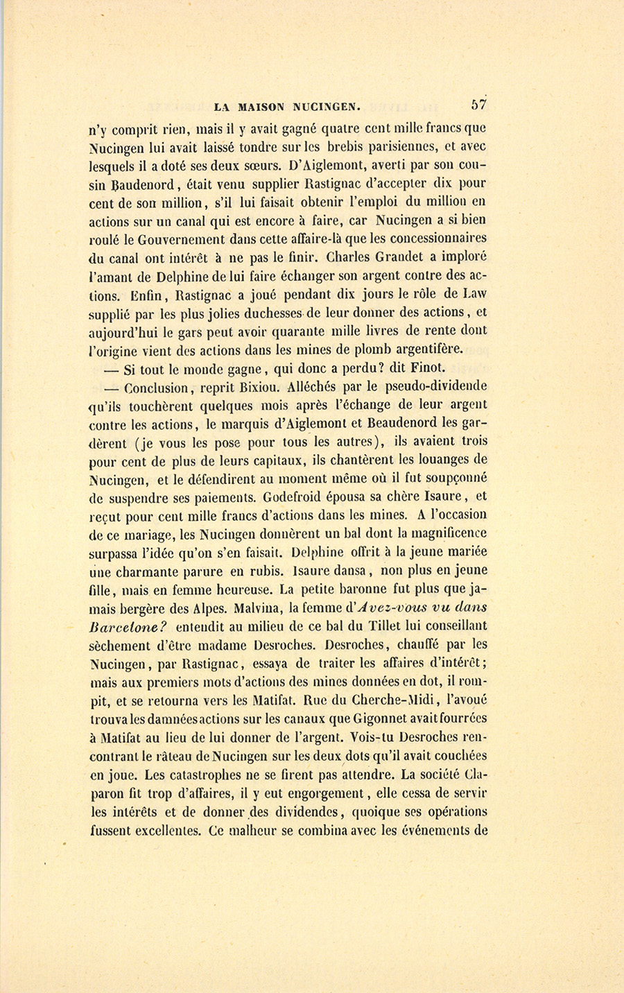 – La mise en scène d’une machine si vaste, reprit Bixiou, exigeait bien des polichinelles. D’abord la maison Nucingen avait sciemment et à dessein employé ses cinq millions dans une affaire en Amérique, dont les profits avaient été calculés de manière à revenir trop tard. Elle s’était dégarnie avec préméditation. Toute {p. 41} liquidation doit être motivée. La maison possédait en fonds particuliers et en valeurs émises environ six millions. Parmi les fonds particuliers se trouvaient les trois cent mille de la baronne d’Aldrigger, les quatre cent mille de Beaudenord, un million à d’Aiglemont, trois cent mille à Matifat, un demi-million à Charles Grandet, le mari de mademoiselle d’Aubrion, etc. En créant lui-même une entreprise industrielle par actions, avec lesquelles il se proposait de désintéresser ses créanciers au moyen de manœuvres plus ou moins habiles, Nucingen aurait pu être suspecté, mais il s’y prit avec plus de finesse : il fit créer par un autre !… cette machine destinée à jouer le rôle du Mississipi du système de Law. Le propre de Nucingen est de faire servir les plus habiles gens de la place à ses projets, sans les leur communiquer. Nucingen laissa donc échapper devant du Tillet l’idée pyramidale et victorieuse de combiner une entreprise par actions en constituant un capital assez fort pour pouvoir servir de très-gros intérêts aux actionnaires pendant les premiers temps. Essayée pour la première fois, en un moment où des capitaux niais abondaient, cette combinaison devait produire une hausse sur les actions, et par conséquent un bénéfice pour le banquier qui les émettrait. Songez que ceci est du 1826. Quoique frappé de cette idée, aussi féconde qu’ingénieuse, du Tillet pensa naturellement que si l’entreprise ne réussissait pas, il y aurait un blâme quelconque. Aussi suggéra-t-il de mettre en avant un directeur visible de cette machine commerciale. Vous connaissez aujourd’hui le secret de la maison Claparon fondée par du Tillet, une de ses plus belles inventions !…