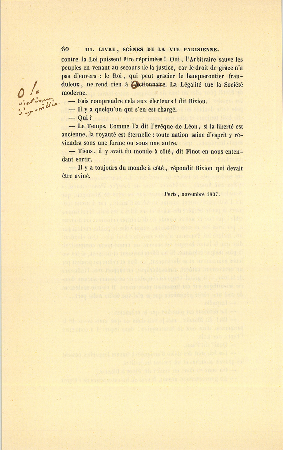 – Ah ! dit Bixiou, bravo, Blondet ! tu as mis le doigt sur la plaie de la France, la Fiscalité qui a plus ôté de conquêtes à notre pays que les vexations de la guerre. Dans le Ministère où j’ai fait sept ans de galères, accouplé avec des bourgeois, il y avait un employé, homme de talent, qui avait résolu de changer tout le système des finances… ah ! bien, nous l’avons joliment dégommé. La France eût été trop heureuse, elle se serait amusée à reconquérir l’Europe, et nous avons agi pour le repos des nations. J’ai tué ce Rabourdin par une caricature ! (voir Les Employés).