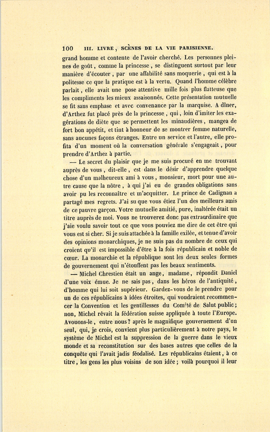 La comtesse de Montcornet vint avec Blondet. Rastignac amena d’Arthez. La princesse ne fit à l’homme célèbre aucun de ces compliments dont l’accablaient les gens vulgaires ; mais elle eut de ces prévenances empreintes de grâce et de respect qui devaient être le dernier terme de ses concessions. Elle était sans doute ainsi avec le roi de France, avec les princes. Elle parut heureuse de voir ce {p. 100} grand homme et contente de l’avoir cherché. Les personnes pleines de goût, comme la princesse, se distinguent surtout par leur manière d’écouter, par une affabilité sans moquerie, qui est à la politesse ce que la pratique est à la vertu. Quand l’homme célèbre parlait, elle avait une pose attentive mille fois plus flatteuse que les compliments les mieux assaisonnés. Cette présentation mutuelle se fit sans emphase et avec convenance par la marquise. À dîner, d’Arthez fut placé près de la princesse, qui, loin d’imiter les exagérations de diète que se permettent les minaudières, mangea de fort bon appétit, et tint à honneur de se montrer femme naturelle, sans aucunes façons étranges. Entre un service et l’autre, elle profita d’un moment où la conversation générale s’engageait, pour prendre d’Arthez à partie.