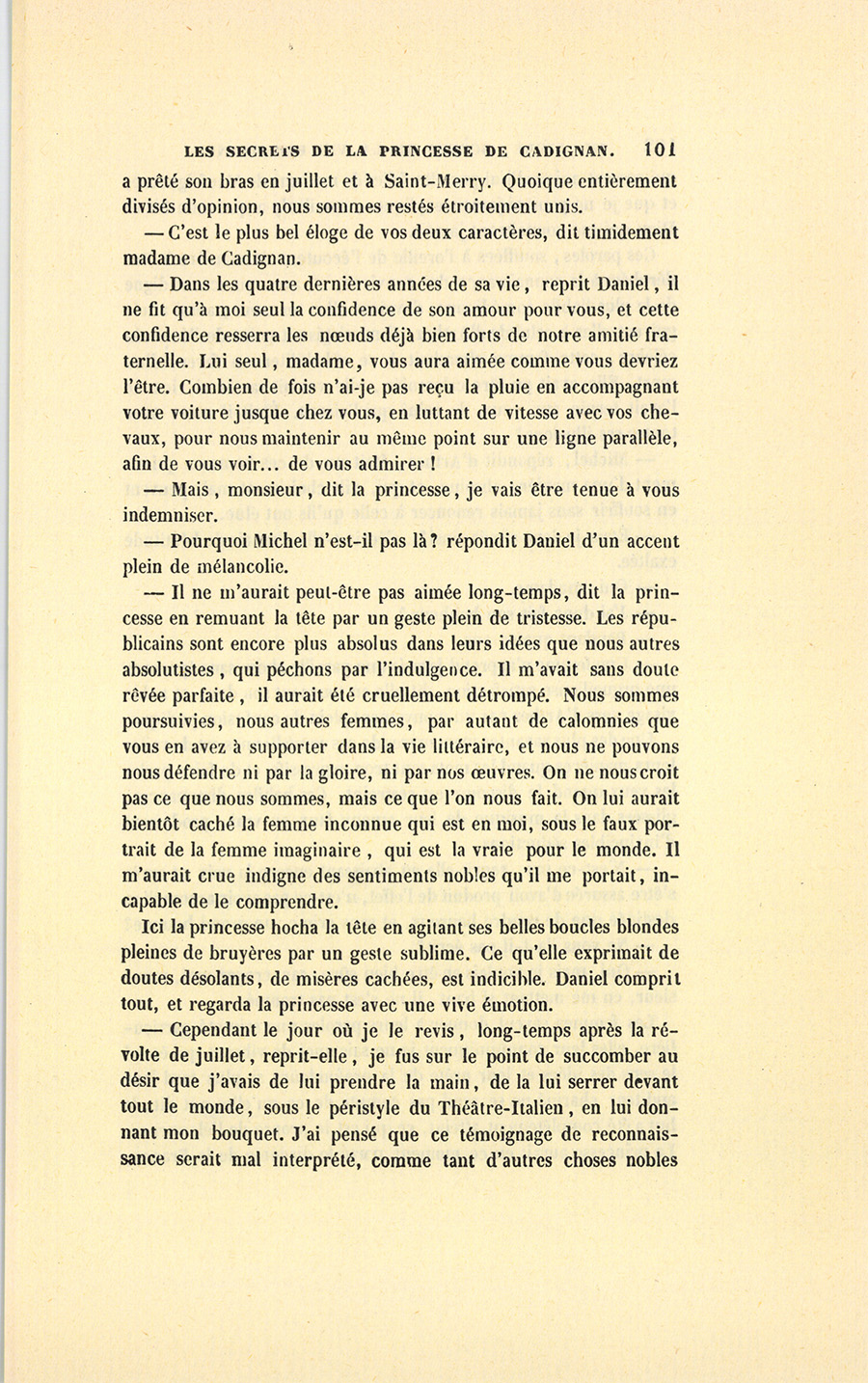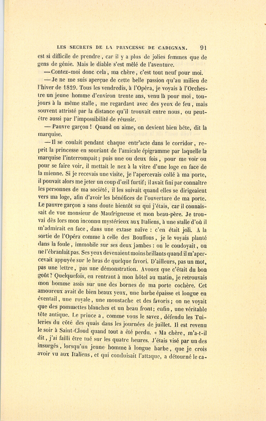 – Il se coulait pendant chaque entr’acte dans le corridor, reprit la princesse en souriant de l’amicale épigramme par laquelle la marquise l’interrompait ; puis une ou deux fois, pour me voir ou pour se faire voir, il mettait le nez à la vitre d’une loge en face de la mienne. Si je recevais une visite, je l’apercevais collé à ma porte, il pouvait alors me jeter un coup d’œil furtif ; il avait fini par connaître les personnes de ma société, il les suivait quand elles se dirigeaient vers ma loge, afin d’avoir les bénéfices de l’ouverture de ma porte. Le pauvre garçon a sans doute bientôt su qui j’étais, car il connaissait de vue monsieur de Maufrigneuse et mon beau-père. Je trouvai dès lors mon inconnu mystérieux aux Italiens, à une stalle d’où il m’admirait en face, dans une extase naïve : c’en était joli. À la sortie de l’Opéra comme à celle des Bouffons, je le voyais planté dans la foule, immobile sur ses deux jambes : on le coudoyait, on ne l’ébranlait pas. Ses yeux devenaient moins brillants quand il m’apercevait appuyée sur le bras de quelque favori. D’ailleurs, pas un mot, pas une lettre, pas une démonstration. Avouez que c’était du bon goût ? Quelquefois, en rentrant à mon hôtel au matin, je retrouvais mon homme assis sur une des bornes de ma porte cochère. Cet amoureux avait de bien beaux yeux, une barbe épaisse et longue en éventail, une royale, une moustache et des favoris ; on ne voyait que des pommettes blanches et un beau front ; enfin, une véritable tête antique. Le prince a, comme vous le savez, défendu les Tuileries du côté des quais dans les journées de juillet. Il est revenu le soir à Saint-Cloud quand tout a été perdu. « Ma chère, m’a-t-il dit, j’ai failli être tué sur les quatre heures. J’étais visé par un des insurgés, lorsqu’un jeune homme à longue barbe, que je crois avoir vu aux Italiens, et qui conduisait l’attaque, a détourné le {p. 92} canon du fusil. » Le coup a frappé je ne sais quel homme, un maréchal-des-logis4 du régiment, et qui était à deux pas de mon mari. Ce jeune homme devait donc être un républicain. En 1831, quand je suis revenue me loger ici, je l’ai rencontré le dos appuyé au mur de cette maison ; il paraissait joyeux de mes désastres, qui peut-être lui semblaient nous rapprocher ; mais, depuis les affaires de Saint-Merry, je ne l’ai plus revu : il y a péri. La veille des funérailles du général Lamarque, je suis sortie à pied avec mon fils, et mon républicain nous a suivis, tantôt derrière, tantôt devant nous, depuis la Madeleine jusqu’au passage des Panoramas où j’allais.