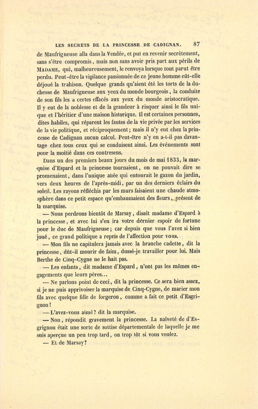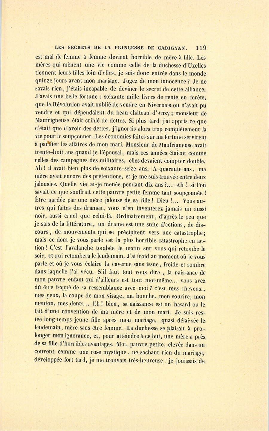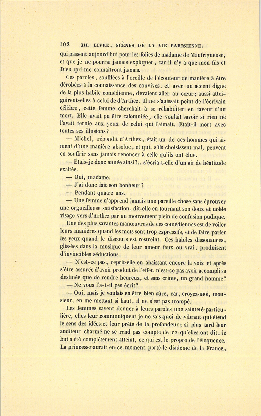 – Cependant le jour où je le revis, long-temps après la révolte de juillet, reprit-elle, je fus sur le point de succomber au désir que j’avais de lui prendre la main, de la lui serrer devant tout le monde, sous le péristyle du Théâtre-Italien, en lui donnant mon bouquet. J’ai pensé que ce témoignage de reconnaissance serait mal interprété, comme tant d’autres choses nobles {p. 102} qui passent aujourd’hui pour les folies de madame de Maufrigneuse, et que je ne pourrai jamais expliquer, car il n’y a que mon fils et Dieu qui me connaîtront jamais.