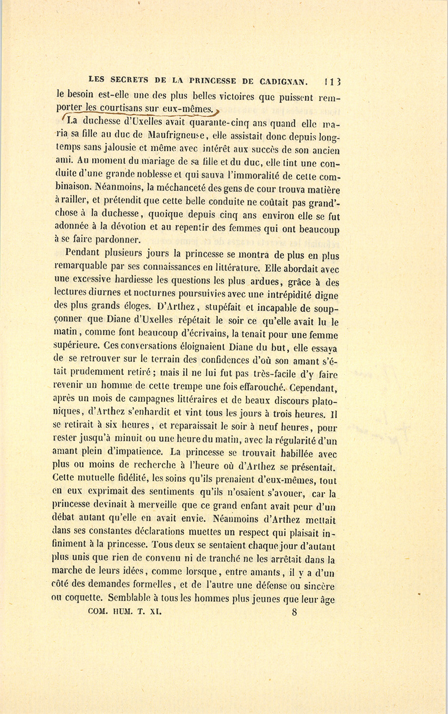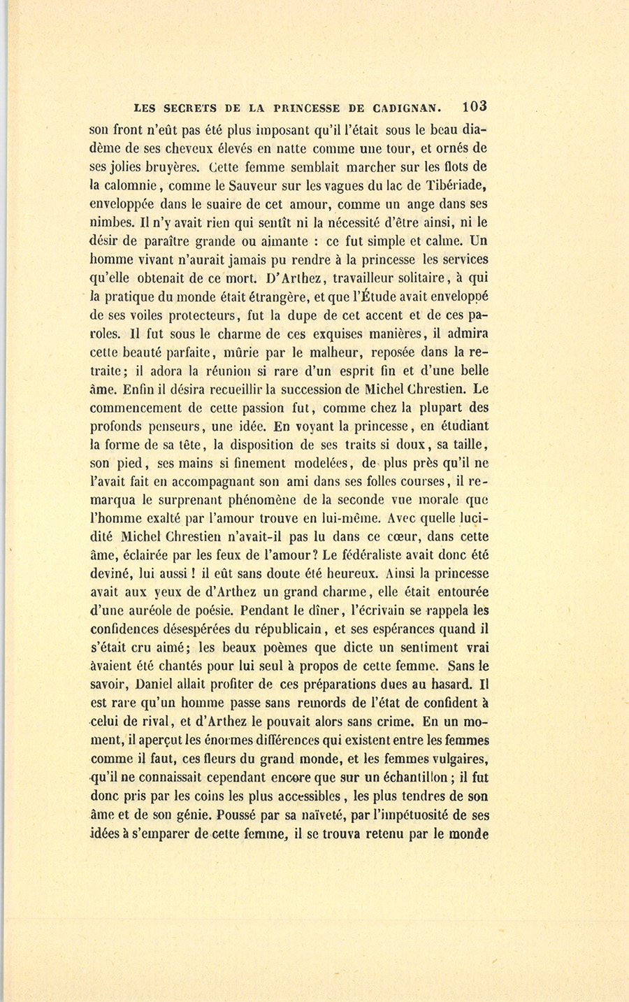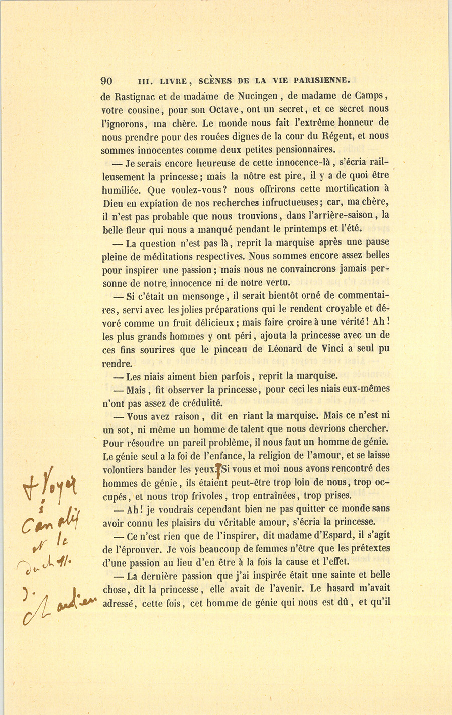 – La dernière passion que j’ai inspirée était une sainte et belle chose, dit la princesse, elle avait de l’avenir. Le hasard m’avait adressé, cette fois, cet homme de génie qui nous est dû, et qu’il {p. 91} est si difficile de prendre, car il y a plus de jolies femmes que de gens de génie. Mais le diable s’est mêlé de l’aventure.