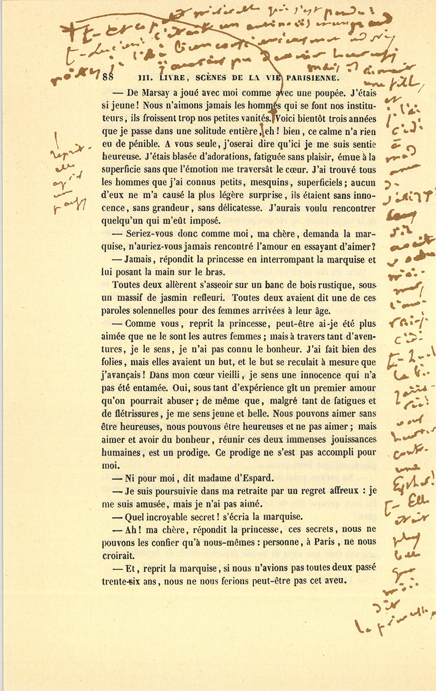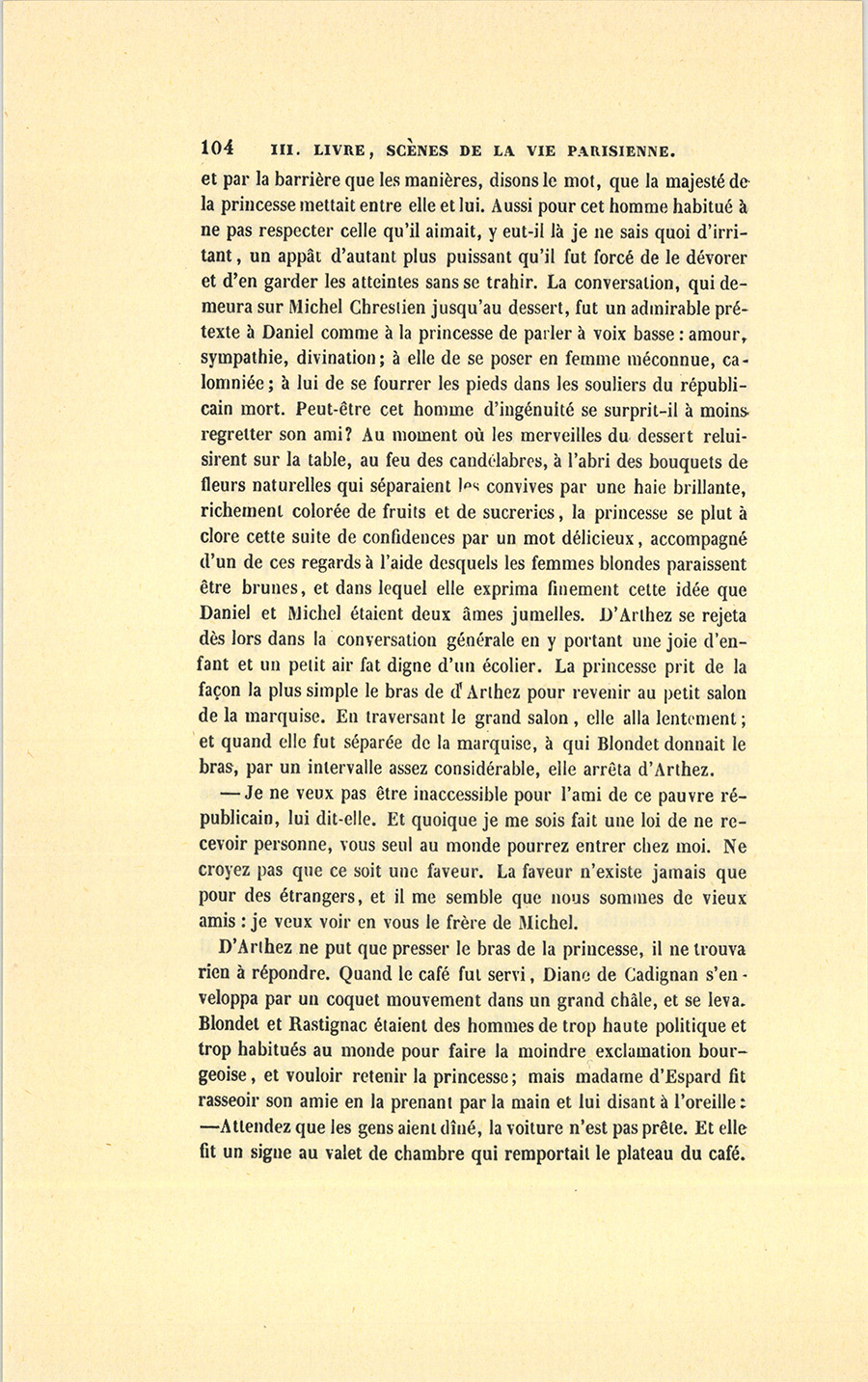 Quand d’Arthez fut dans la rue, il se demanda s’il n’aurait pas dû être moins respectueux. Il repassa dans sa mémoire ces étranges confidences qui naturellement ont été fort abrégées ici, elles auraient voulu tout un livre pour être rendues dans leur abondance melliflue et avec les façons dont elles furent accompagnées. La perspicacité rétrospective de cet homme si naturel et si profond fut mise en défaut par le naturel de ce roman, par sa profondeur, par l’accent de la princesse.