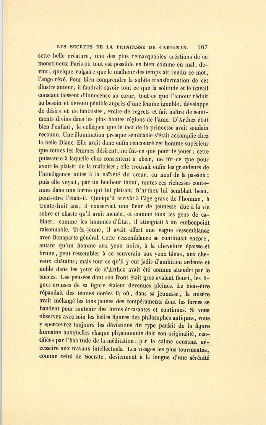 D’Arthez laissa l’amour pénétrer dans son cœur à la manière de notre oncle Tobie, sans faire la moindre résistance, il procéda par l’adoration sans critique, par l’admiration exclusive. La princesse, {p. 107} cette belle créature, une des plus remarquables créations de ce monstrueux Paris où tout est possible en bien comme en mal, devint, quelque vulgaire que le malheur des temps ait rendu ce mot, l’ange rêvé. Pour bien comprendre la subite transformation de cet illustre auteur, il faudrait savoir tout ce que la solitude et le travail constant laissent d’innocence au cœur, tout ce que l’amour réduit au besoin et devenu pénible auprès d’une femme ignoble, développe de désirs et de fantaisies, excite de regrets et fait naître de sentiments divins dans les plus hautes régions de l’âme. D’Arthez était bien l’enfant, le collégien que le tact de la princesse avait soudain reconnu. Une illumination presque semblable s’était accomplie chez la belle Diane. Elle avait donc enfin rencontré cet homme supérieur que toutes les femmes désirent, ne fût-ce que pour le jouer ; cette puissance à laquelle elles consentent à obéir, ne fût-ce que pour avoir le plaisir de la maîtriser ; elle trouvait enfin les grandeurs de l’intelligence unies à la naïveté du cœur, au neuf de la passion ; puis elle voyait, par un bonheur inouï, toutes ces richesses contenues dans une forme qui lui plaisait. D’Arthez lui semblait beau, peut-être l’était-il. Quoiqu’il arrivât à l’âge grave de l’homme, à trente-huit ans, il conservait une fleur de jeunesse due à la vie sobre et chaste qu’il avait menée, et comme tous les gens de cabinet, comme les hommes d’État, il atteignait à un embonpoint raisonnable. Très-jeune, il avait offert une vague ressemblance avec Bonaparte général. Cette ressemblance se continuait encore, autant qu’un homme aux yeux noirs, à la chevelure épaisse et brune, peut ressembler à ce souverain aux yeux bleus, aux cheveux châtains ; mais tout ce qu’il y eut jadis d’ambition ardente et noble dans les yeux de d’Arthez avait été comme attendri par le succès. Les pensées dont son front était gros avaient fleuri, les lignes creuses de sa figure étaient devenues pleines. Le bien-être répandait des teintes dorées là où, dans sa jeunesse, la misère avait mélangé les tons jaunes des tempéraments dont les forces se bandent pour soutenir des luttes écrasantes et continues. Si vous observez avec soin les belles figures des philosophes antiques, vous y apercevrez toujours les déviations du type parfait de la figure humaine auxquelles chaque physionomie doit son originalité, rectifiées par l’habitude de la méditation, par le calme constant nécessaire aux travaux intellectuels. Les visages les plus tourmentés, comme celui de Socrate, deviennent à la longue d’une sérénité {p. 108} presque divine. À cette noble simplicité qui décorait sa tête impériale, d’Arthez joignait une expression naïve, le naturel des enfants, et une bienveillance touchante. Il n’avait pas cette politesse toujours empreinte de fausseté par laquelle dans ce monde les personnes les mieux élevées et les plus aimables jouent des qualités qui souvent leur manquent, et qui laissent blessés ceux qui se reconnaissent dupés. Il pouvait faillir à quelques lois mondaines par suite de son isolement ; mais comme il ne choquait jamais, ce parfum de sauvagerie rendait encore plus gracieuse l’affabilité particulière aux hommes d’un grand talent, qui savent déposer leur supériorité chez eux pour se mettre au niveau social, pour, à la façon d’Henri IV, prêter leur dos aux enfants, et leur esprit aux niais.