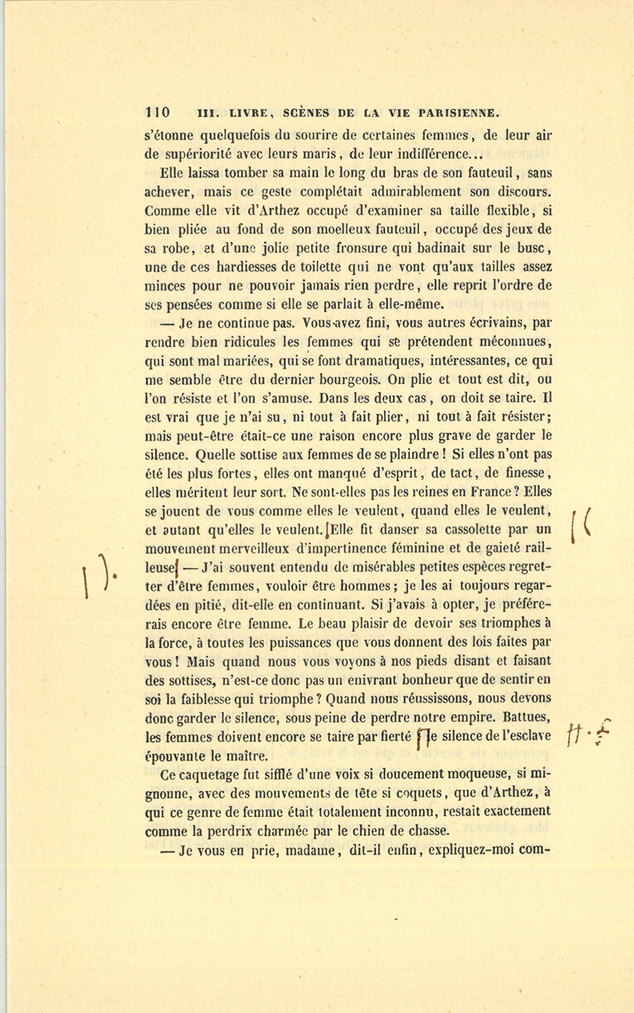 – Mais, dit d’Arthez avec une moqueuse légèreté, madame la princesse de Cadignan a sur les hommes un avantage : quand on s’est mis en danger pour elle, elle vous sauve, et ne dit de mal de personne. Pourquoi, dans le nombre, ne se trouverait-il pas une femme qui s’amusât des hommes, comme les hommes s’amusent des femmes ? Pourquoi le beau sexe ne prendrait-il pas de temps en temps une revanche ?…