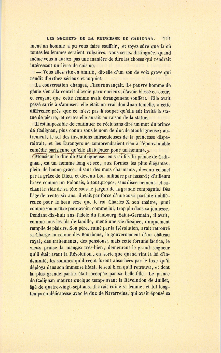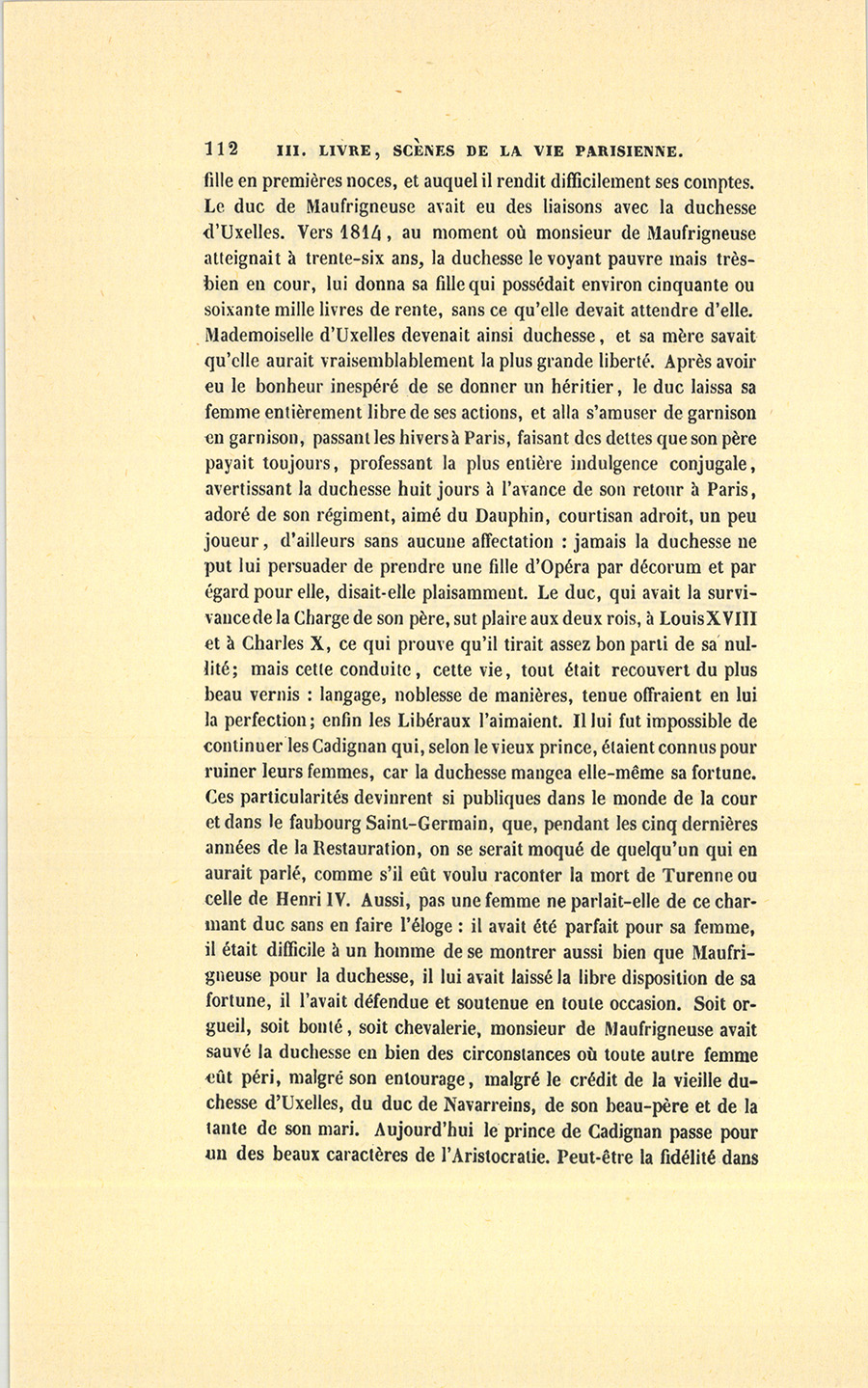 Il est impossible de continuer ce récit sans dire un mot du prince de Cadignan, plus connu sous le nom de duc de Maufrigneuse ; autrement, le sel des inventions miraculeuses de la princesse disparaîtrait, et les Étrangers ne comprendraient rien à l’épouvantable comédie parisienne qu’elle allait jouer pour un homme. Monsieur le duc de Maufrigneuse, en vrai fils du prince de Cadignan, est un homme long et sec, aux formes les plus élégantes, plein de bonne grâce, disant des mots charmants, devenu colonel par la grâce de Dieu, et devenu bon militaire par hasard ; d’ailleurs brave comme un Polonais, à tout propos, sans discernement, et cachant le vide de sa tête sous le jargon de la grande compagnie. Dès l’âge de trente-six ans, il était par force d’une aussi parfaite indifférence pour le beau sexe que le roi Charles X son maître ; puni comme son maître pour avoir, comme lui, trop plu dans sa jeunesse. Pendant dix-huit ans l’idole du faubourg Saint-Germain, il avait, comme tous les fils de famille, mené une vie dissipée, uniquement remplie de plaisirs. Son père, ruiné par la Révolution, avait retrouvé sa Charge au retour des Bourbons, le gouvernement d’un château royal, des traitements, des pensions ; mais cette fortune factice, le vieux prince la mangea très-bien, demeurant le grand seigneur qu’il était avant la Révolution, en sorte que quand vint la loi d’indemnité, les sommes qu’il reçut furent absorbées par le luxe qu’il déploya dans son immense hôtel, le seul bien qu’il retrouva, et dont la plus grande partie était occupée par sa belle-fille. Le prince de Cadignan mourut quelque temps avant la Révolution de Juillet, âgé de quatre-vingt-sept ans. Il avait ruiné sa femme, et fut longtemps en délicatesse avec le duc de Navarreins, qui avait épousé sa {p. 112} fille en premières noces, et auquel il rendit difficilement ses comptes. Le duc de Maufrigneuse avait eu des liaisons avec la duchesse d’Uxelles. Vers 1814, au moment où monsieur de Maufrigneuse atteignait à trente-six ans, la duchesse le voyant pauvre mais très-bien en cour, lui donna sa fille qui possédait environ cinquante ou soixante mille livres de rente, sans ce qu’elle devait attendre d’elle. Mademoiselle d’Uxelles devenait ainsi duchesse, et sa mère savait qu’elle aurait vraisemblablement la plus grande liberté. Après avoir eu le bonheur inespéré de se donner un héritier, le duc laissa sa femme entièrement libre de ses actions, et alla s’amuser de garnison en garnison, passant les hivers à Paris, faisant des dettes que son père payait toujours, professant la plus entière indulgence conjugale, avertissant la duchesse huit jours à l’avance de son retour à Paris, adoré de son régiment, aimé du Dauphin, courtisan adroit, un peu joueur, d’ailleurs sans aucune affectation : jamais la duchesse ne put lui persuader de prendre une fille d’Opéra par décorum et par égard pour elle, disait-elle plaisamment. Le duc, qui avait la survivance de la Charge de son père, sut plaire aux deux rois, à Louis XVIII et à Charles X, ce qui prouve qu’il tirait assez bon parti de sa nullité ; mais cette conduite, cette vie, tout était recouvert du plus beau vernis : langage, noblesse de manières, tenue offraient en lui la perfection ; enfin les Libéraux l’aimaient. Il lui fut impossible de continuer les Cadignan qui, selon le vieux prince, étaient connus pour ruiner leurs femmes, car la duchesse mangea elle-même sa fortune. Ces particularités devinrent si publiques dans le monde de la cour et dans le faubourg Saint-Germain, que, pendant les cinq dernières années de la Restauration, on se serait moqué de quelqu’un qui en aurait parlé, comme s’il eût voulu raconter la mort de Turenne ou celle de Henri IV. Aussi, pas une femme ne parlait-elle de ce charmant duc sans en faire l’éloge : il avait été parfait pour sa femme, il était difficile à un homme de se montrer aussi bien que Maufrigneuse pour la duchesse, il lui avait laissé la libre disposition de sa fortune, il l’avait défendue et soutenue en toute occasion. Soit orgueil, soit bonté, soit chevalerie, monsieur de Maufrigneuse avait sauvé la duchesse en bien des circonstances où toute autre femme eût péri, malgré son entourage, malgré le crédit de la vieille duchesse d’Uxelles, du duc de Navarreins, de son beau-père et de la tante de son mari. Aujourd’hui le prince de Cadignan passe pour un des beaux caractères de l’Aristocratie. Peut-être la fidélité dans {p. 113} le besoin est-elle une des plus belles victoires que puissent remporter les courtisans sur eux-mêmes. La duchesse d’Uxelles avait quarante-cinq ans quand elle maria sa fille au duc de Maufrigneuse, elle assistait donc depuis longtemps sans jalousie et même avec intérêt aux succès de son ancien ami. Au moment du mariage de sa fille et du duc, elle tint une conduite d’une grande noblesse et qui sauva l’immoralité de cette combinaison. Néanmoins, la méchanceté des gens de cour trouva matière à railler, et prétendit que cette belle conduite ne coûtait pas grand’chose à la duchesse, quoique depuis cinq ans environ elle se fut adonnée à la dévotion et au repentir des femmes qui ont beaucoup à se faire pardonner.